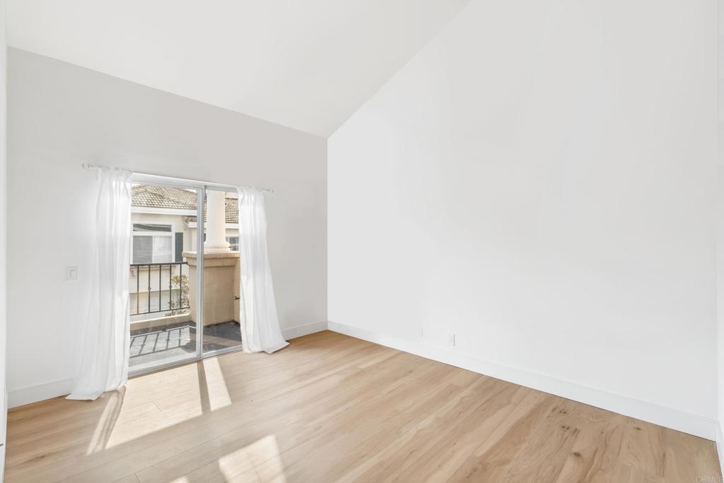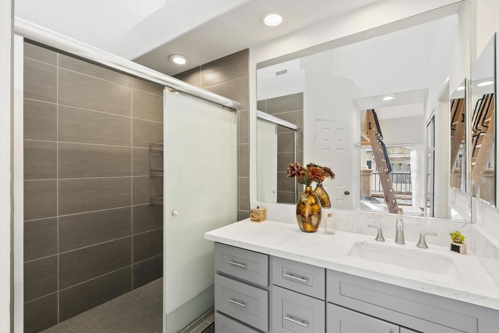 End of year opportunity to reside in Renaissance, one of the most desireable communities of University City. This is where you want to be! Walking distance to Nobel Athletic Center & Recreational park, the library, the famous UTC mall and trolley line. This upper level, END UNIT in the Capri complex has beautiful upgrades starting with the gorgeous LVP flooring from the stairway up (NO carpet throughout!) to a modern open kitchen. The high ceilings with many windows makes it feel so spacious throughout. From the instant you walk up the stairs and see the NEW designer chandelier, your main living room has a gas fireplace with the dining room adjacent offering a seamless design. The functional layout offers an open kitchen with quartz counter tops, modern bluish-grey cabinets and a roomy pantry space. In addition, the full size laundry room is conveniently in the hallway not in the garage. Both bathrooms have a classic tile surround that frames to the top and updated bath vanities. This is truly seller's lost; next buyers' gain! Capri offers plenty of guest parking and this unit is steps away from the relaxing pool and spa.