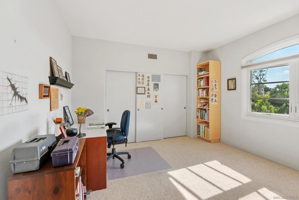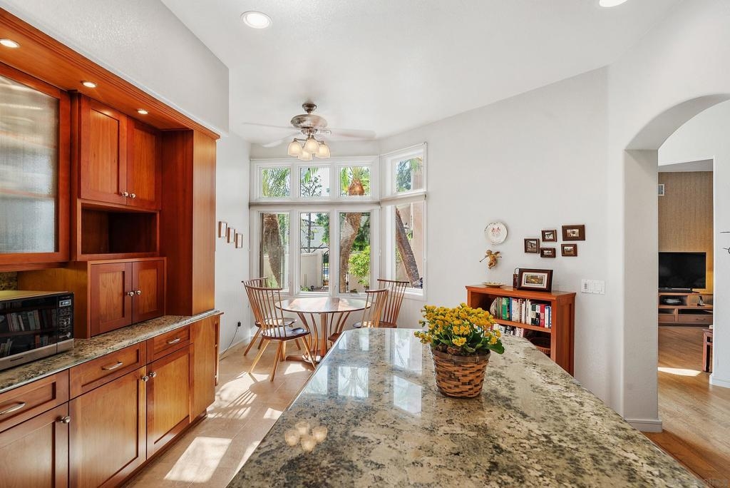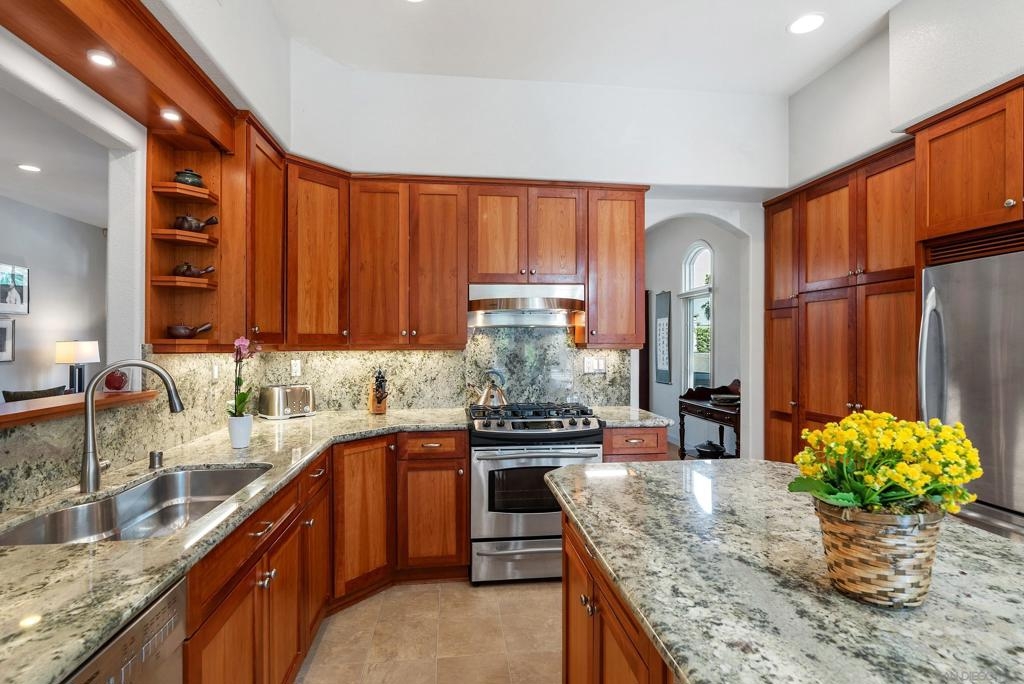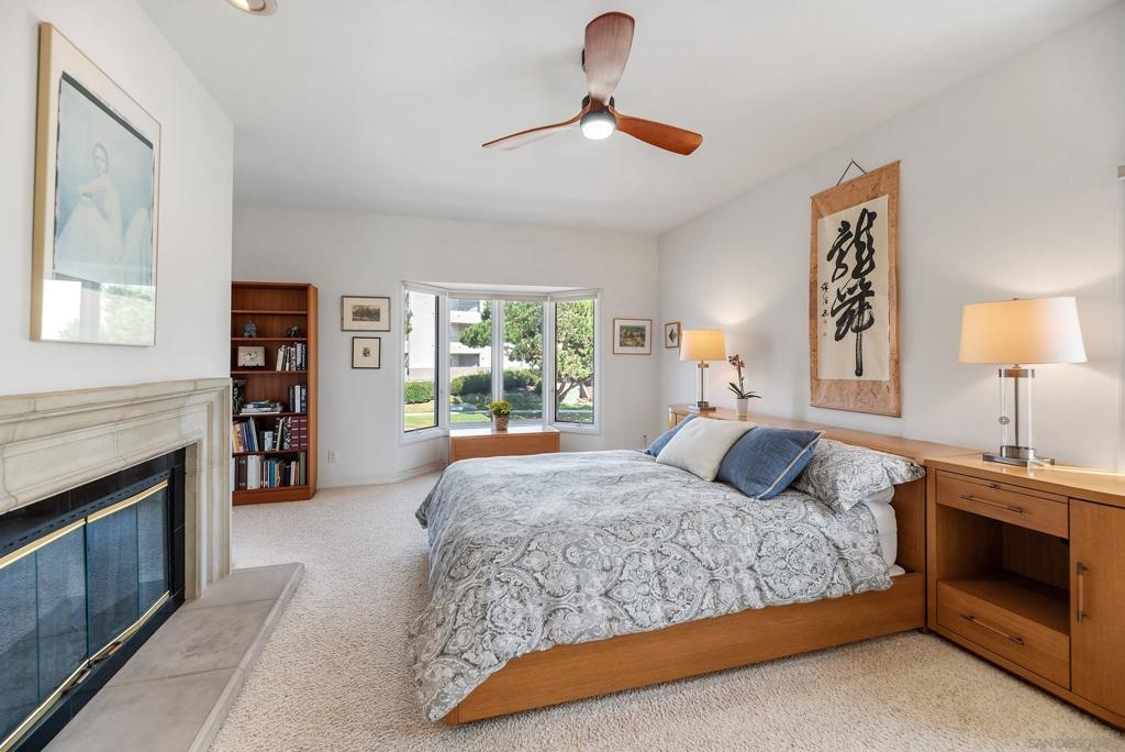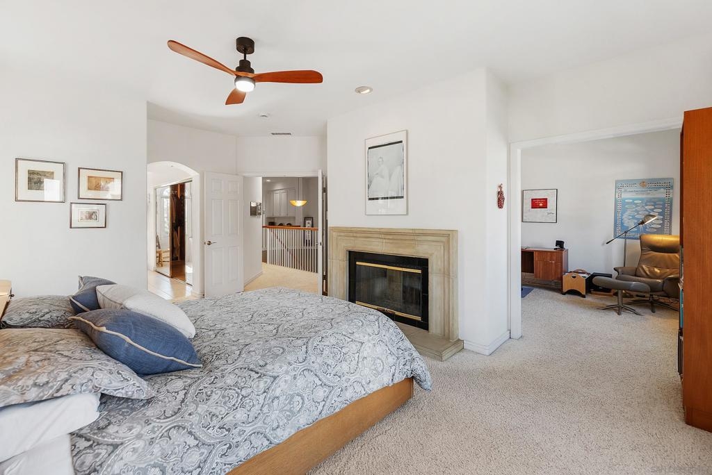 Beautifully upgraded home in gated Casabella! Stunning, well-maintained home featuring a custom-built kitchen with granite counters and a center island, high ceilings, and 3 fireplaces. Spacious primary suite with large walk-in closet and retreat (4th bedroom option—see floorplan). Rare first-floor full bath with an optional first-floor bedroom (with conversion). Upstairs laundry, generous room sizes, and an open, end location with no homes in front. Located near guest parking and the community pool/spa, and nestled in the sought-after Renaissance La Jolla community, with its ultra-convenient location and charming European village atmosphere. Stroll along lushly landscaped greenbelts, complete with serene water features, to nearby shops and restaurants. Just down the street, a 25-acre park offers sports fields, a library, dog parks, pickleball courts, and a community recreation center. The acclaimed Westfield Shopping Center is easily accessible via the park across Towne Centre Drive. It provides a premier destination for dining, shopping, and entertainment, featuring upscale restaurants, a movie theater, boutiques, and gyms. Easy freeway access. There is potential for up to 5 bedrooms—see the floor plan shown in the photos. Natural light floods the spacious interior of this elegant Casabella home, streaming through wood-cased windows and French doors, accentuating its beautiful architectural details.. The primary retreat is an optional bedroom (with conversion- see floorplan in photos). There is a potential of up to 5 bedrooms with a bedroom and full bath on the first level.—floorplan in photos.