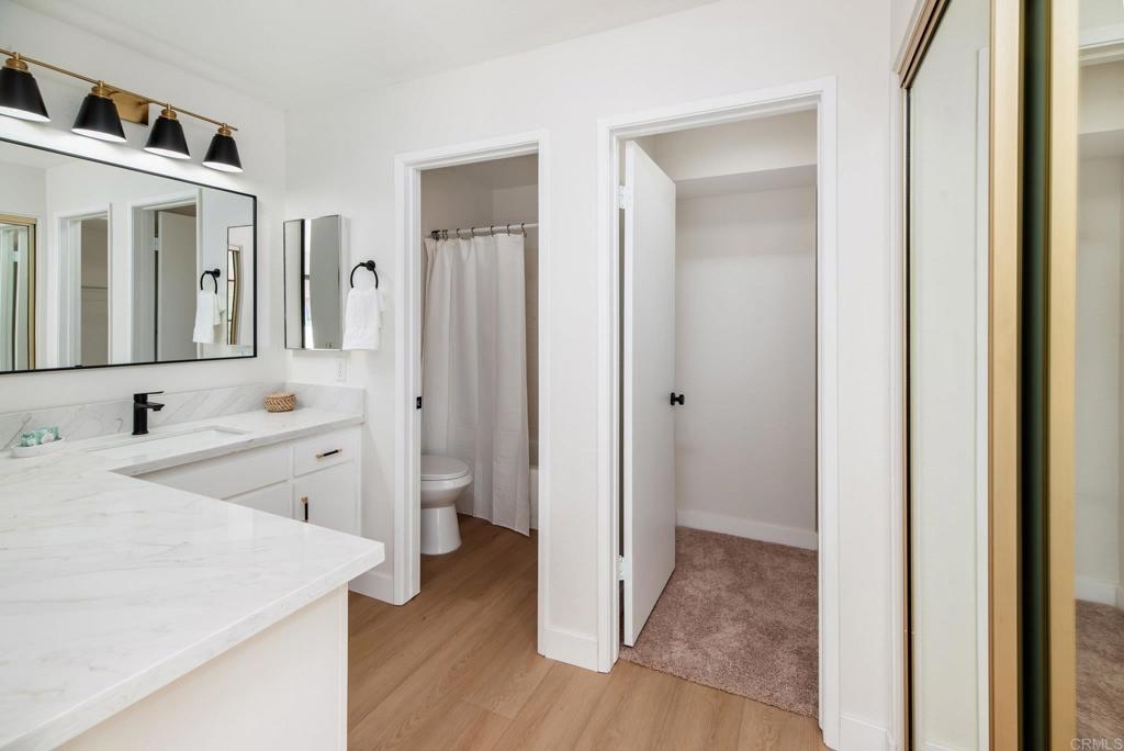 Set within the highly desirable La Jolla Village Park community, this beautifully updated end-unit residence stands out for its privacy, natural light, and exceptional outdoor space. With only one shared wall and no neighbors above, the home feels peaceful and tucked away, yet remains perfectly positioned near the heart of La Jolla and University City. Vaulted ceilings and an abundance of windows create a bright, airy atmosphere throughout, making everyday living feel both comfortable and refined. The home has been thoughtfully and extensively updated, starting with a full kitchen remodel completed in December 2025. Shaker cabinetry, quartz countertops, new appliances, and a raised ceiling with modern CAN lighting elevate the space and create a natural gathering point. Both the primary and guest bathrooms have been refreshed with quartz counters, updated fixtures, and painted cabinetry, while new LVP flooring in the main living areas, plush carpet in the bedrooms, fresh interior paint, updated lighting, and new vanity mirrors complete the move-in-ready feel. One of the home’s most unique features is its exceptional outdoor living. Enjoy two private patios wrapped in greenery, offering direct sunlight and the largest private outdoor space in the community, perfect for morning coffee, entertaining, or simply unwinding at the end of the day. Large bedrooms provide comfortable retreats, and a private one-car garage with storage sits conveniently at the base of the stairs, complemented by an additional parking located directly next to the unit. Residents of La Jolla Village Park enjoy resort-style amenities including a pool, spa, lighted tennis courts, racquetball courts, and beautifully maintained grounds. Low HOA fees cover water, sewer, trash, exterior and roof maintenance, pest control, and more, with a new roof completed in 2025 and a full exterior refresh planned for 2026. With a Walk Score of 84 and easy access to UCSD, UTC Mall, Whole Foods, Trader Joe’s, beaches, parks, hiking trails, major employers, and multiple freeways, this is a home that truly delivers on privacy, lifestyle, and location, making San Diego living feel easy.