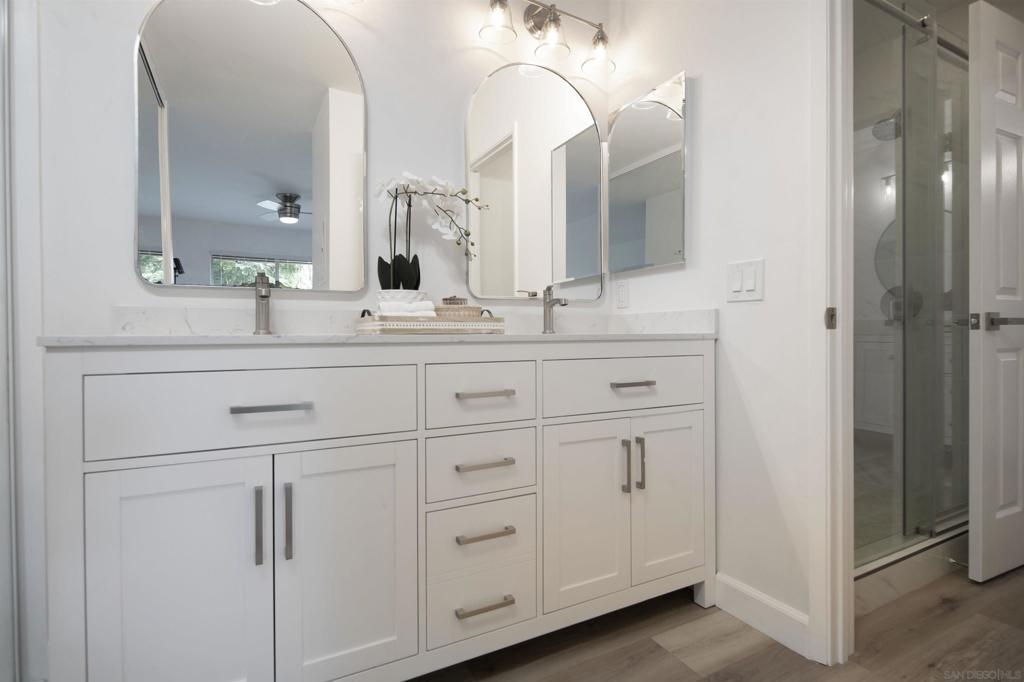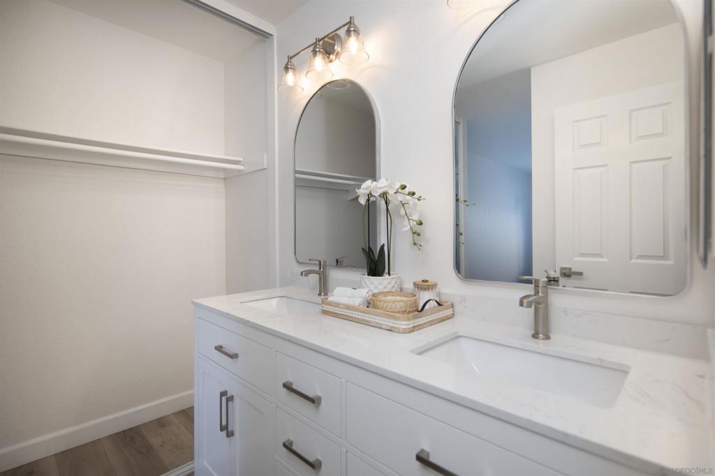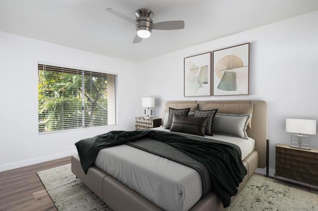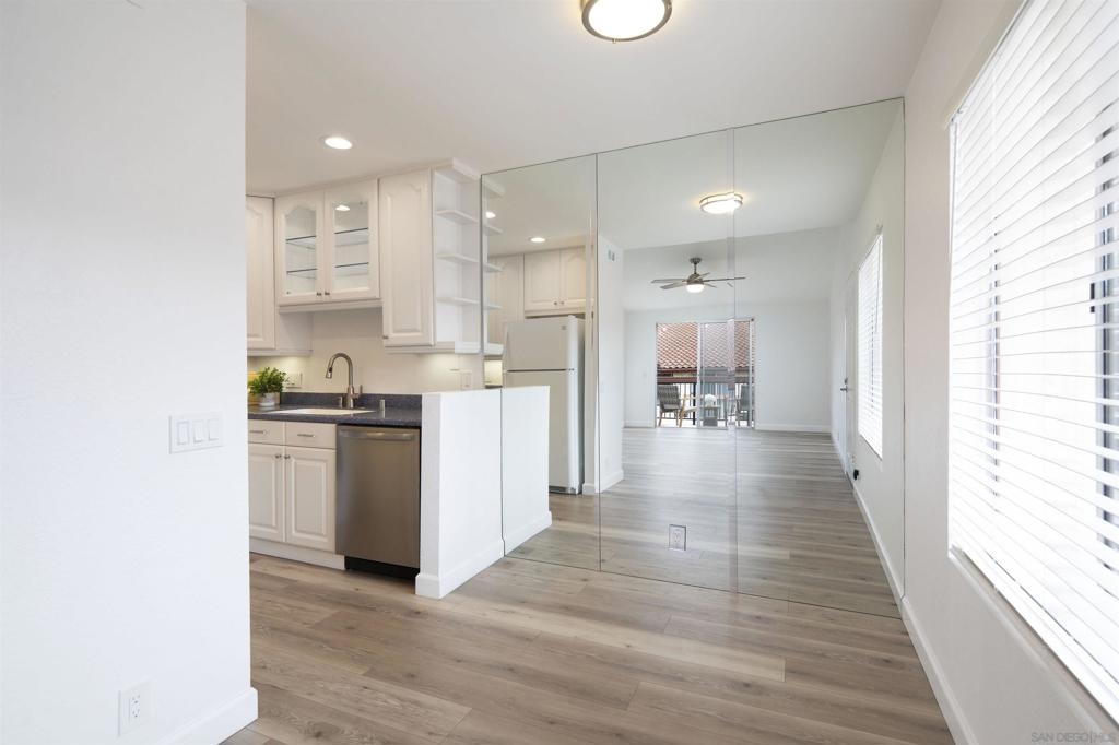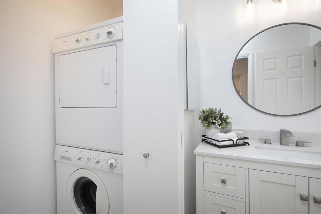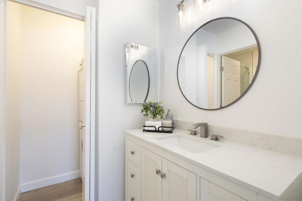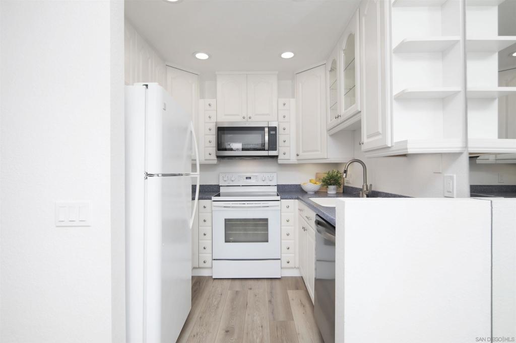 Don't miss this completely remodeled bright and sunny upstairs end unit in the very quiet La Jolla Colony La Paz community. Easy freeway access and minutes to the beach, this unit will sell fast. This stunning 2 bedroom 1 bath condo has undergone a complete transformation! No more popcorn ceilings! The condo is adorned with new flooring throughout, fresh white paint, new doors and hardware, added fans and lighting, new appliances in the kitchen, and new baseboards. The bathroom was completely upgraded with walk-in shower with elegant tile work and two new vanities.The bathroom has separate vanity area for each bedroom for added privacy. This condo offers a stylish and comfortable living environment. The balcony provides a serene setting for relaxing and the second story provides much wanted privacy. Close proximity to the community pool and spa. There are also two parking spaces under a carport with storage. This condo is move in ready!