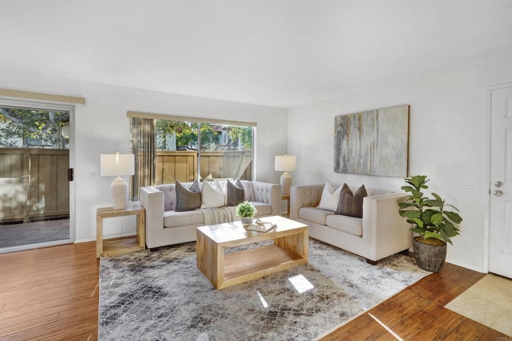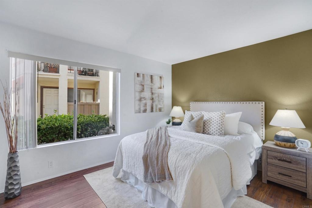 This updated end unit condo is situated in a peaceful spot within the coveted La Paz complex! Its thoughtfully designed floor plan is perfect for small families or roommates, featuring non adjoining bedrooms that provide an added layer of privacy. Enjoy the convenience of 2 covered parking spaces, an in-unit laundry closet, and a private patio perfect for relaxing outdoors. The La Paz community offers a parklike setting with sparkling pools and a relaxing spa. Conveniently located just minutes from beaches, hiking trails, a dog park, Westfield UTC, UCSD, a trolley stop, the freeway, and La Jolla Village, this home blends comfort, convenience, and a vibrant lifestyle. Refrigerator and laundry units are included!