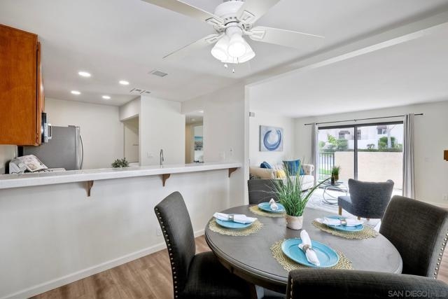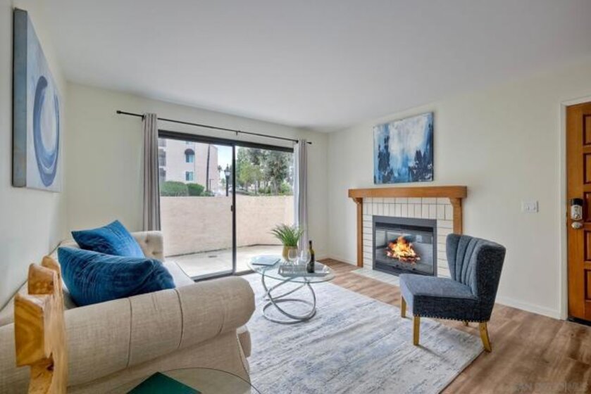 Charming lower corner unit in the Marbella development. Conveniently located in a park like setting in La Jolla Colony. Located less than 2 miles from UCSD with MTS Loop (201) bus stop next to complex, directly across the street from grocery and restaurants, quick freeway access, close proximity to parks, trails and shopping. You will enjoy relaxing in this bright 1st floor corner unit which has recently been upgraded with new vinyl tile floors and paint throughout, remodeled bathroom with new vanity(s) and new tile shower surround. Primary bedroom has its own vanity, direct access to bathroom from bedroom and walk in closet. Enjoy relaxing in a cozy living room with fireplace, with direct access to a private patio area. Refrigerator, Full Size Washer/Dryer in unit with Attached 2 Car Garage with an opener! Water and Trash are included in HOA Dues