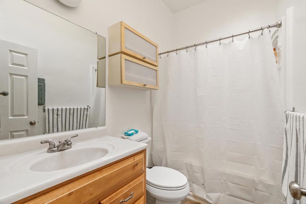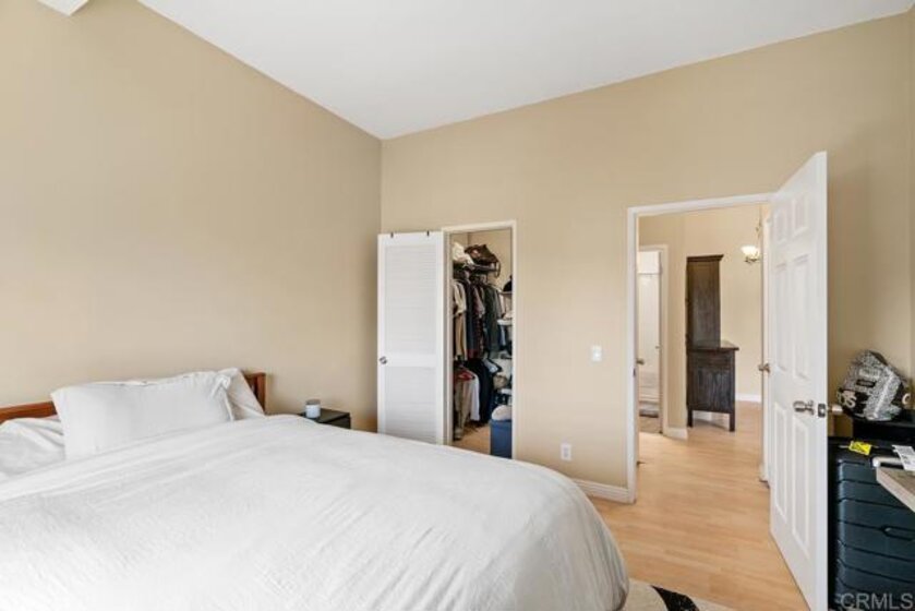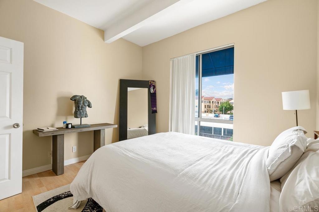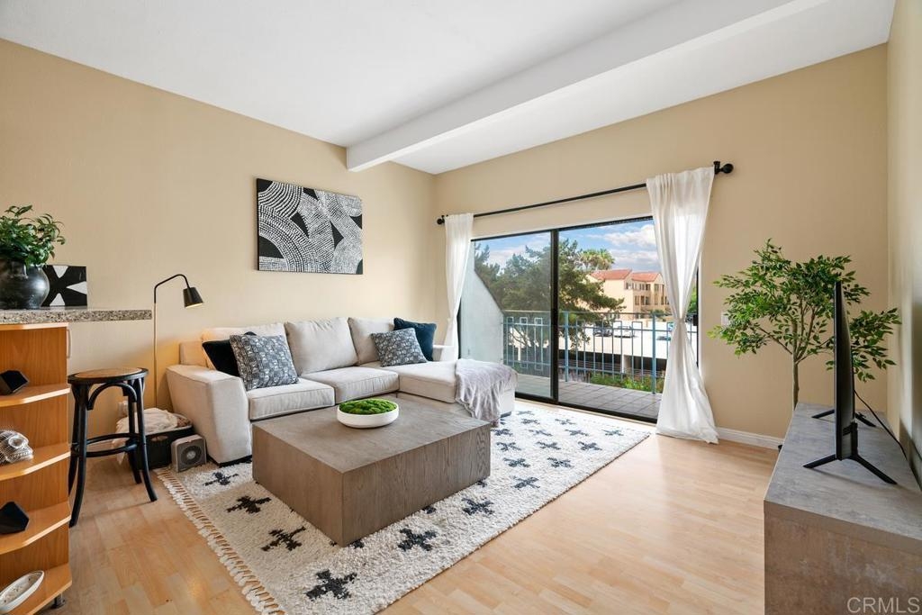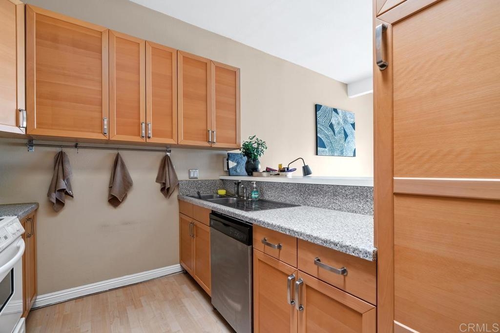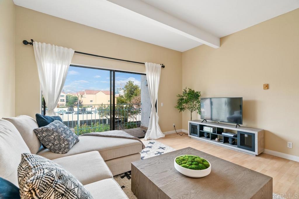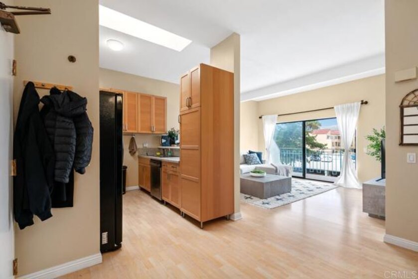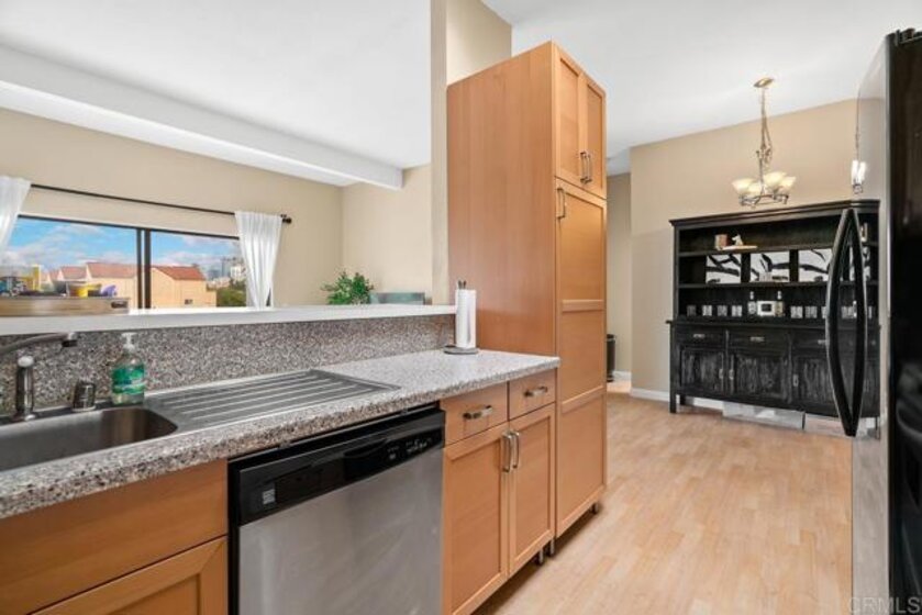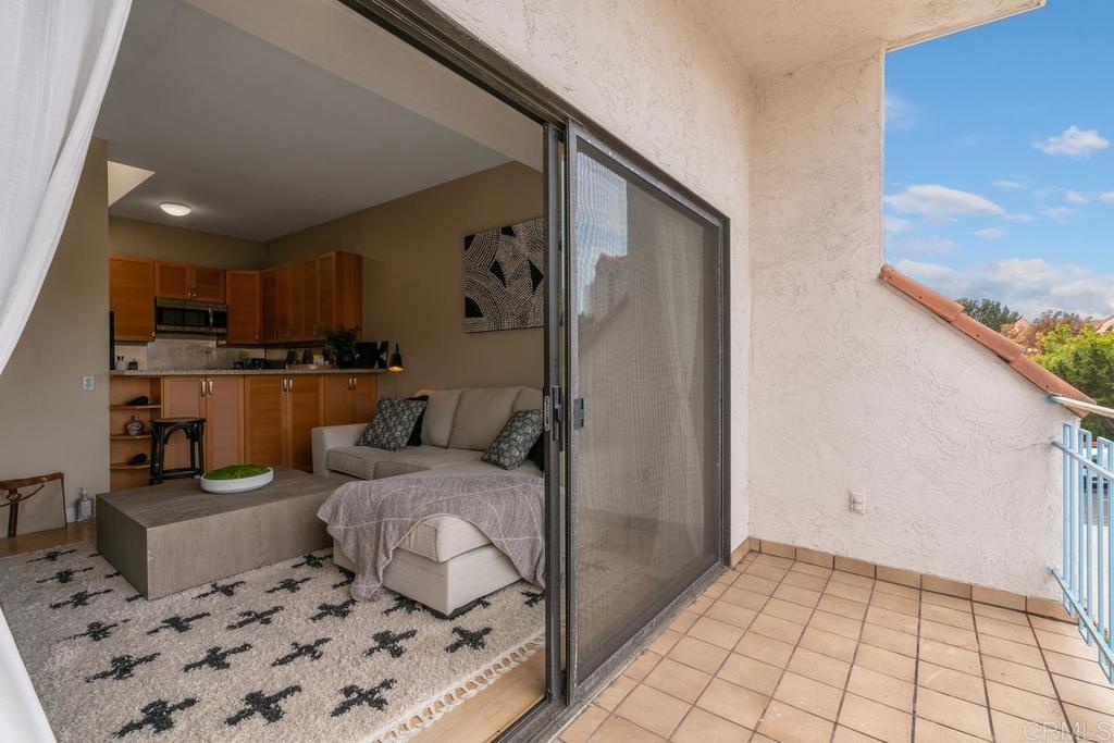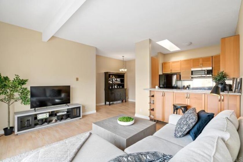 The gorgeous, updated top-floor condominium is nestled in the gated community of the Pines of La Jolla. As you enter, you will gaze upon an open floor plan with skylights that bathe the interior in natural light. The dining area, living room, and kitchen flow seamlessly together. The upgraded kitchen features stunning shaker cabinetry, granite counters, custom stainless steel backsplash, and appliances. Open the patio door wide to let the cool breezes flow through year-round. The bedroom enjoys high, beamed ceilings and a walk-in closet with shelves. The detached 2 car tandem garage makes parking a breeze. The Pines of La Jolla offers its residents controlled access, a community laundry facility, a sparkling pool, and a spa. Miles of world-class beaches are only 3 miles away too.