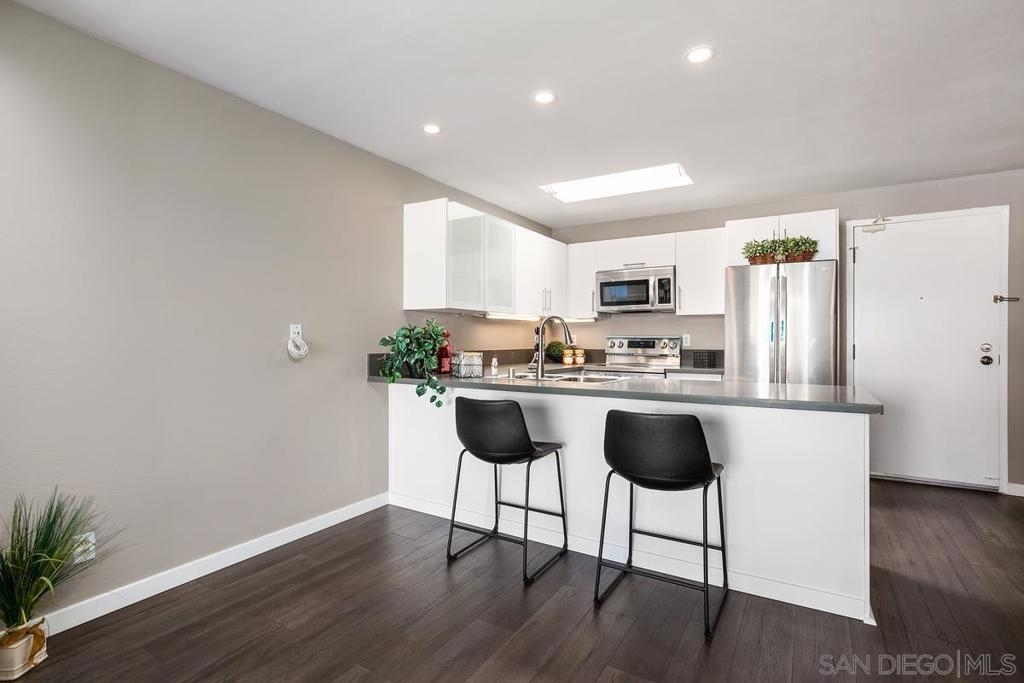 TOP FLOOR UNIT ** UPGRADED CONDO*** LOCATED ALL THE WAY IN THE BACK OF THE COMPLEX! This home is loaded with upgrades and features: Beautiful brand new kitchen with modern white cabinets, grey quartz countertops, brand new LG kitchen appliances and bar seating that flows right into your living room! New interior paint and carpeting (in the bedrooms) and laminate flooring (in the living room /dining and kitchen) and new vanities in the bathrooms! Large living room with a fireplace and a large tile balcony with an extra storage closet. 1 assigned parking space close to the unit's entrance and extra guest parking through the complex. The Pines of La Jolla is a gated community with great amenities including the sparkling swimming pool, spa, and walking paths HOA fees include: water, trash, sewer, pool, security gates. Complex is close to La Jolla Village, UCSD, UTC Mall, Whole Foods, Traders Joes, parks, movie theaters, great schools, UTC trolley station and more! Broker and Broker's Agents do not represent or guarantee accuracy of the MLS information , square footage, permitted or unpermitted space, bd/ba count, lot size/dimensions, HOA or Mello Roos fees, schools, or other information concerning the conditions or features of the property. Buyer is advised to independently verify the accuracy of all information through personal inspection & w/ appropriate professionals to satisfy themselves.