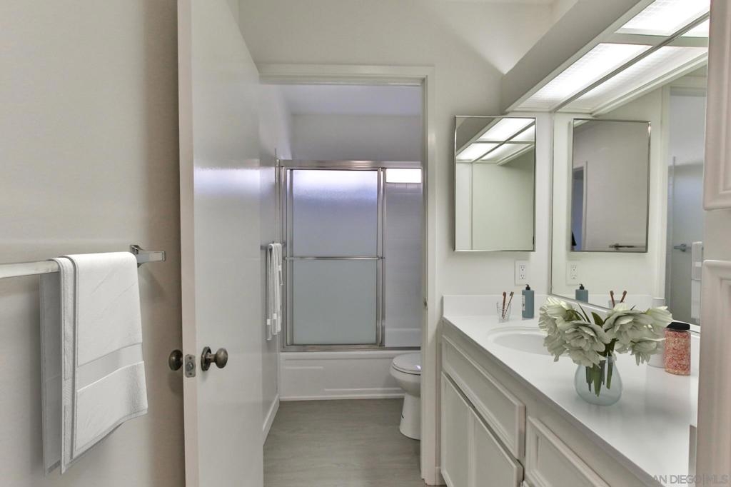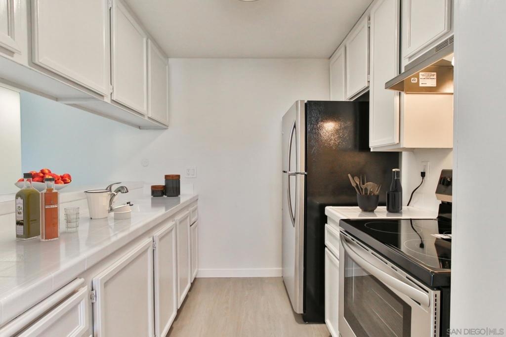 Move In Ready! 1bed/1bath/1garage. Just renovated and freshly painted throughout- including all cabinets and closet doors. This home offers brand new stainless steel appliances, refinished countertops in the kitchen and bathroom and refinished bathtub and shower. New lighting throughout and brand new luxury vinyl wood floors in the grey/natural tones. Light and bright corner unit with only one shared wall. The bedroom and the living areas both boast large patio terraces for the ultimate in outdoor San Diego living. The community offers a lovely common, gated pool and a laundry room. Additional guest parking is available. Truly a must-see! Close to UCSD, Scripps, UTC mall, shopping, highways...Minutes to the beach! Close to UCSD, Scripps, UTC Mall, WholeFoods, Trader Joe's, Ralph's and all highways. Minutes to the beach. Sewer: Sewer Connected Topography: LL