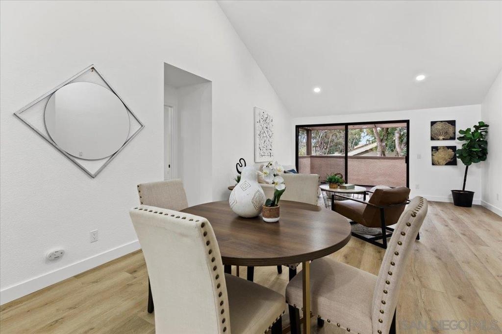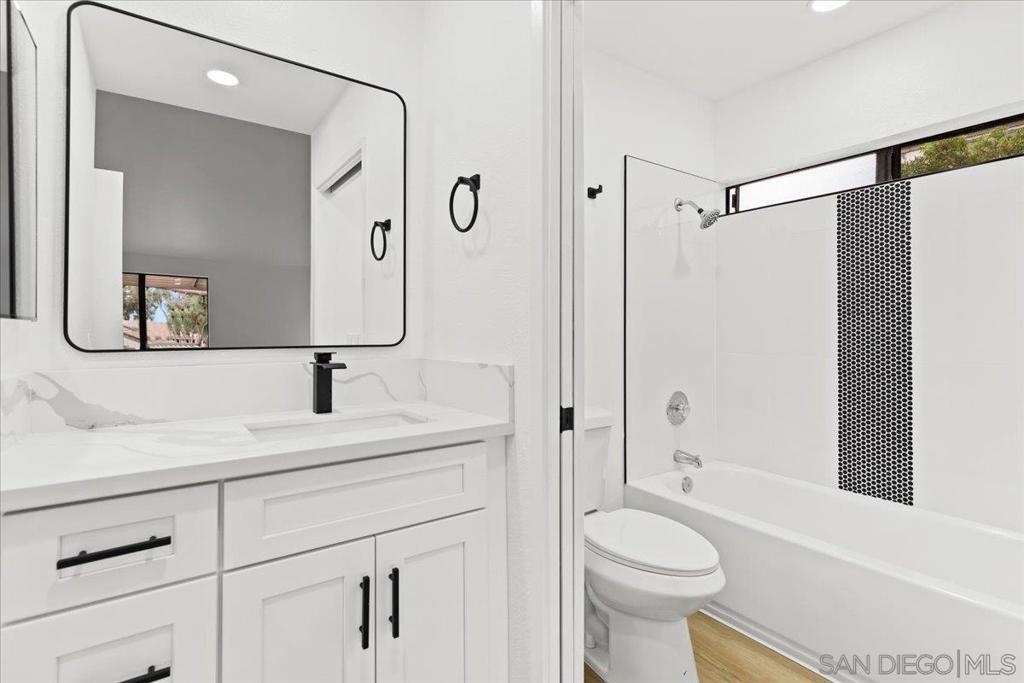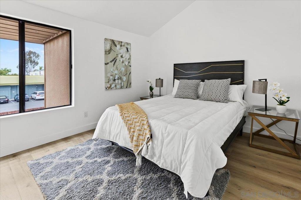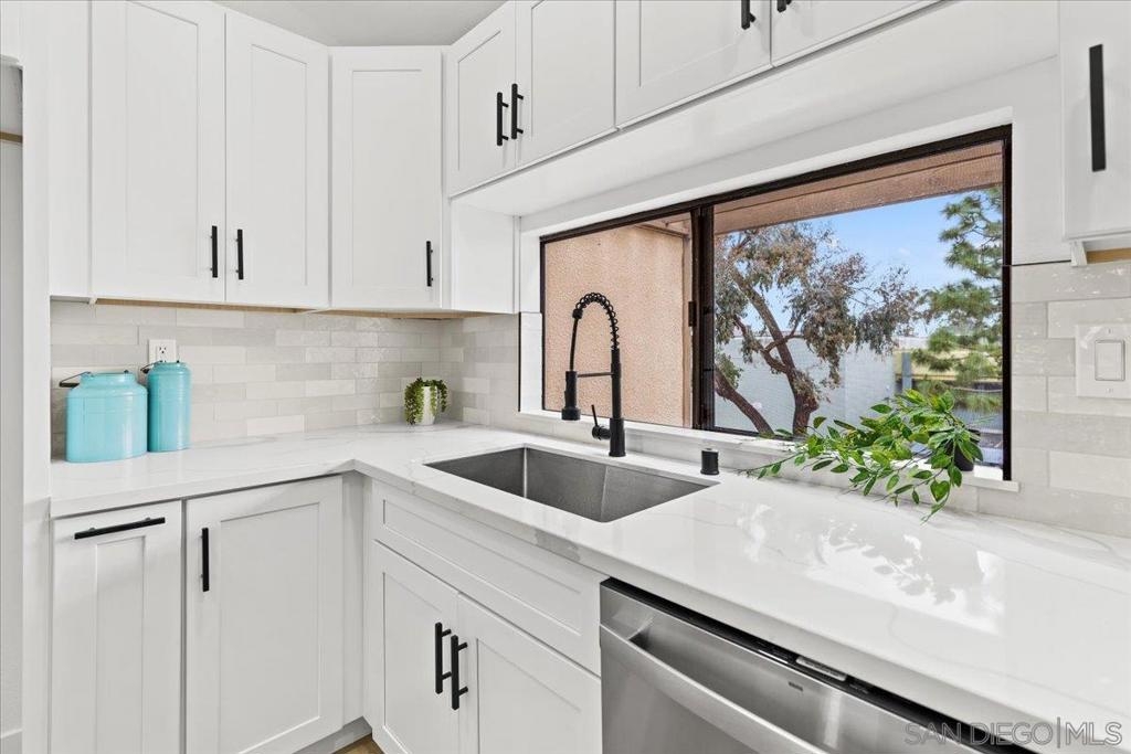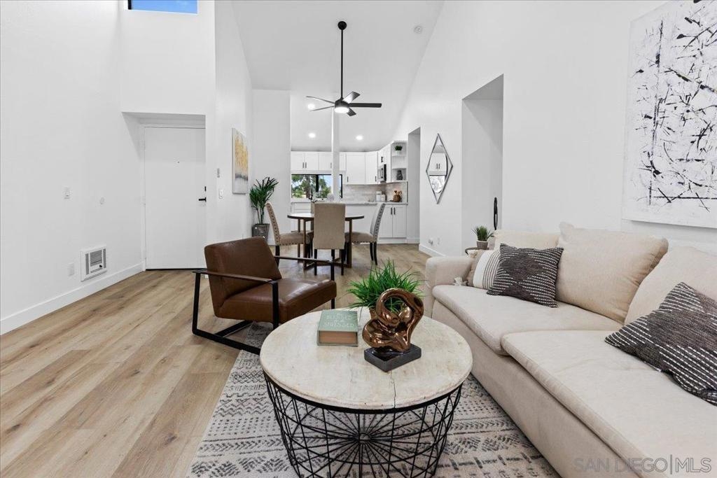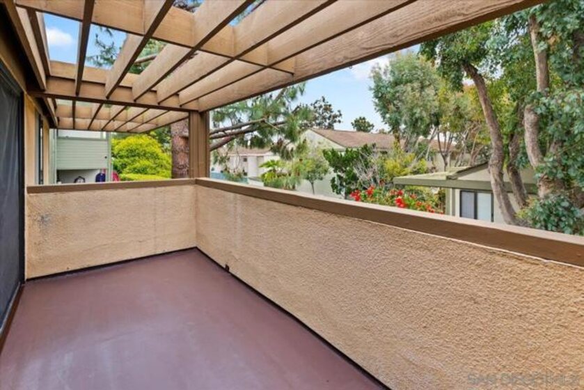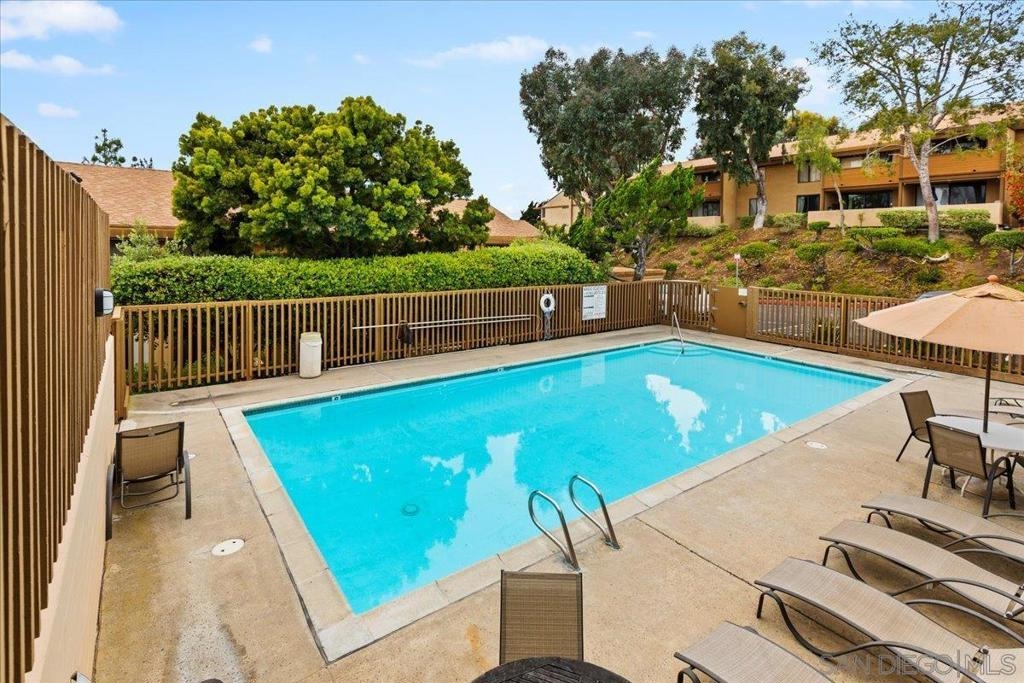 Beautifully remodeled top-floor 2-bedroom unit in highly sought-after University City! This home features an open, spacious floor plan with vaulted ceilings, fresh paint, luxury vinyl plank flooring, recessed lighting and ceiling fan. The upgraded kitchen boasts custom cabinetry, quartz countertops, tile backsplash and stainless steel appliances. Remodeled bathrooms come with designer fixtures, and the unit offers abundant natural light, ample storage and expansive closet space. Enjoy the convenience of a one-car epoxy garage, an additional parking space and a sizable balcony perfect for relaxation or outdoor gatherings. Community amenities include a sparkling gated pool and guest parking. Close to UTC Mall, UCSD, pristine beaches, and with easy freeway access, this is a must-see opportunity!