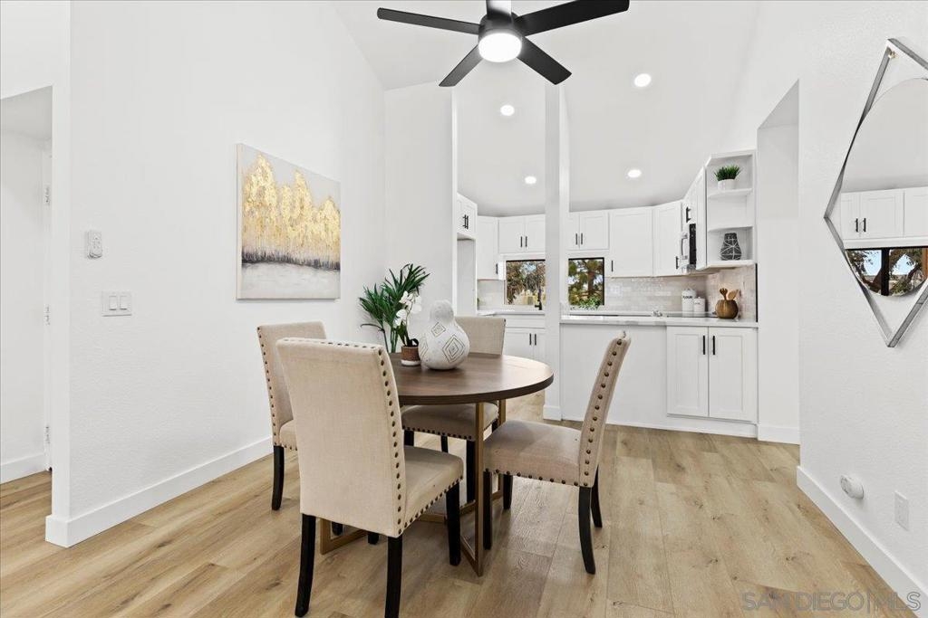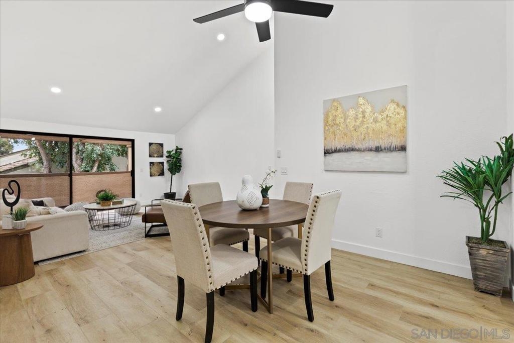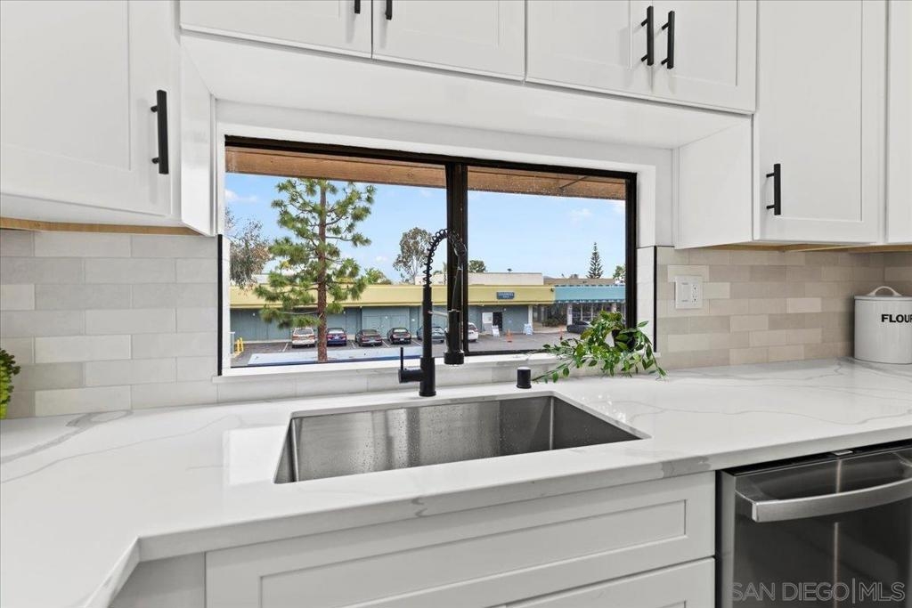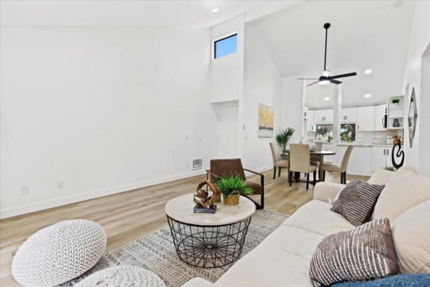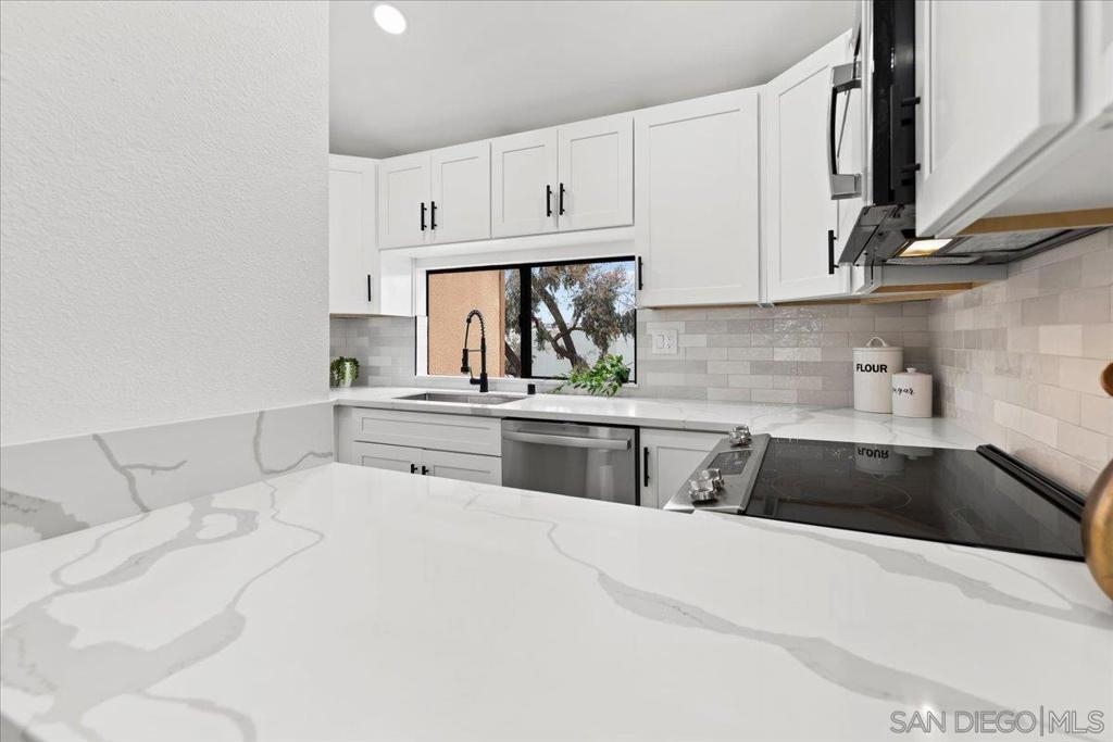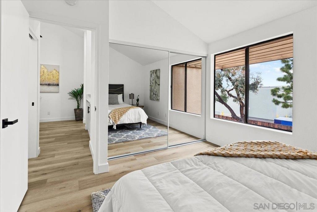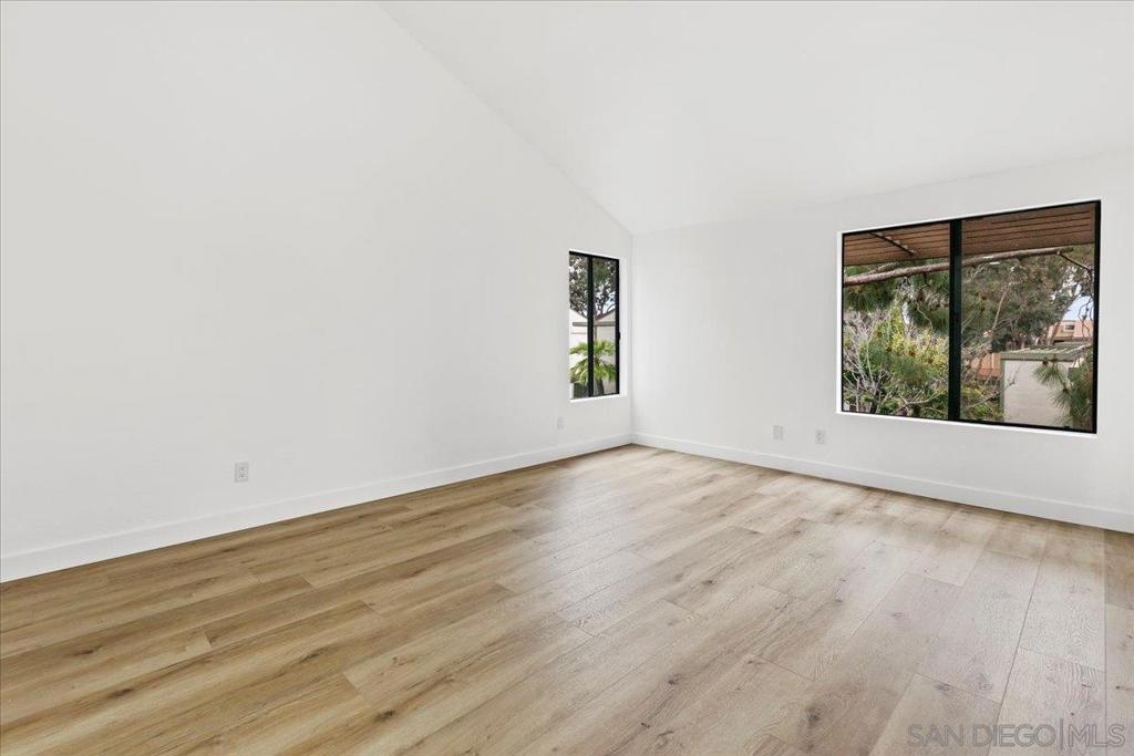 Beautifully remodeled top-floor 2-bedroom unit in highly sought-after University City! This home features an open, spacious floor plan with vaulted ceilings, fresh paint, luxury vinyl plank flooring, recessed lighting and ceiling fan. The upgraded kitchen boasts custom cabinetry, quartz countertops, tile backsplash and stainless steel appliances. Remodeled bathrooms come with designer fixtures, and the unit offers abundant natural light, ample storage and expansive closet space. Enjoy the convenience of a one-car epoxy garage, an additional parking space and a sizable balcony perfect for relaxation or outdoor gatherings. Community amenities include a sparkling gated pool and guest parking. Close to UTC Mall, UCSD, pristine beaches, and with easy freeway access, this is a must-see opportunity!