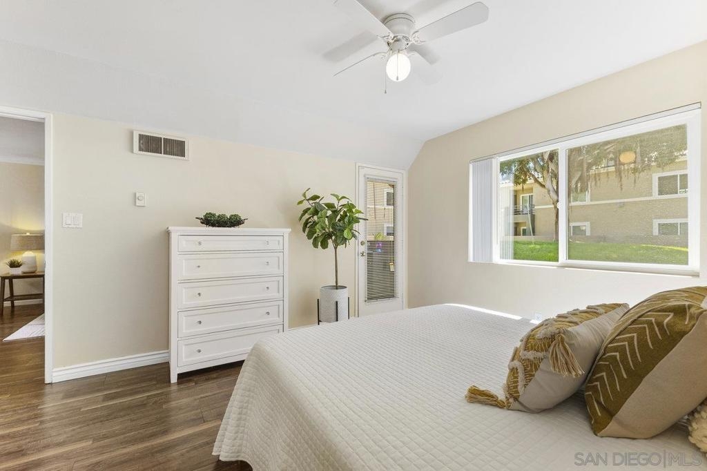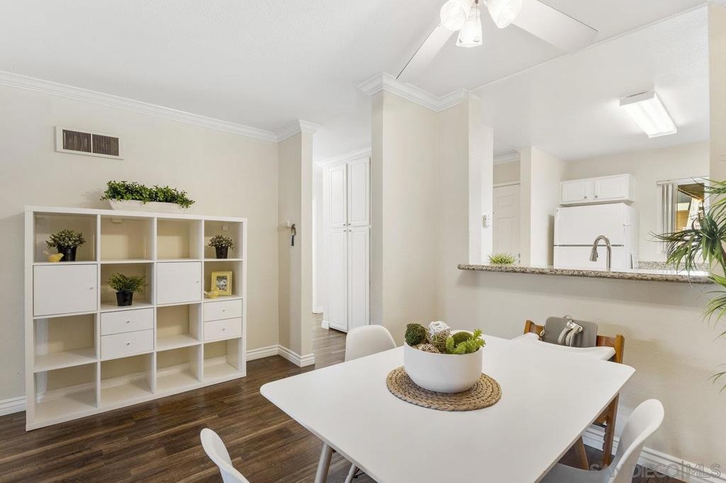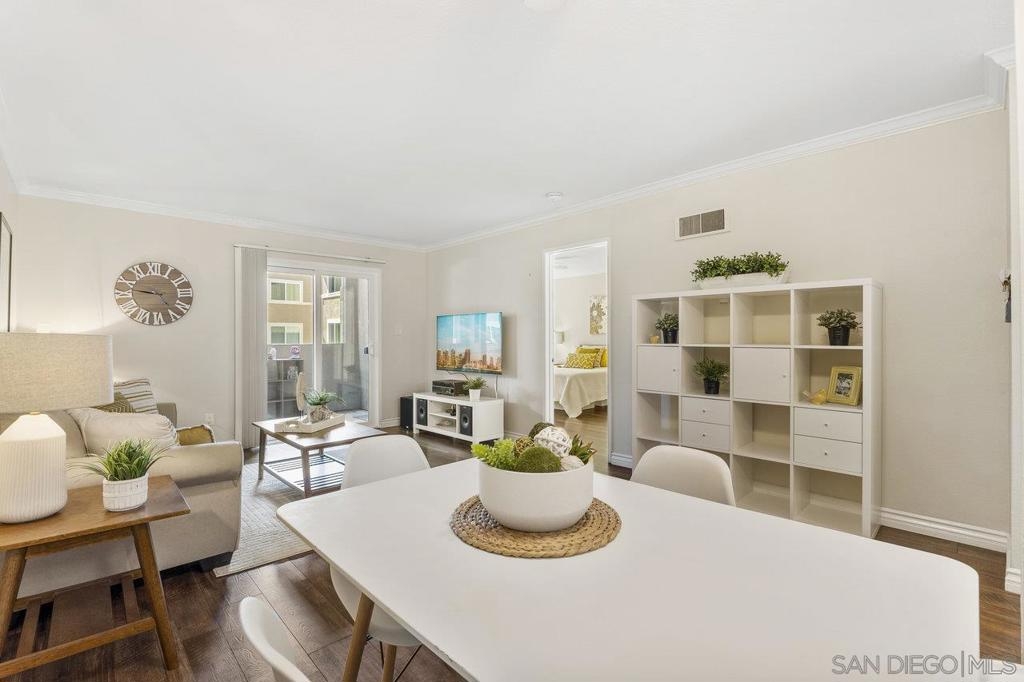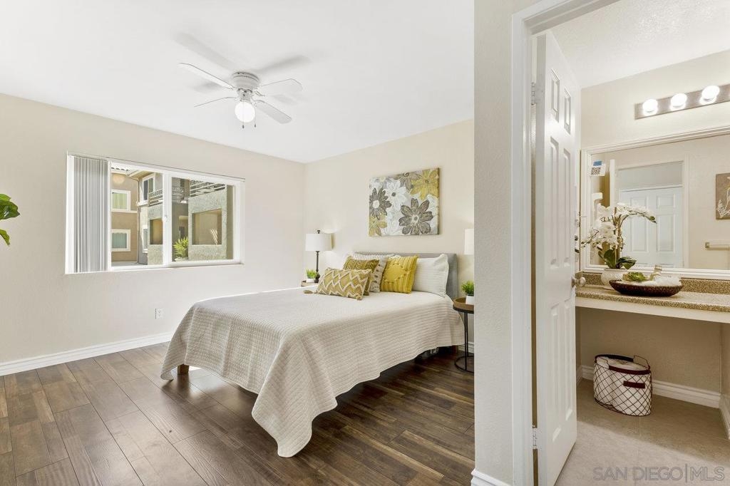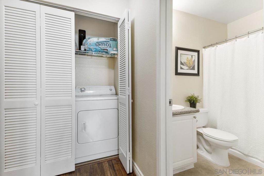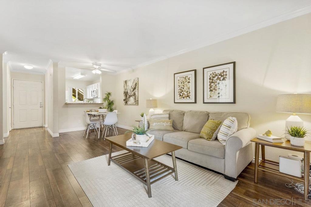 Move-In Ready! Welcome to the best location in sought-after Verano La Jolla Colony community. A quiet and serene retreat combining convenience & comfort. Freshly painted, light filled, open floor plan and stylish wood laminate floors. Three parking permits. Full size in-unit laundry. Amenities + water/trash included in HOA. The unit includes three parking permits (2 garage spaces and 1 guest pass), a full washer and dryer with additional hallway storage, and access to fantastic community amenities such as two pool areas, BBQ stations, a gated parking garage, a cybercafé, and a gym. Explore the nearby walking trails that connect Verano to the broader La Jolla Colony community, with La Jolla Colony Park and the La Jolla Colony Dog Park right next door. Perfectly situated in a central location, this condo offers easy freeway access and is conveniently near the Blue Line trolley stop. Enjoy being less than 2 miles from UCSD, shopping, restaurants, and major freeways. Plus, you're just an 11-minute drive from La Jolla Shores Beach and Pacific Beach, and only 15 minutes from Downtown, Little Italy, and the San Diego Zoo.