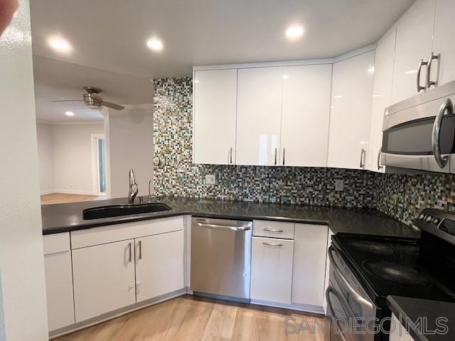 A lovely home awaits you in the heart of UTC. This modern condo is move-in ready and upgraded in the highly sought-after Verano community. The condo boasts a contemporary floor plan with brand-new light wood laminate flooring, crown molding, dual pane windows, fresh paint, a new vanity, and ample storage space. It comprises two dual master suites, each with a walk-in closet. The kitchen and both bathrooms have beautiful cabinets and feature quartz countertops. You will also find stainless steel appliances, including a new dishwasher. The condo features an oversized patio perfect for barbecuing or dining outside during warmer days. The condo has two assigned spaces in a gated garage and one pass for upstairs parking. The complex offers proximity to the beach, UCSD, trolley station, UTC mall, I-5 freeway, La Jolla, dining, and shopping. The property amenities include walking trails, two swimming pools, a Fitness Center, a BBQ, an on-site HOA office, a Cyber Café, and more.