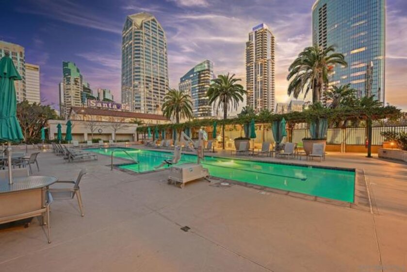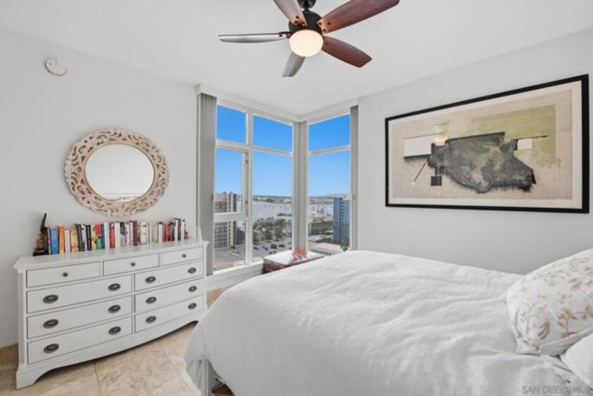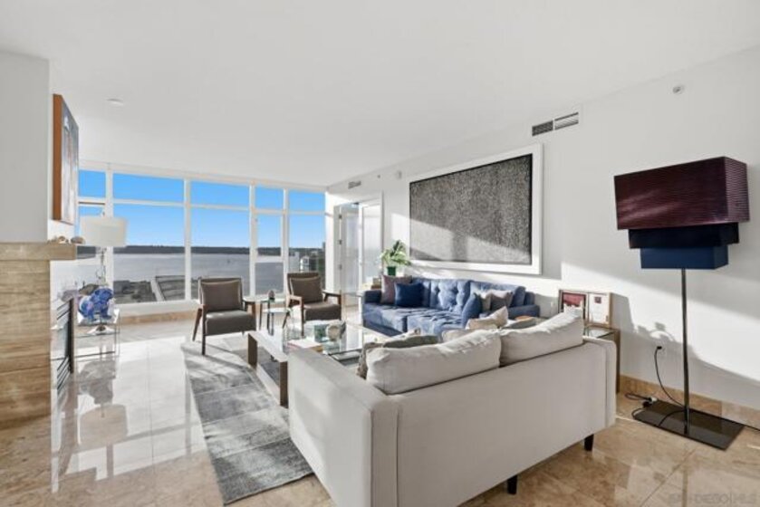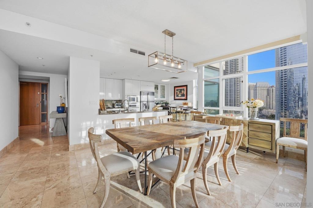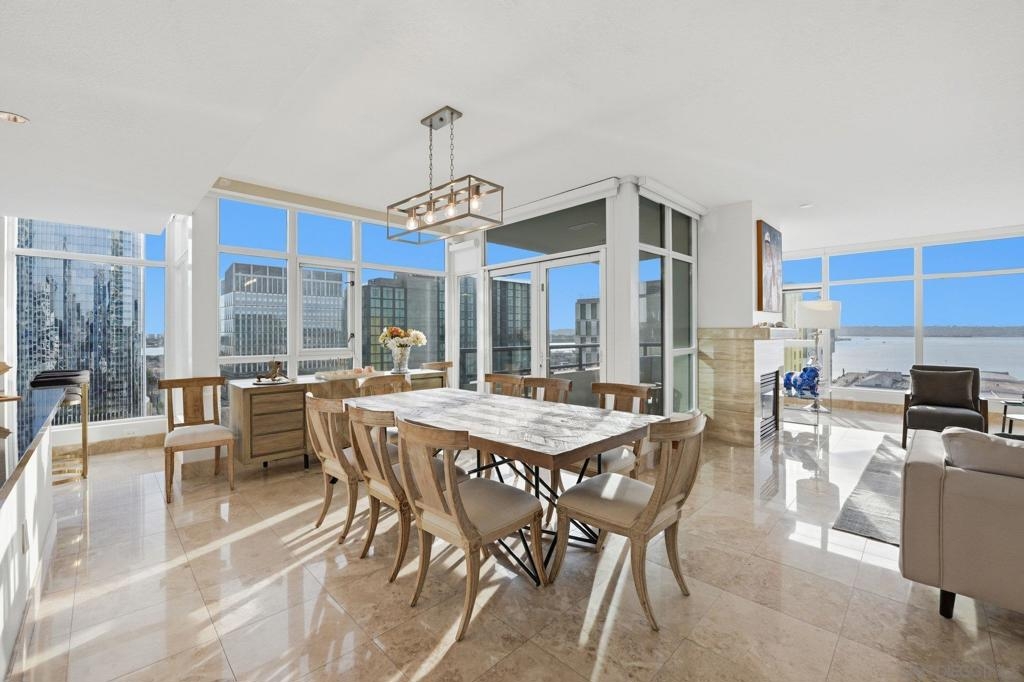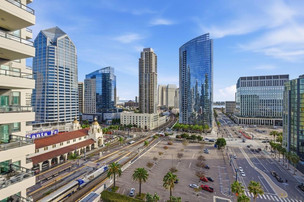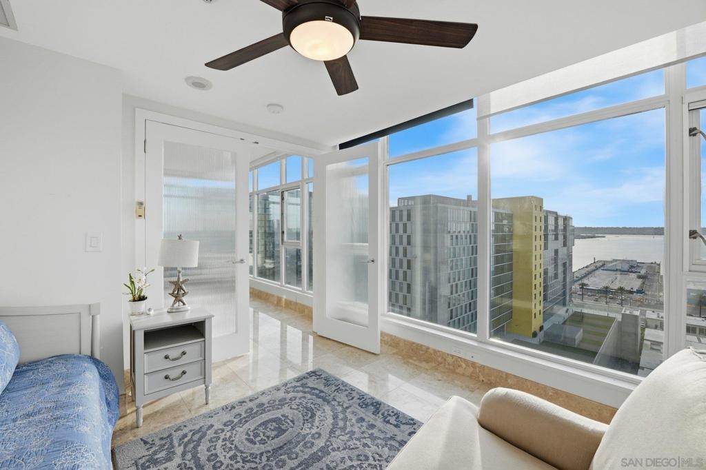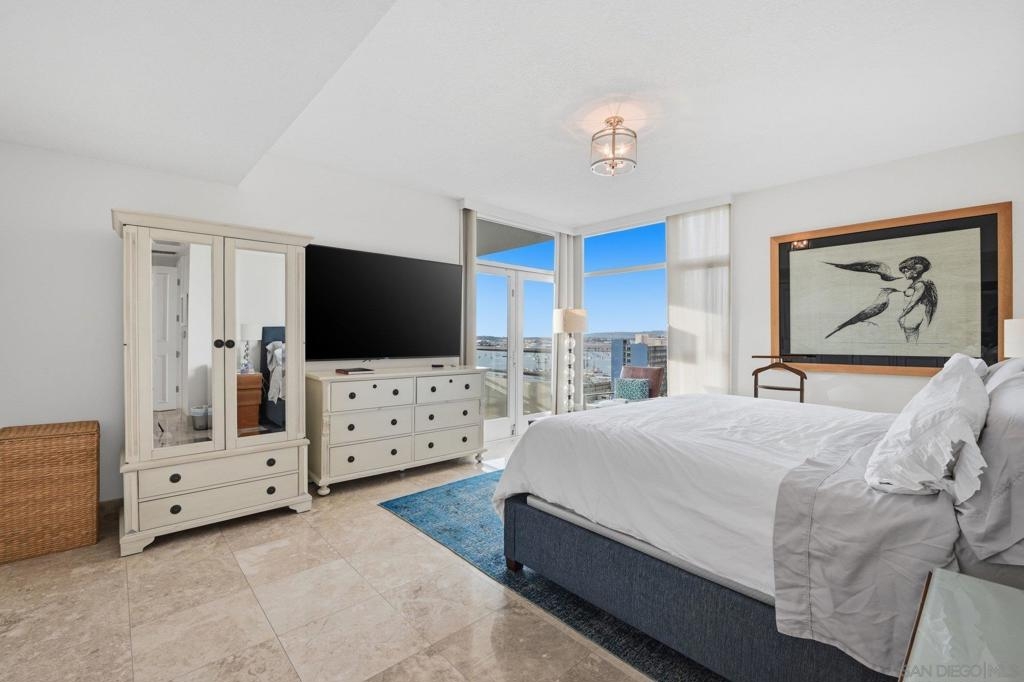 Experience the ultimate in downtown luxury at The Grande at Santa Fe—one of the most coveted residences in the building and the largest floor plan offered. This elegant 2-bedroom + extra room home is perched as close to the bay as the city allows, presenting sweeping panoramic views from Coronado to Point Loma. Floor-to-ceiling triple-pane windows frame the scenery while reducing noise and protecting the interiors from sun exposure. Inside, you’ll find beautifully customized finishes including rich stone counters with full backsplash, custom cabinetry, automatic window coverings, cedar-lined closets, and polished travertine flooring throughout. Parking side by side, near elevator. Ideally located adjacent to the train station and just minutes from the airport, cruis