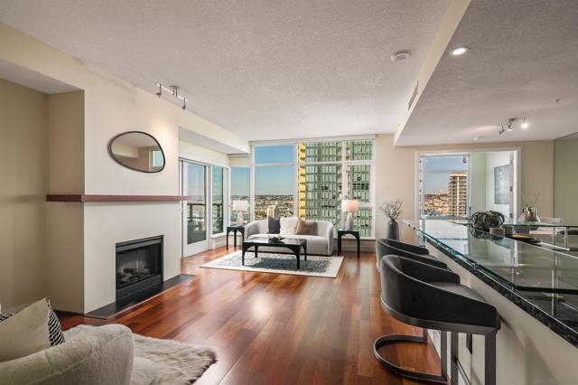 Where the Bay Meets Your Everyday. This 20th-floor corner residence delivers sweeping, unobstructed views of San Diego Bay, Point Loma, the harbor, and sparkling city lights through floor-to-ceiling glass. From regattas drifting across the water to vibrant evening sunsets, the panorama becomes part of your daily rhythm. The floor plan includes 2 bedrooms plus a den, offering flexibility for a home office, media room, or guest suite. The primary bedroom features dramatic bay views, a walk-in closet, and a spa-like bath. A second full bathroom and a large pantry add convenience. The open layout is designed for effortless living and entertaining, with hardwood floors and a modern fireplace that adds warmth and style. The kitchen is a standout featuring high-quality appliances and generous storage. Located in the heart of the Columbia District along “Millionaires’ Row,” The Grande offers resort-level amenities including 24-hour concierge, pool, spa, steam/sauna rooms, fitness center, guest suite, and secure parking. Step outside to Little Italy, the waterfront, Portside Pier, the Rady Shell, and some of the best dining and recreation Downtown has to offer.