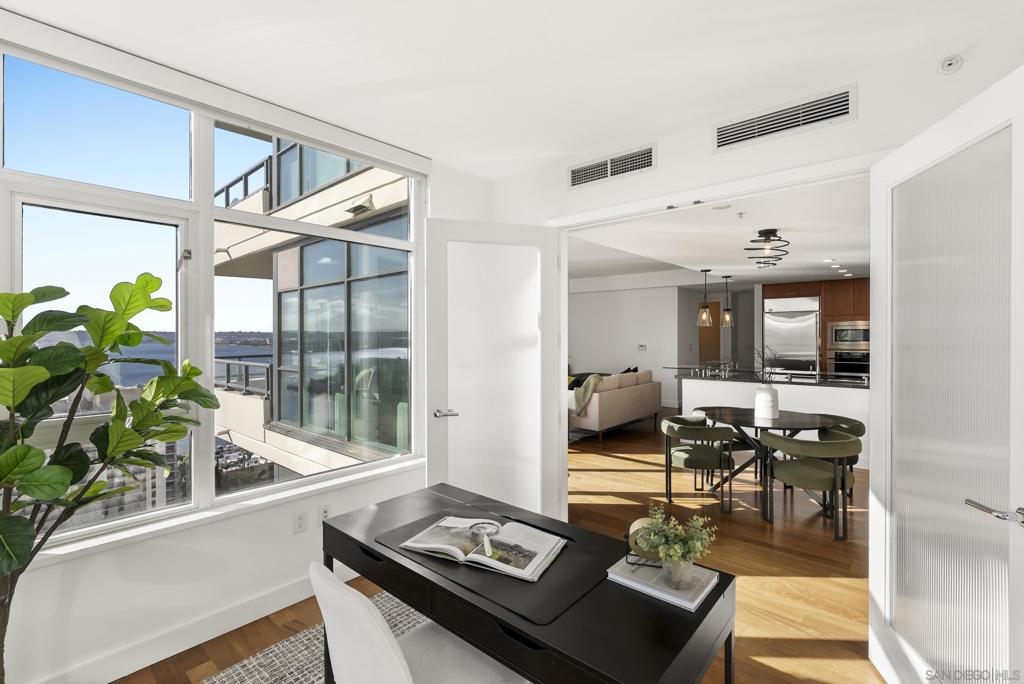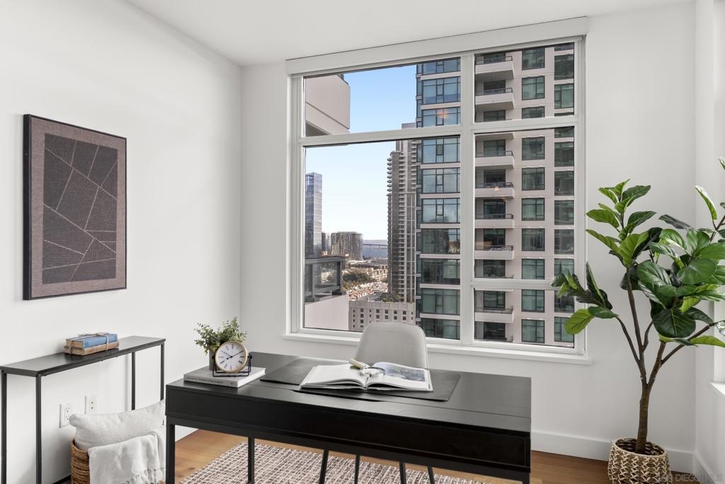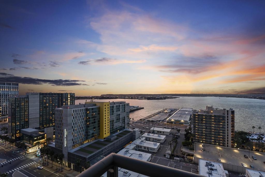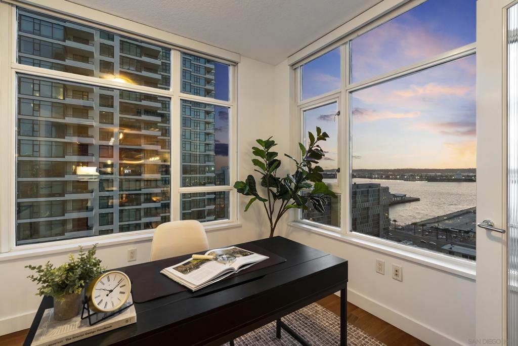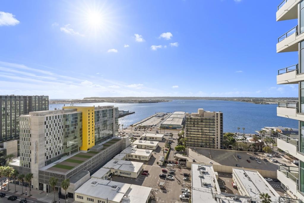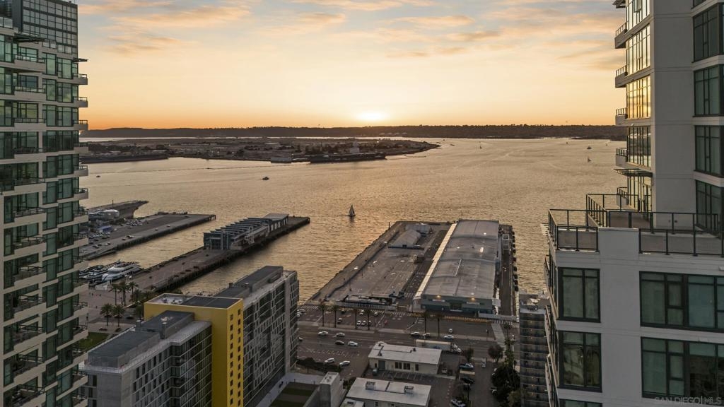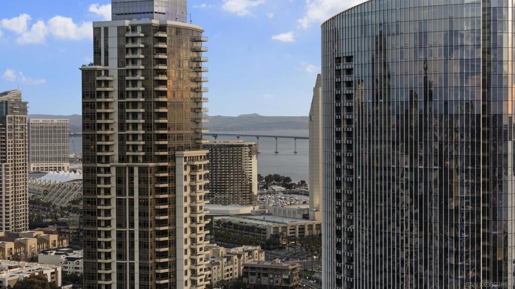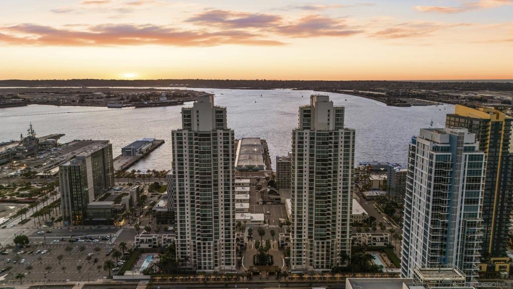 Perched 21 floors above the San Diego Bay, this rare residence at The Grande North offers one of the most coveted vantage points in the building. This expansive 2-bedroom plus office, 2-bath home is widely regarded as one of the premier orientations in the tower—celebrated for its breathtaking panoramic views of the bay, Pacific Ocean, and glittering downtown skyline. Walls of glass frame unforgettable sunsets and ever-changing waterfront scenery, filling the open living and dining areas with natural light. A dedicated office provides flexibility for remote work or a private retreat, while the thoughtful layout balances openness with refined separation—ideal for both entertaining and everyday living. The Grande North is one of downtown San Diego’s landmark luxury towers, known for discretion, security, and elevated standards. Residents enjoy 24-hour security, concierge service, controlled access parking, private storage, and multiple high-speed elevators. Resort-level amenities include an 80-foot lap pool, spa, sauna and steam rooms, a state-of-the-art fitness center, elegant resident lounges, outdoor barbecue areas, and a private guest suite. Located in the prestigious Columbia District, steps from Waterfront Park, the bayfront promenade, Seaport Village, and downtown’s finest dining and entertainment, this is walkable urban living at its most refined. Opportunities in The Grande North are rare—this is more than a residence; it is a distinguished holding in one of San Diego’s most iconic addresses.