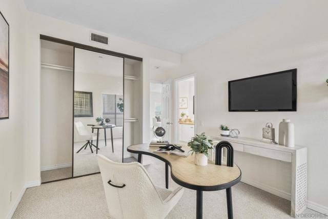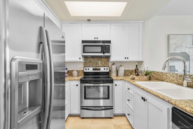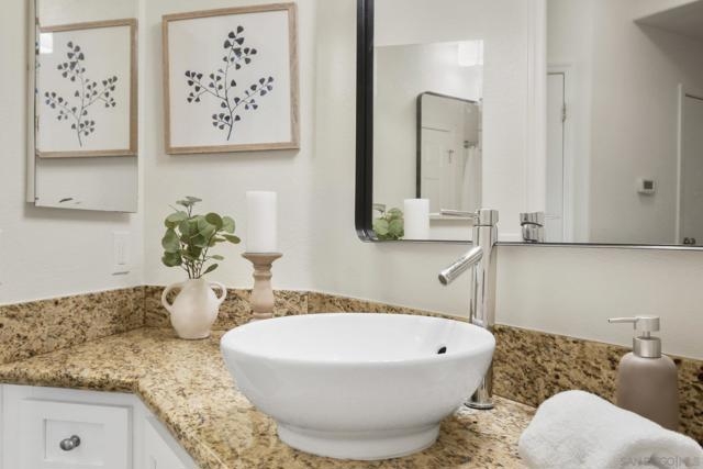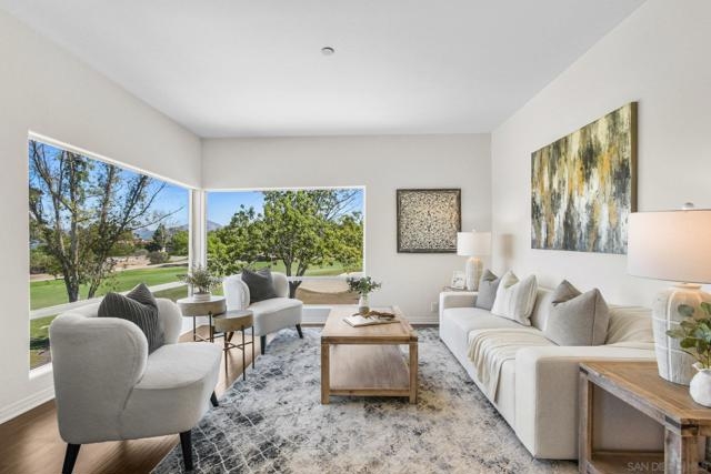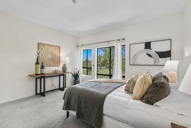 Gorgeous golf course views surround this upgraded corner unit in the gated Masters Hill community of Rancho Bernardo. This light and bright single-level condo offers two spacious bedrooms and two full baths, with an open floorplan that captures natural light and scenic vistas from most rooms. Interior highlights include central air conditioning, granite kitchen countertops, fresh paint throughout, and a cozy fireplace that adds warmth and charm to the living space. The primary suite features a remodeled en-suite bath and a generous walk-in closet. Conveniently located near the building entrance, the unit includes two dedicated covered parking spaces with upper storage units. Recent building upgrades include newly installed elevators and ongoing roof replacement. HOA dues cover most utilities—water, gas, internet, cable, trash, and exterior maintenance—providing exceptional value and ease of ownership. Residents enjoy access to three community pools and the Bernardo Heights Community Center, which offers an Olympic-sized pool, wading pool, jacuzzi, locker rooms, fitness center, BBQ area, tennis and pickleball courts, basketball hoops, and a variety of recreational amenities. Situated in the heart of Rancho Bernardo, this move-in-ready home is within walking distance to Rancho Bernardo High School and Bernardo Heights Middle School, and just minutes from parks, shopping, dining, and freeway access. A rare opportunity to enjoy low-maintenance living in one of San Diego’s most desirable gated communities.