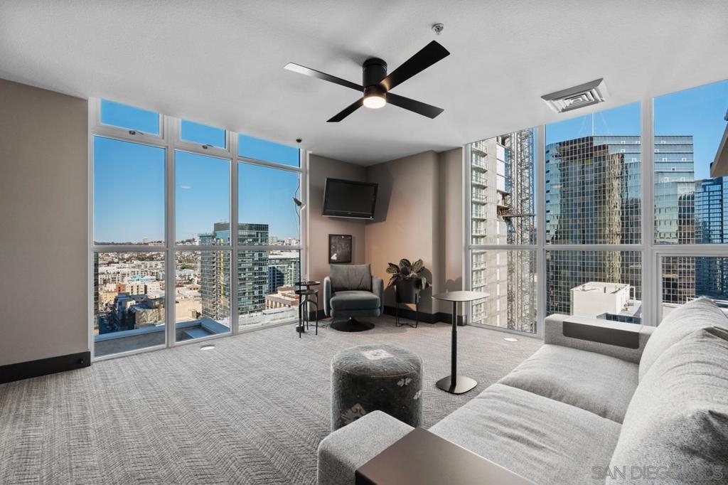 Range pricing: $2.4-$2.6. An extraordinary penthouse in the highly sought-after TREO building, which lies on the edge of Little Italy, offering one of the largest private patios in all of Downtown—more than 1,200 sq. ft.. Designed for elevated indoor-outdoor entertaining, the expansive terrace captures sweeping City and Bay views and breathtaking sunsets at every turn. In fact, the extraordinary views can be enjoyed from multiple rooms, with floor-to-ceiling windows to maximize light and those awesome city/bay views. Experience luxuriously appointed, state-of-the-art finishes, custom cabinetry, premium stone surfaces, designer lighting, and high-end appliances throughout. The open-concept layout is perfectly balanced with both private and intimate spaces, while a separate laundry room adds everyday convenience. Additional highlights include two dedicated parking spaces and a private storage unit. Every detail reflects meticulous craftsmanship, elevated materials, and refined design, creating a rare, sophisticated retreat in the heart of downtown. Just steps from Little Italy’s celebrated dining, waterfront promenade, and vibrant cultural attractions, this penthouse delivers an unparalleled urban lifestyle. Please read attached upgrade list and supplement. This residence has been thoughtfully enhanced and professionally redesigned from top to bottom with a comprehensive collection of high-end upgrades, blending innovation, comfort, and refined design throughout. The kitchen has been recently elevated for both performance and style, featuring a custom pantry with pull-out shelving, Fisher & Paykel dual-drawer dishwasher, JennAir built-in microwave drawer, Kraus oversized single-basin sink, Electrolux Icon five-burner gas range, and a double oven with convection and three adjustable racks. A Sub-Zero refrigerator with built-in ice maker anchors the space with timeless luxury. Adjacent dining and entertaining areas include a 196-bottle temperature-controlled wine cooler and a custom built-in bar, ideal for hosting at scale. The living area is centered around a Dimplex fireplace with a custom recessed television (included), paired with a statement ceiling fan controlled by remote. The primary bathroom has been newly curated with spa-level features, including Toto Washlet bidet system with remote controls, a Japanese soaking tub with massage jets, and an indulgent Mr. Steam shower with isteamX function, built-in speakers, and premium fixtures. Dual, side-by-side recessed medicine cabinets offer mirrored fronts with interior power outlets, complemented by motion-activated floor lighting for a seamless, elevated experience. Throughout the residence, enjoy remote-controlled window shades, Google Fiber internet, updated NextGen4 smart thermostats with 3 controls across three HVAC zones, offering both comfort and efficiency. A new stacked LG washer and dryer adds convenience, while all 3 bedrooms feature walk-in closets that provide generous, well-designed storage. Every enhancement has been artfully executed to deliver a luxurious, intuitive high-rise living experience—where technology, design, and comfort converge effortlessly.