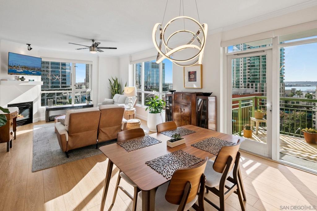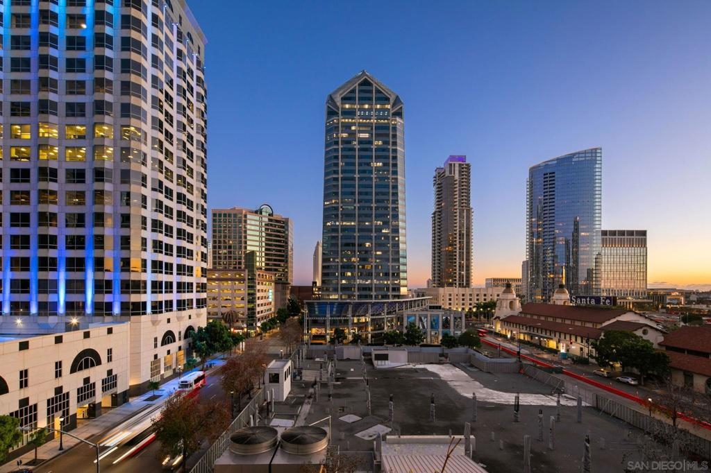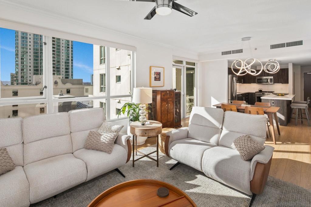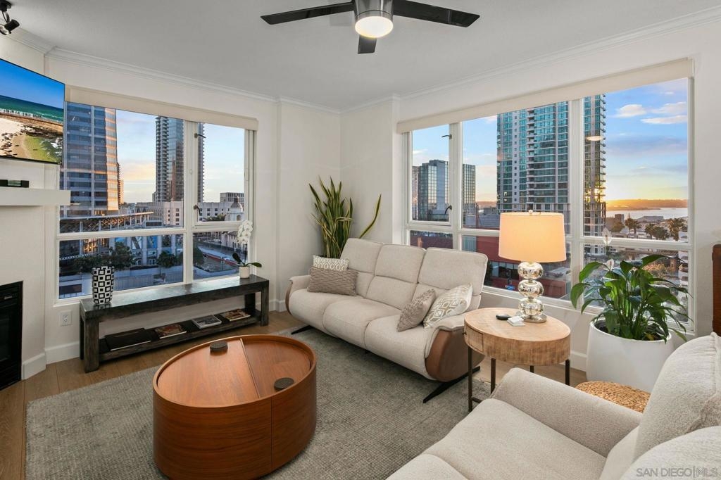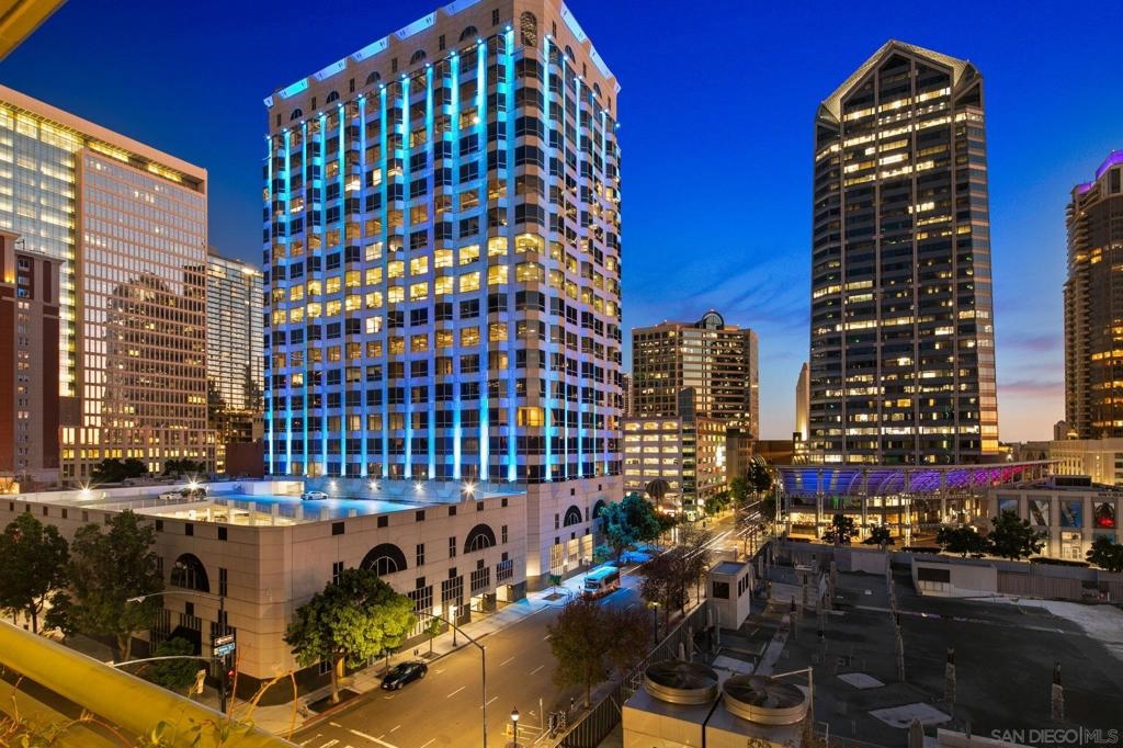 Prime southwest corner residence at Treo in the prestigious vibrant Columbia District/Little Italy, showcasing sweeping panoramic views of the downtown skyline and sparkling bay and waterfront. Offering approximately 1,441 square feet, this beautifully remodeled 2-bedroom, 2-bath plus 3rd room den/office floor plan is elevated by its desirable corner positioning and two private balconies that capture water and city views plus natural light throughout. Designed as a true turnkey opportunity, every detail has already been thoughtfully curated. Luxury vinyl plank flooring flows seamlessly throughout the home, complemented by a stunning remodeled kitchen with sleek quartz countertops, tile backsplash, designer cabinetry and stainless steel appliances. The upgraded bathrooms feature modern finishes and clean, contemporary design. Fresh interior paint enhances the light and airy aesthetic. Two secured parking spaces and dedicated storage add exceptional convenience. Ideally positioned in one of Downtown San Diego’s most walkable neighborhoods, residents enjoy effortless access to the Waterfront Park, Little Italy’s renowned dining scene, the Embarcadero, Seaport Village, Santa Fe Depot, and premier shopping and entertainment. Treo offers resort-style amenities including a lap pool and spa, state-of-the-art fitness center, resident lounge, outdoor BBQ area, on-site management, and secured entry. With its prime location, impeccable condition, and exceptional lifestyle appeal, this residence truly embodies the best of urban luxury living.