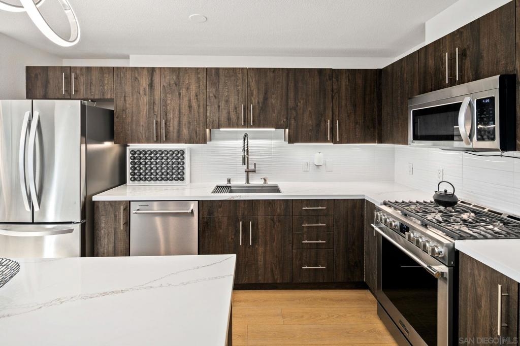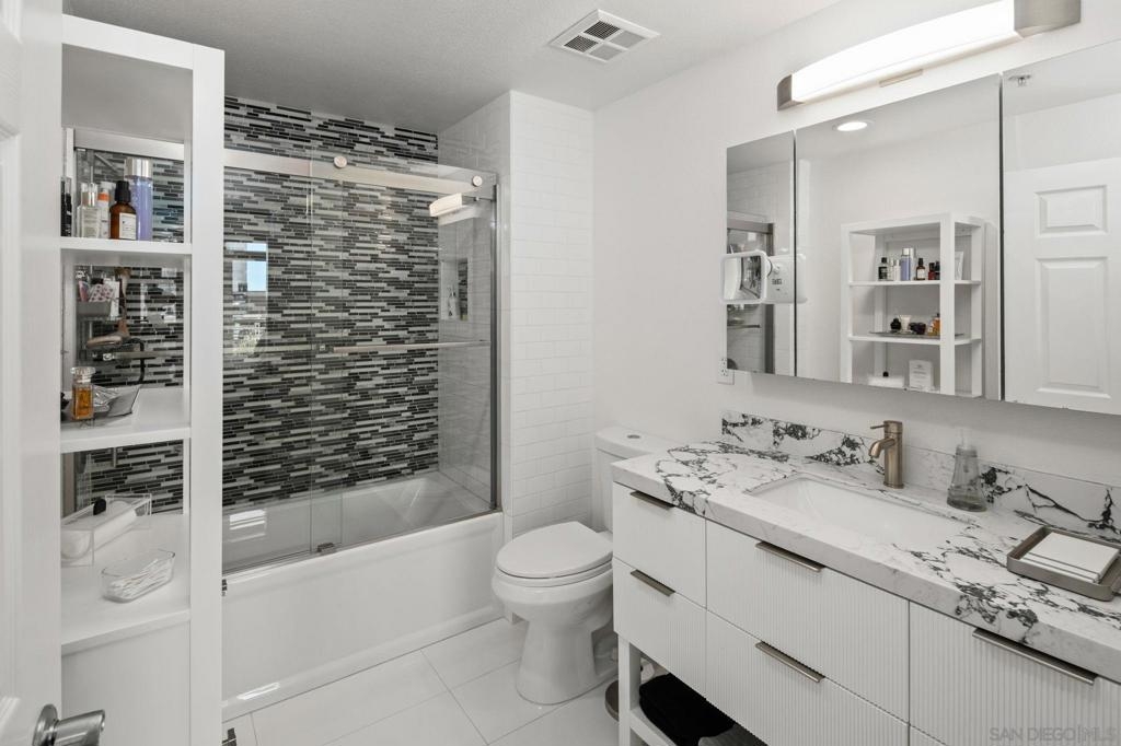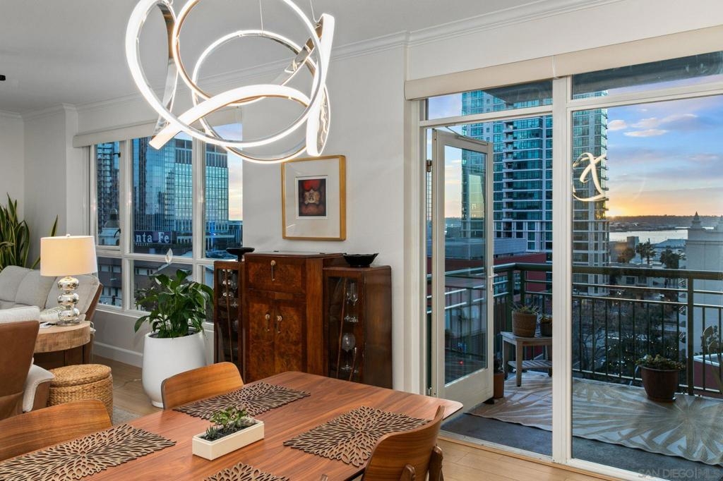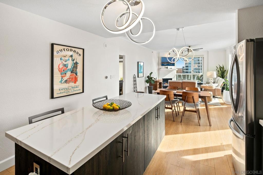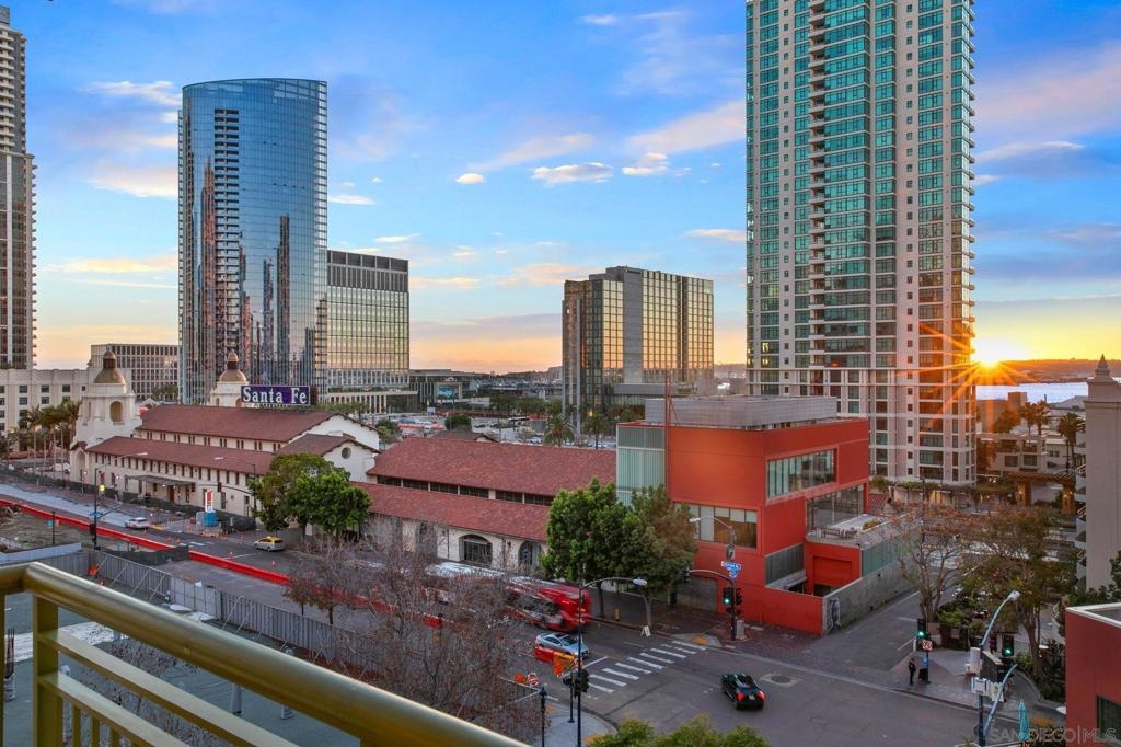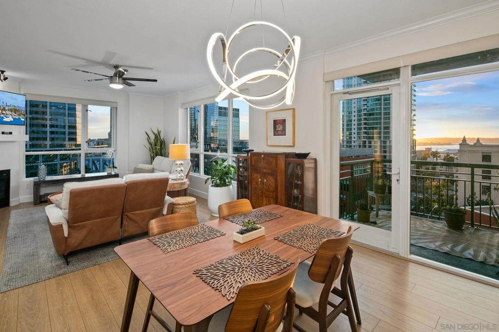 Prime southwest corner residence at Treo in the prestigious vibrant Columbia District/Little Italy, showcasing sweeping panoramic views of the downtown skyline and sparkling bay and waterfront. Offering approximately 1,441 square feet, this beautifully remodeled 2-bedroom, 2-bath plus 3rd room den/office floor plan is elevated by its desirable corner positioning and two private balconies that capture water and city views plus natural light throughout. Designed as a true turnkey opportunity, every detail has already been thoughtfully curated. Luxury vinyl plank flooring flows seamlessly throughout the home, complemented by a stunning remodeled kitchen with sleek quartz countertops, tile backsplash, designer cabinetry and stainless steel appliances. The upgraded bathrooms feature modern finishes and clean, contemporary design. Fresh interior paint enhances the light and airy aesthetic. Two secured parking spaces and dedicated storage add exceptional convenience. Ideally positioned in one of Downtown San Diego’s most walkable neighborhoods, residents enjoy effortless access to the Waterfront Park, Little Italy’s renowned dining scene, the Embarcadero, Seaport Village, Santa Fe Depot, and premier shopping and entertainment. Treo offers resort-style amenities including a lap pool and spa, state-of-the-art fitness center, resident lounge, outdoor BBQ area, on-site management, and secured entry. With its prime location, impeccable condition, and exceptional lifestyle appeal, this residence truly embodies the best of urban luxury living.