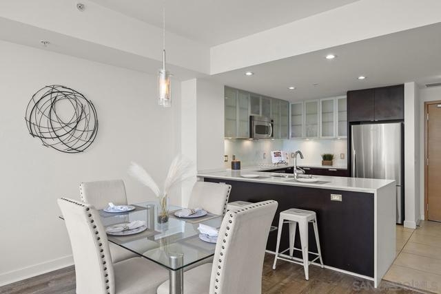 Capture the best of Downtown San Diego living in this 6th-floor, west-facing Aria residence. Enjoy city views and sunset skies from your private balcony. Inside, this spacious one-bedroom features modern luxury vinyl plank flooring, abundant natural light, and an open layout ideal for both relaxation and entertaining. The kitchen impresses with stainless appliances, recessed lighting, quartz counters and a stylish eat-at bar with a waterfall edge that is perfect for casual dining. The bedroom offers comfort and privacy with an ensuite bathroom and generous closet space. Added conveniences include in-unit stackable washer/dryer and a secured parking space. Perched in the highly sought-after Cortez Hill neighborhood, residents enjoy a serene, residential atmosphere just minutes from Downtown San Diego’s premier dining, shopping, cultural attractions, and the vibrant Gaslamp Quarter. Discover modern luxury living in one of Downtown’s most charming and well-connected communities. Located atop Cortez Hill, the highest point in San Diego, Aria was completed in 2008 and comprises 137 units. This prime location is set away from the city's hustle and bustle, offering both tranquility and convenience. Residents can enjoy a short stroll or drive to Balboa Park and the vibrant offerings of Downtown San Diego, coupled with excellent freeway access for broader travels. Aria residences boast spacious outdoor balconies and terraces, enhancing the living experience with modern comforts and stunning views of the bay, Balboa Park, and the city skyline. The building's amenities include a fitness center, lap pool and spa, club room with a catering kitchen and wet bar, all designed to elevate the quality of life for its residents.