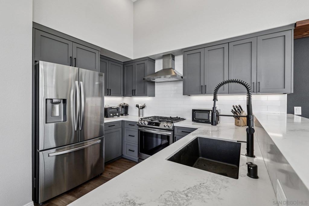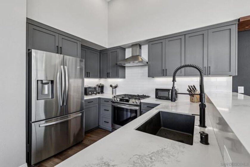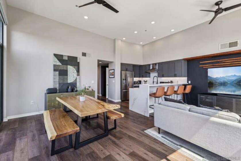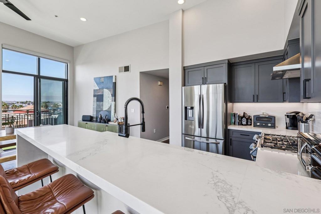 Experience breathtaking city and bay views from the top-floor, corner penthouse in DOMA—right in the heart of Little Italy. Rarely available and single-level, this 2 bedroom / 2.5 bathroom, 1,375 SF residence pairs dramatic high ceilings and an open, airy floor plan with wall-to-wall urban energy and sparkling water vistas from the living room and both bedrooms. A spacious private balcony —perfect for grilling and sunset watching— extends your living space outdoors. Two reserved, side-by-side parking spaces are conveniently located near the elevator for effortless city living. Inside, thoughtful upgrades elevate everyday life: luxury vinyl plank floors, new carpet, fresh paint, and a reimagined chef’s kitchen with quartz counters, new cabinetry, sink, and backsplash, plus a suite of newer smart appliances (cooktop and fridge). The living area features custom wood paneling by a local artist, while electric smart shades in the living room and bedroom dial in light and privacy with a tap. Both bathrooms showcase new tiling; the primary suite shines with a fully redone bath (new shower, dual sinks, lighting, cabinetry, and quartz backdrop) and a custom built-in closet. Ample cabinetry maximizes storage throughout and a spacious in-unit laundry room adds everyday convenience. Step outside your door to Little Italy’s restaurants, cafés, and weekend mercato—or head upstairs to DOMA’s rooftop deck for sunsets and the fitness room for on-site wellness. This is the one you’ve been waiting for!