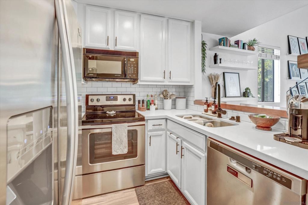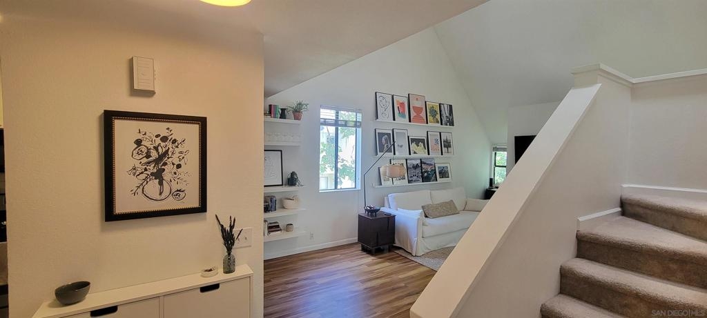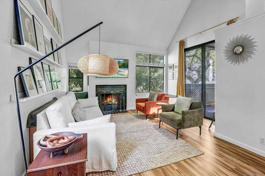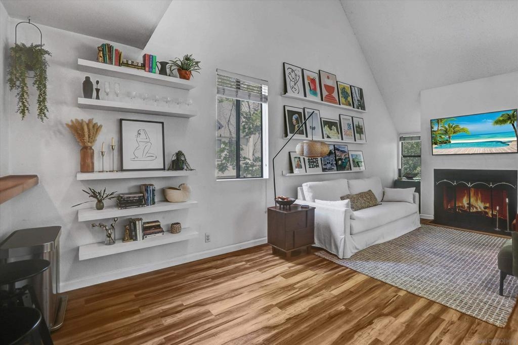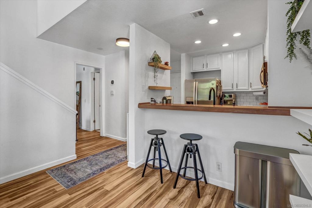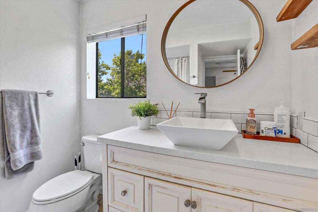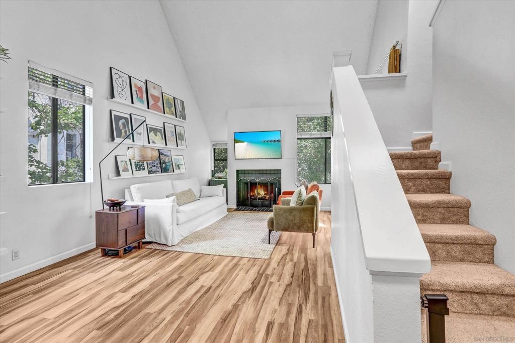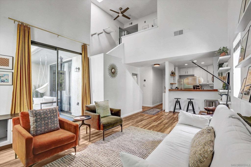 Welcome to Creekwood at River Run in the heart of San Diego! This turnkey two-bedroom condo features dramatic vaulted ceilings, two primary suites with the second-floor master having the option of its own entrance. In-unit laundry, updated kitchen with quartz counters, stainless steel appliances, LVP flooring and private patio. Updated bathrooms and located one block west of Costco, Ikea and walking distance to shops, restaurants, Starbucks. The community features water features throughout, a pool/spa and exercise room. Welcome to your future home in the highly sought-after Creekwood condominium complex, nestled in the vibrant Mission Valley area of San Diego. This stunning 2-bedroom, 2-bathroom condo is the epitome of modern living, boasting tasteful updates and an array of desirable features that make it the perfect choice for first-time buyers or anyone looking to experience the best of urban convenience and comfort. As you step inside, you'll immediately notice the abundance of natural light that floods the open-concept living space, creating a warm and inviting atmosphere. The updated living area flooring flows seamlessly into the dining space and the beautifully updated kitchen, which features sleek quartz countertops, professionally painted cabinetry new hardware and stainless appliances. The bathrooms have been updated with tiled showers and new vanities. The two spacious bedrooms are designed with comfort in mind, each offering ample closet space and large windows that enhance the bright and airy feel.