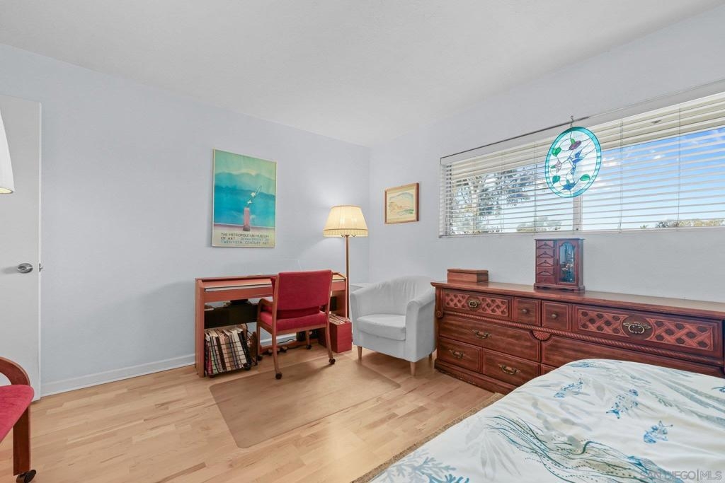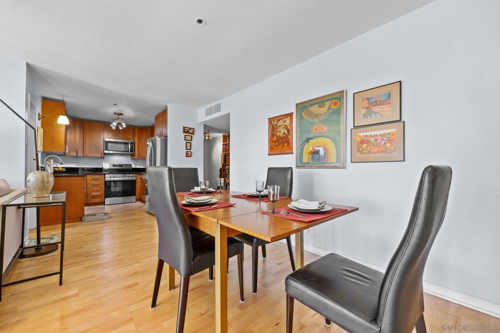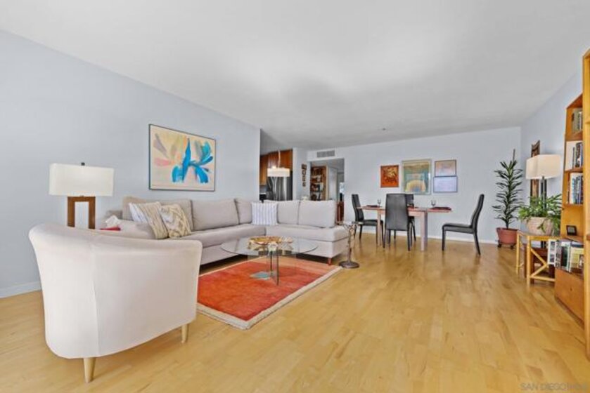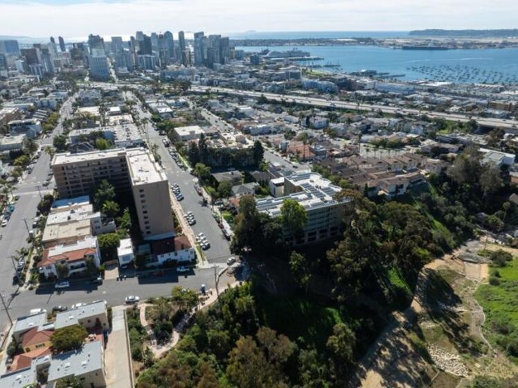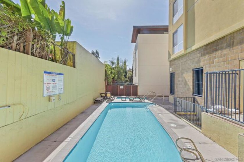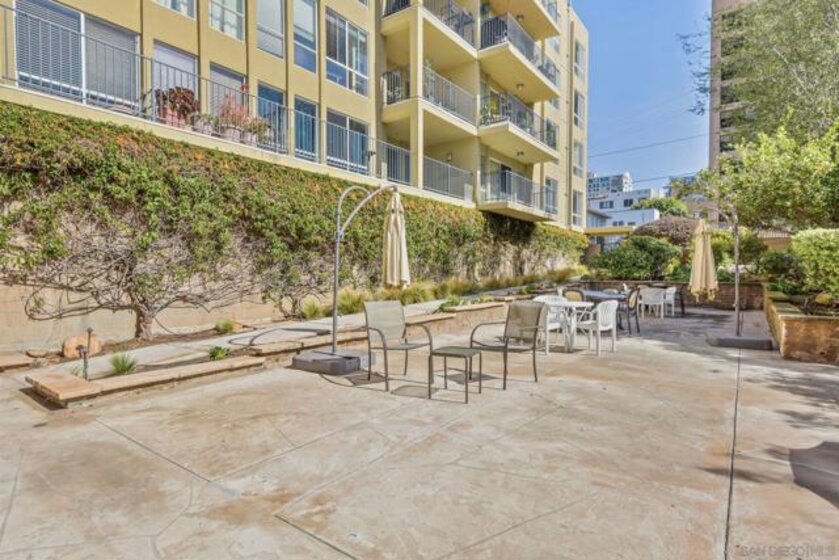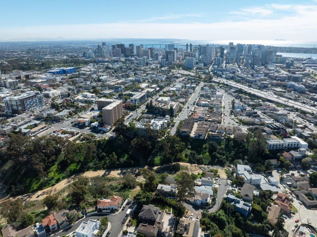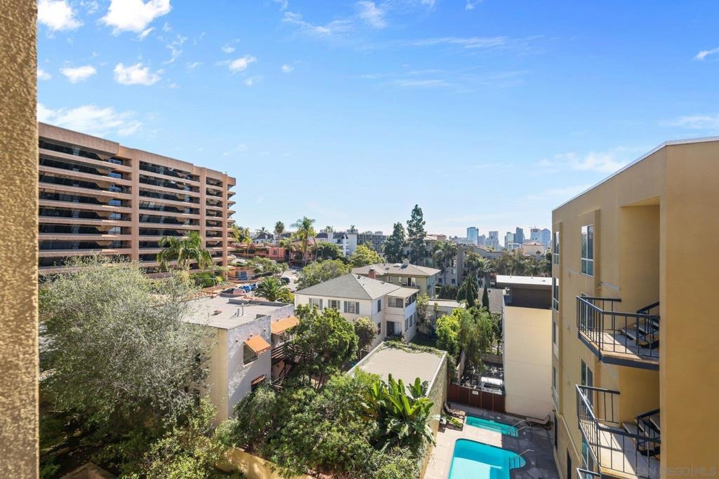 Perched on the top floor of the coveted Villa Bay View community, this appealing condo delivers the best of Bankers Hill living with dramatic sightlines and an ideal location. Step onto the downtown-facing balcony to take in the city skyline and sparkling evening lights, then retreat to two peaceful bedrooms that overlook scenic Maple Canyon and its trails. The open-concept great room creates an easy flow for everyday living and entertaining, complemented by wood flooring throughout. The updated kitchen features stainless steel appliances and a rare walk-in pantry, while a separate laundry room includes a stacked washer and dryer plus built-in shelving for added convenience. The primary suite is enhanced by a custom walk-in closet, while the second bedroom offers an upgraded closet with mirrored floor-to-ceiling doors. With plentiful interior storage, you’re sure to have space for everything. Seller went the extra mile to purchase a second deeded parking space, along with a private electric car charger, plus a dedicated storage cabinet in the secure garage area. HOA amenities include a refreshing pool and spa, an outdoor common area perfect for relaxing and socializing, and gated entry for added peace of mind. HOA is also looking into building improvements, seller is considering contribution towards assessment. Conveniently located minutes to downtown San Diego, the airport, Little Italy, Balboa Park, and nearby canyon hiking trails, this remarkable condo makes city life feel truly effortless.