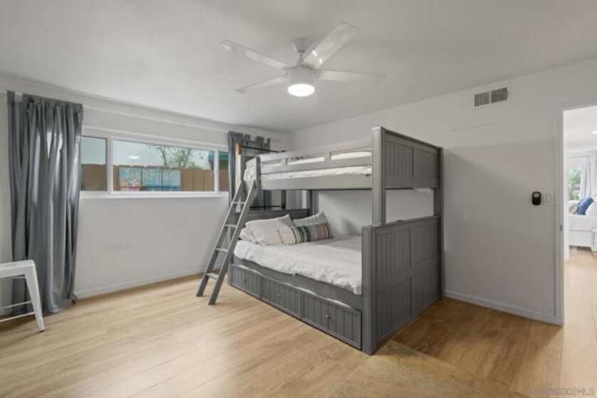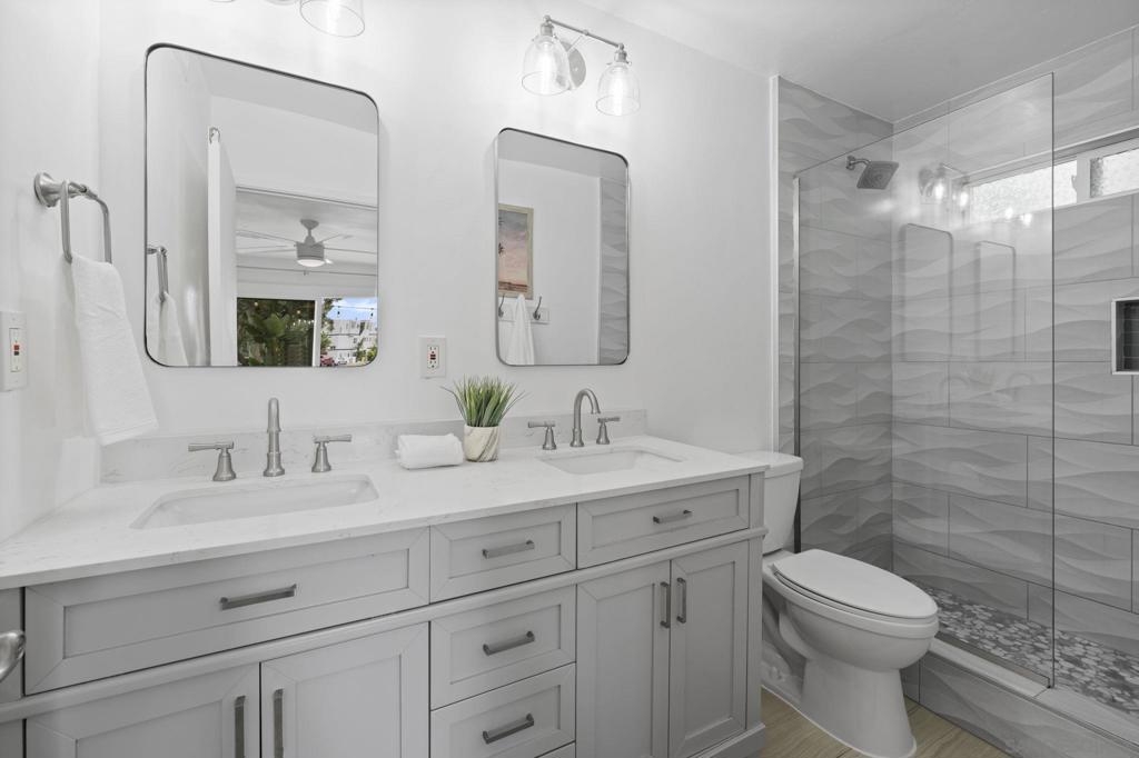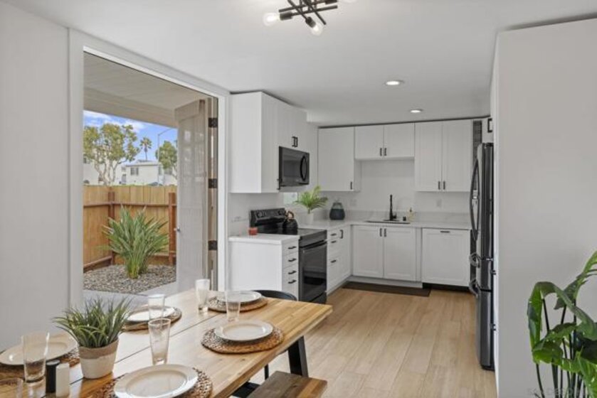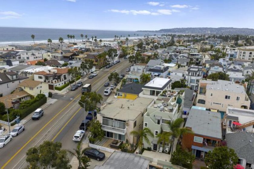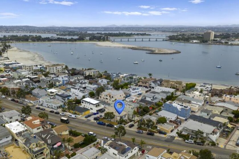 Welcome to this modern interior designed single level beach home. You will love the spacious two-bedroom, two-bath which was completely renovated in 2022. The open-concept layout creates an expansive great room that is ideal for both relaxing and entertaining. The gourmet kitchen features premium white cabinetry, stone countertops, and black stainless steel appliances. The living space extends outdoors to a huge private patio area, providing a seamless indoor-outdoor lifestyle. Primary bathroom has dual vanities and both bathrooms have custom, built-in showers. This home comes fully equipped with high-end furnishings, a rare bonus for the new owner or vacation rental. Full washer/dryer in the closet. It includes two dedicated parking spaces: a one-car garage plus one assigned spot.You are steps away from the sandy beaches, Belmont park and a quick drive to Seaworld and downtown. No HOA fee.