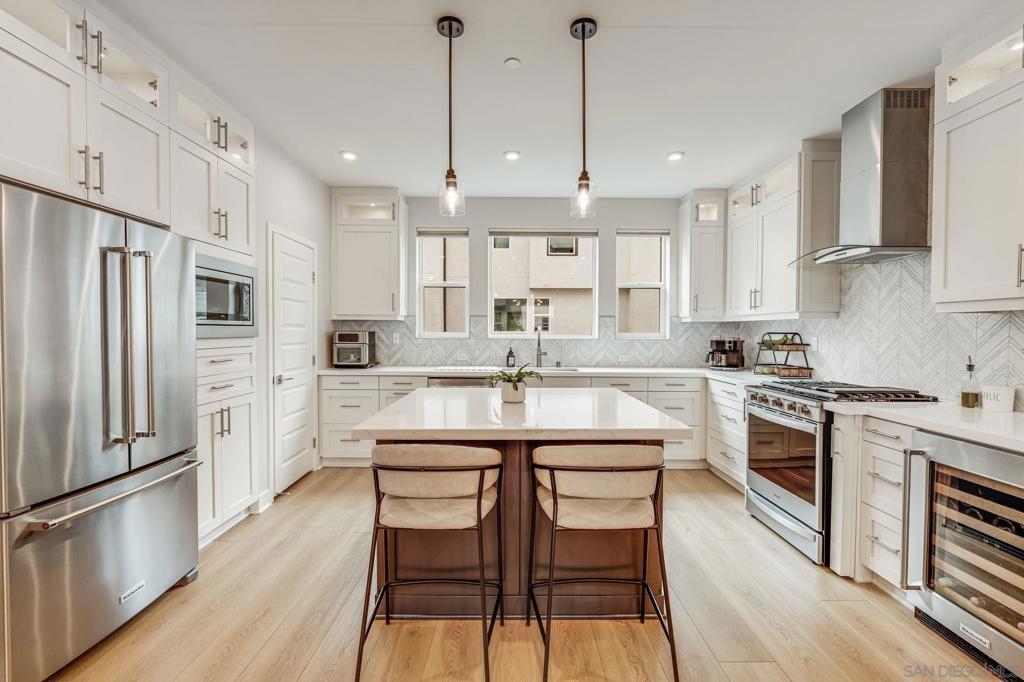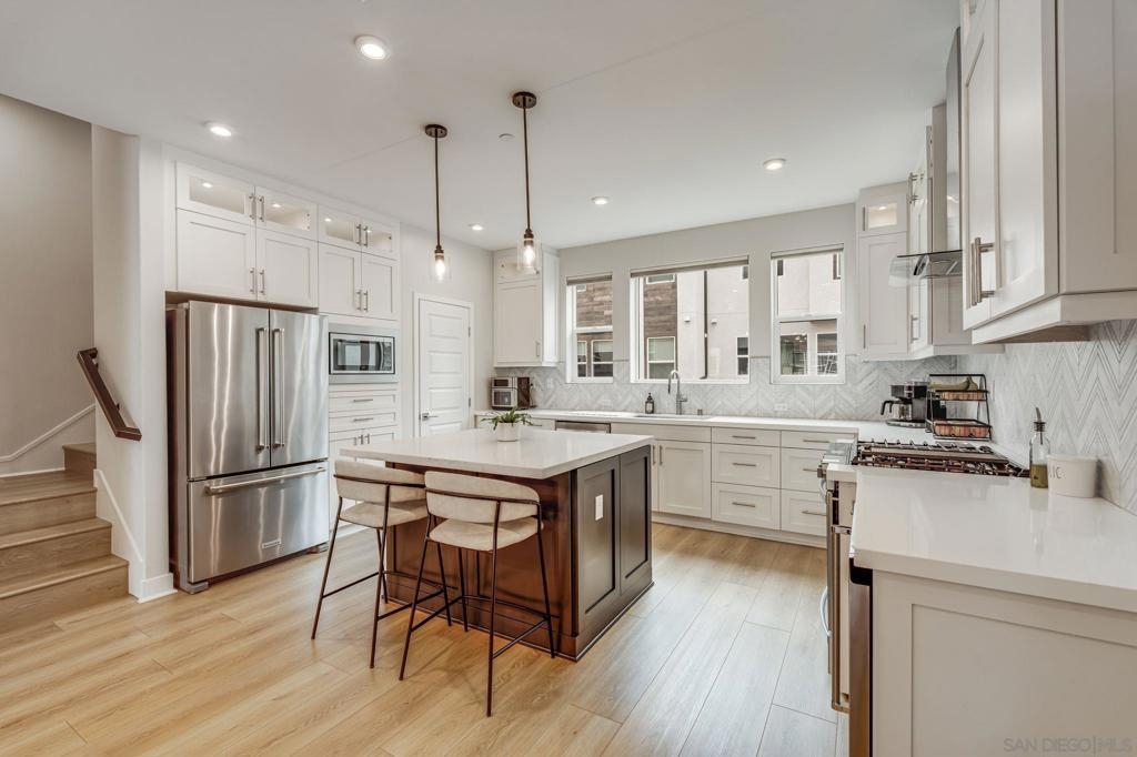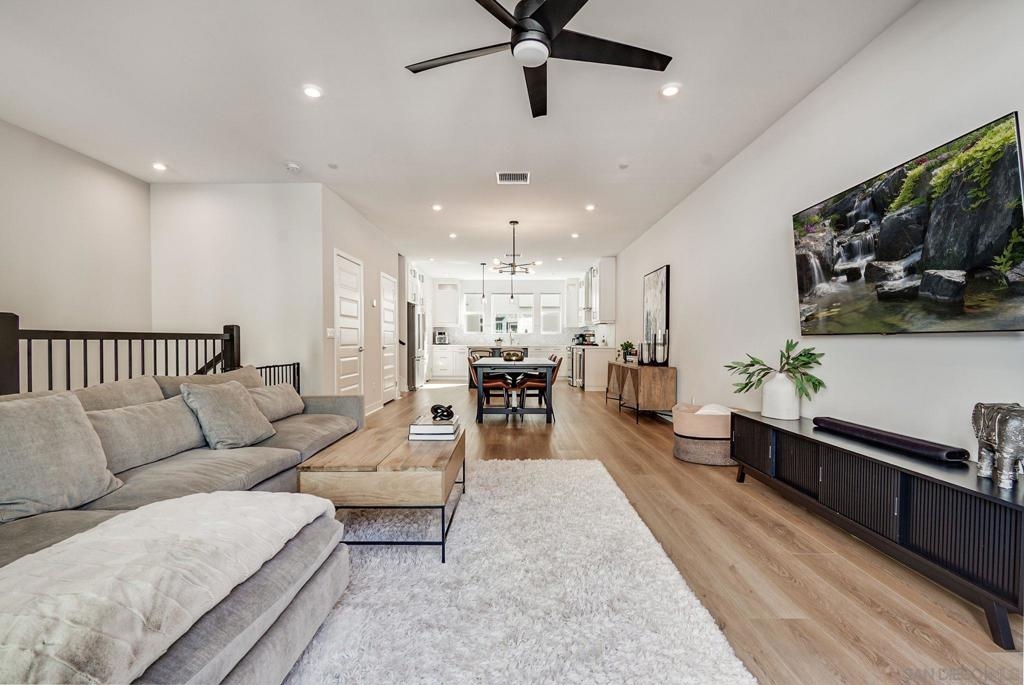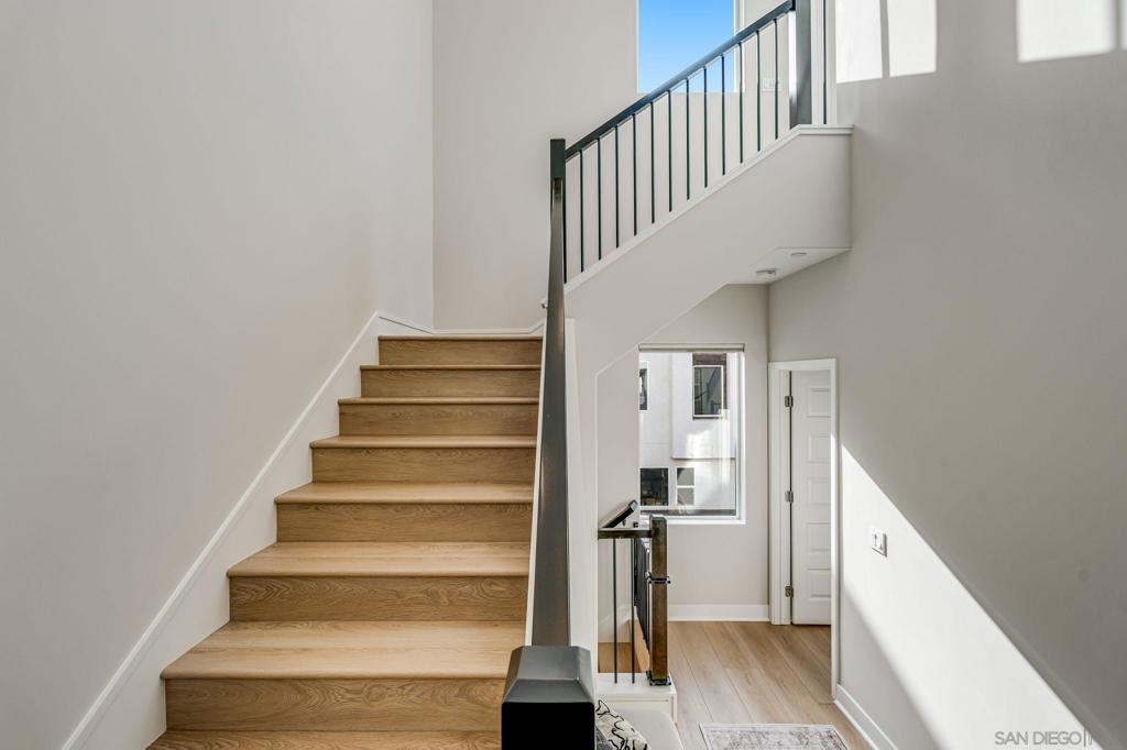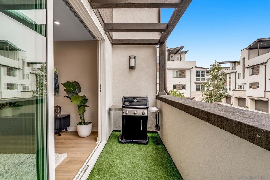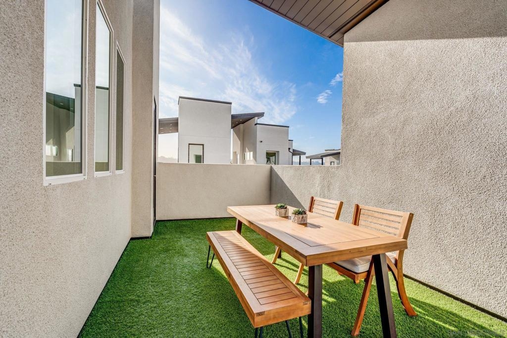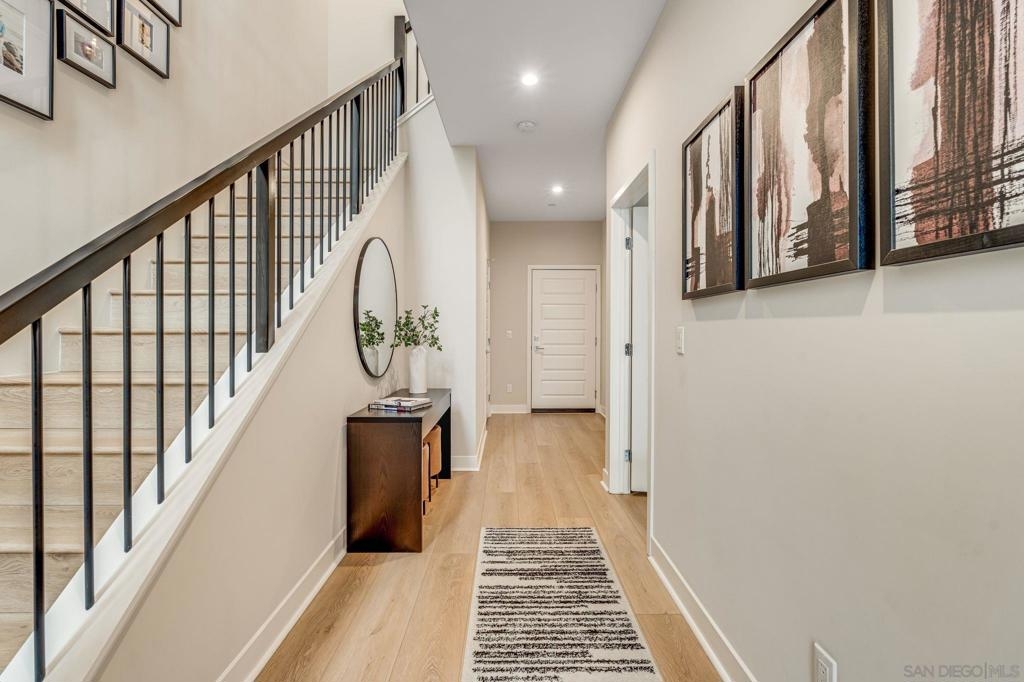 Welcome to elevated living in Avella at Civita, where style meets convenience in Mission Valley’s most sought-after community. This bright and beautifully upgraded 3-bedroom, 3.5-bath townhome is not only move-in ready—it’s the best value currently available in Civita. The flexible entry-level layout includes a private bedroom and full bath—ideal for guests, remote work, or a personal studio. Head upstairs to an open-concept main floor featuring a chef-inspired kitchen with quartz countertops, premium appliances, a wine fridge, walk-in pantry, and generous storage. A half bath and inviting dining space make it perfect for everyday living or entertaining. The third level offers two tranquil bedroom suites, including a spacious primary retreat with modern finishes and a thoughtfully designed layout. Throughout the home, enjoy luxury vinyl plank flooring, smooth drywall finish, a first-floor walk-in shower conversion, and a multi-zone HVAC system for personalized comfort. Unwind or entertain on the expansive rooftop deck with stunning south-facing views—your private escape under the sky. Located steps from the Civita Recreation Center, enjoy resort-style amenities like two heated pools, spas, a top-tier fitness center, multiple parks, walking trails, a dog park, and vibrant social spaces. All this, just moments from shopping, dining, and freeway access. This is Civita living at its finest—don’t miss your chance to call this gem home!