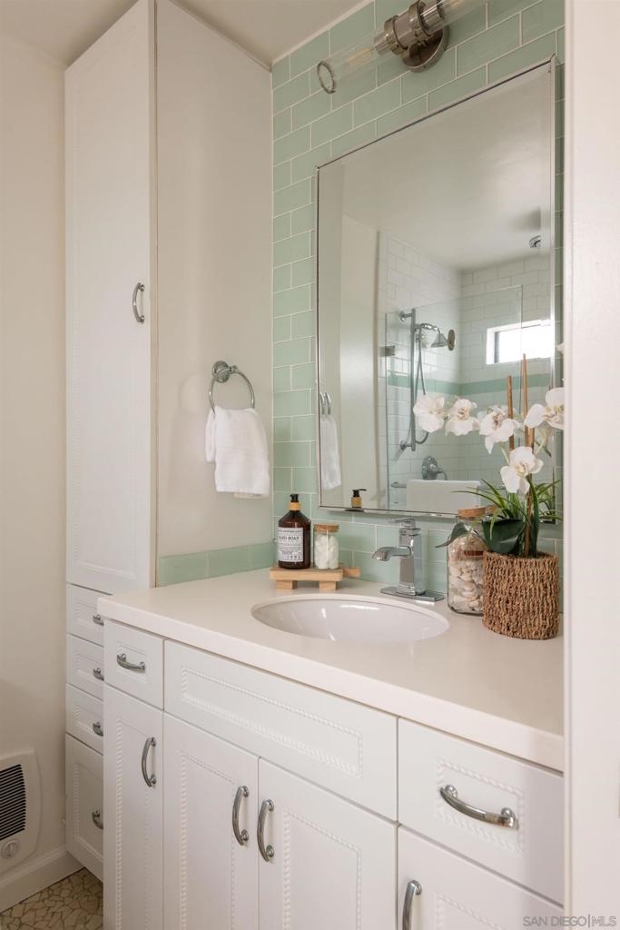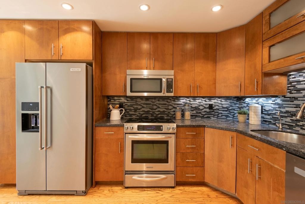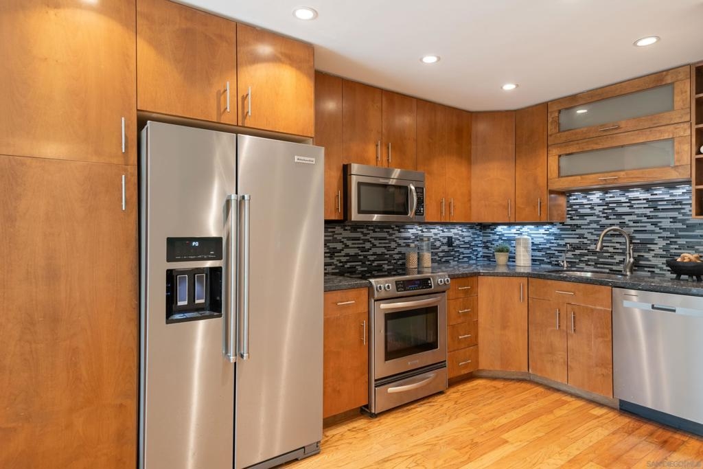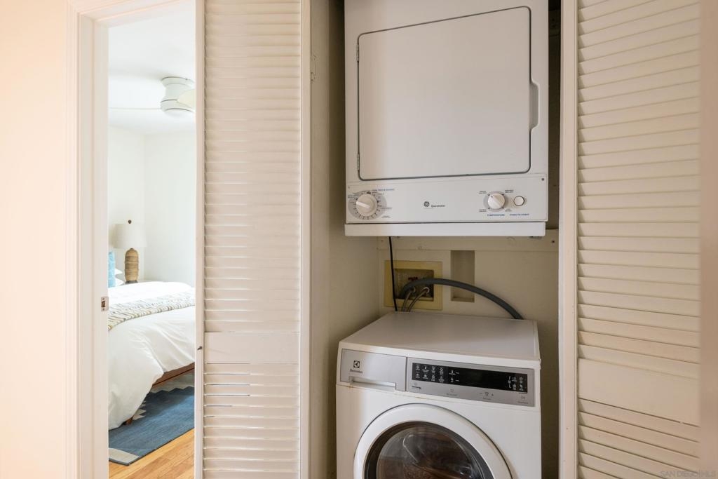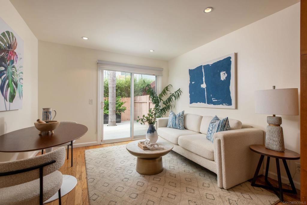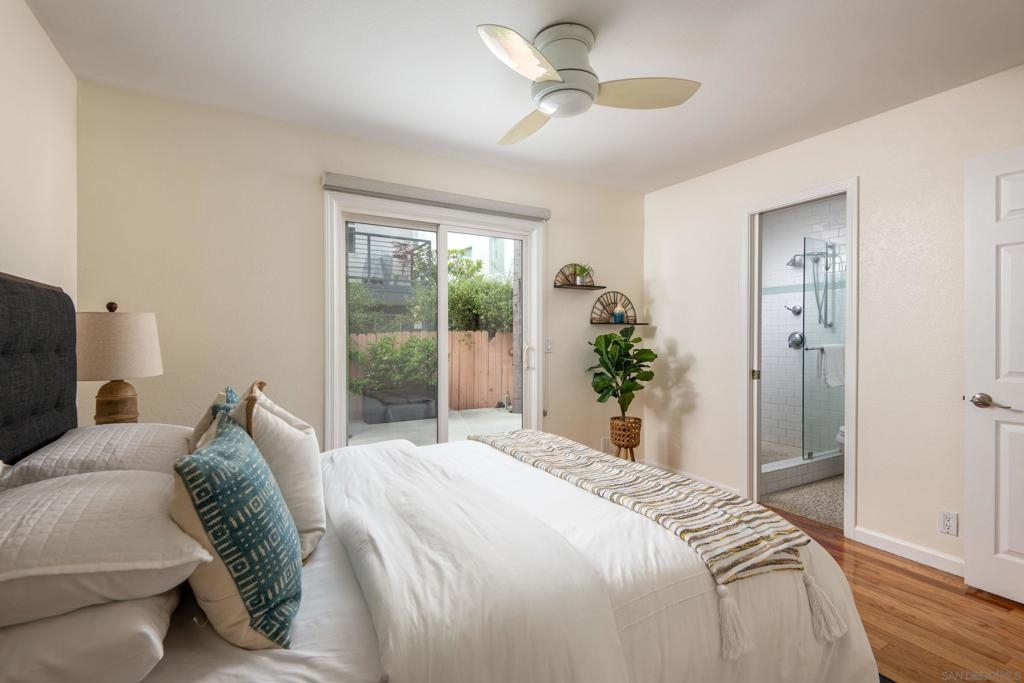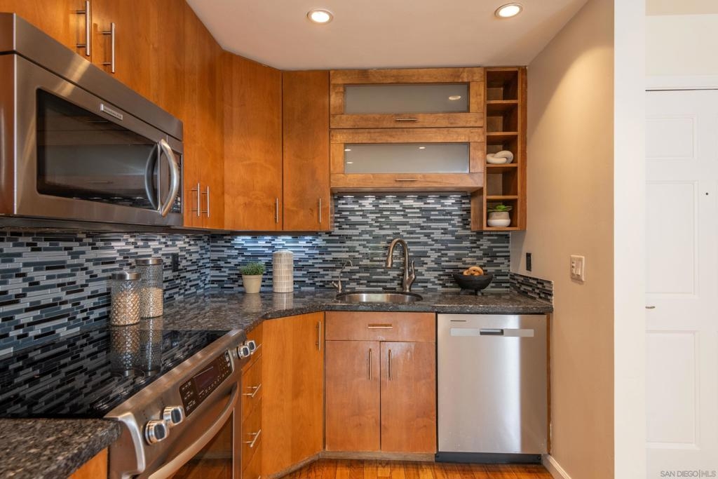 Located in the heart of Point Loma Village, just blocks from the harbor, this tastefully upgraded 2-bedroom, 2-bathroom condo is a rare find. Impeccably maintained and move-in ready, it blends modern finishes with coastal charm. The designer kitchen boasts rich wood cabinetry, granite countertops, a stylish glass tile backsplash, and stainless steel appliances. Throughout the home, you’ll find hardwood flooring, recessed lighting, interior panel doors, and ceiling fans—elevating the overall sense of comfort and sophistication. The primary suite includes a convenient step-in shower, while the second bathroom is beautifully appointed with a unique swirled granite countertop. A dedicated indoor laundry area with space-saving stackable units enhances day-to-day ease. Step outside to an oversized private patio, finished with decking and surrounded by lush tropical landscaping—complete with palm trees and vibrant greenery. It’s an ideal space for entertaining guests or enjoying peaceful evenings in the ocean air. Both the living room and primary bedroom offer direct access to this serene outdoor retreat through sliding glass doors. Additional highlights include 2 secured parking spaces and a prime location. Take a short stroll to Shelter Island for waterfront dining or live music, browse the shops at Liberty Station, or visit nearby Fisherman’s Landing. With convenient access to the airport and public transportation, you’re also just minutes from Fleetridge, Roseville, and central Point Loma.