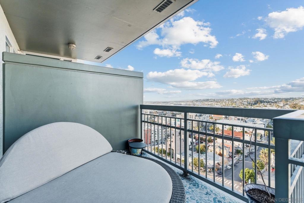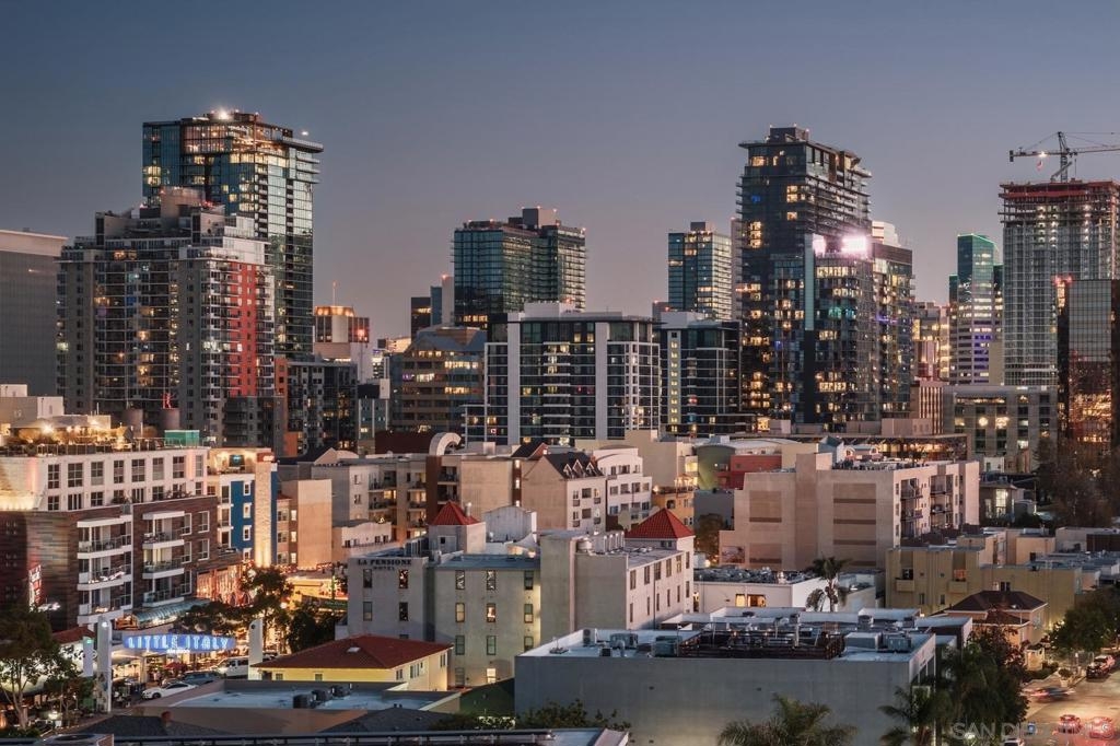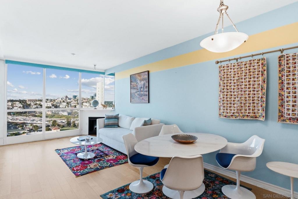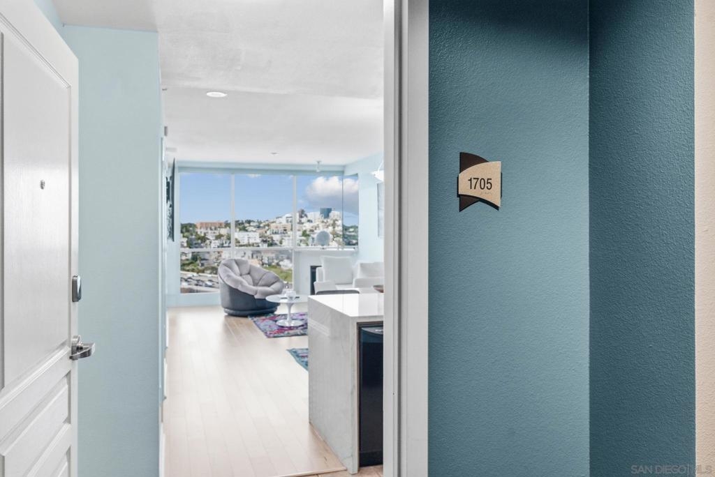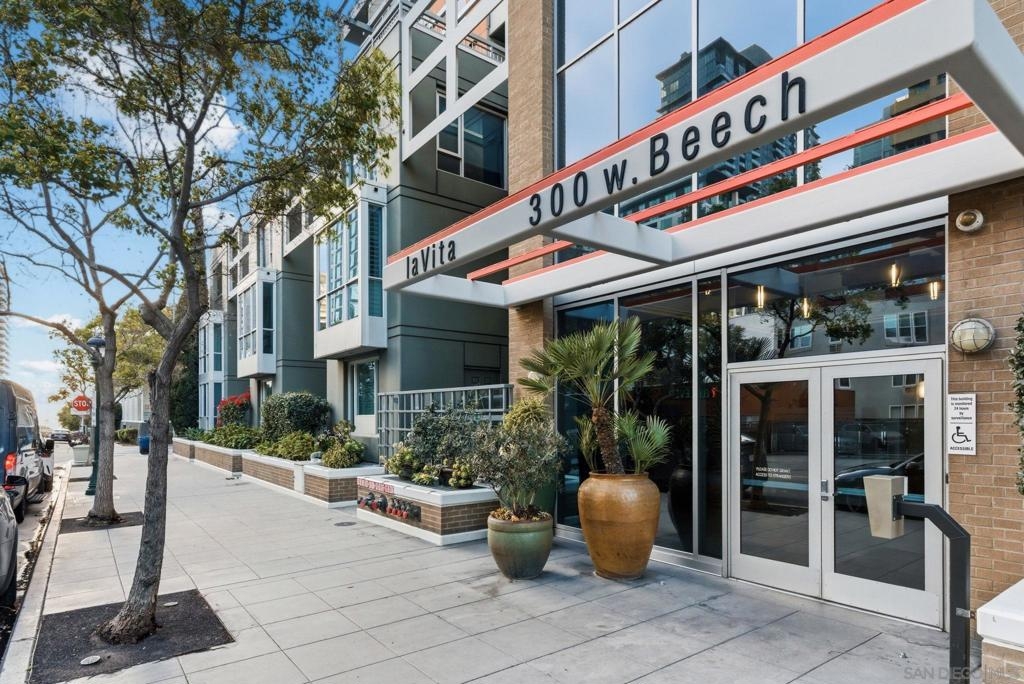 Exceptional one bedroom residence atop of La Vita, in the heart of Little Italy! Expansive floor-to-ceiling windows frame breathtaking panoramic views from the 17th floor, showcasing the bay and waterfront, Little Italy, Balboa Park, and distant mountain vistas. The desirable north-facing orientation fills the residence with natural light while capturing the dynamic cityscape below. Recently remodeled, the home features natural maple engineered hardwood flooring throughout, a stunning backlit translucent quartzite waterfall countertop and an oversized pantry offering exceptional storage. A cozy fireplace anchors the light-filled, glass-enclosed living space, extending to a generous patio perfect for indoor–outdoor enjoyment. Residents of La Vita enjoy resort-style amenities including a heated pool and spa, fitness center, and community room. The award-winning courtyard — affectionately referred to by residents as “Heaven on Earth” — creates a serene oasis in the middle of the city. Courtyard amenities include three separate private barbecue areas, cleaned daily by La Vita staff, offering an impeccably maintained outdoor experience. Perfectly situated in the heart of Little Italy, La Vita offers one of the neighborhood’s most coveted locations — placing you just steps from San Diego’s best dining, cafés, and vibrant street life. Directly across the street sits local favorite Pappalecco, beloved for its authentic Italian espresso, gelato, and lively European atmosphere. La Vita's prime setting delivers the quintessential Little Italy lifestyle right outside your door.