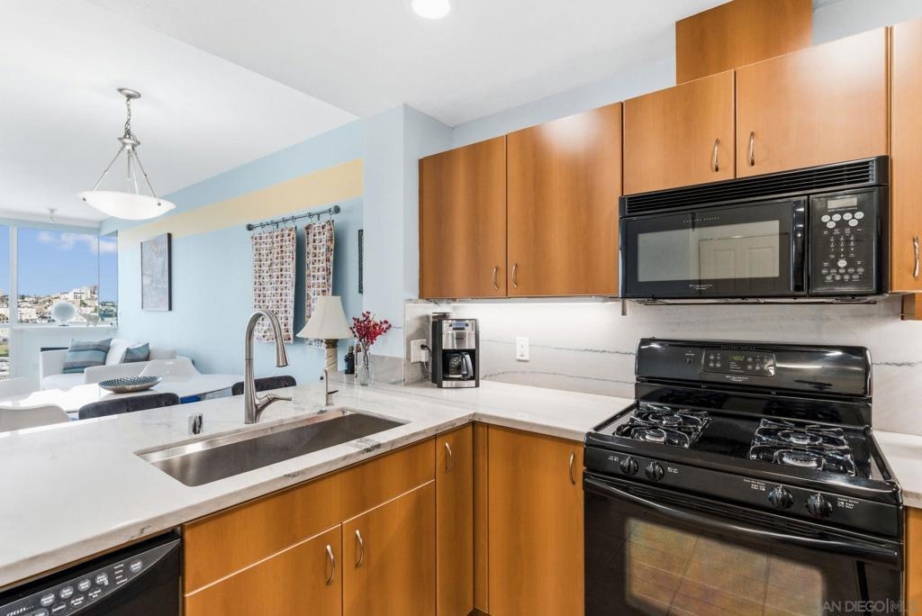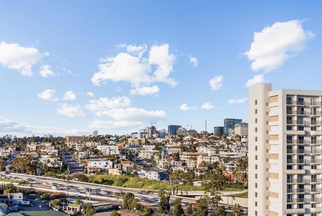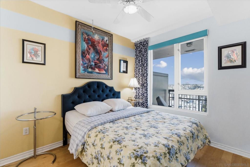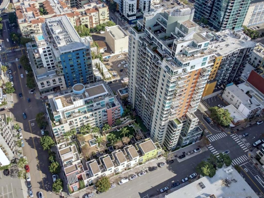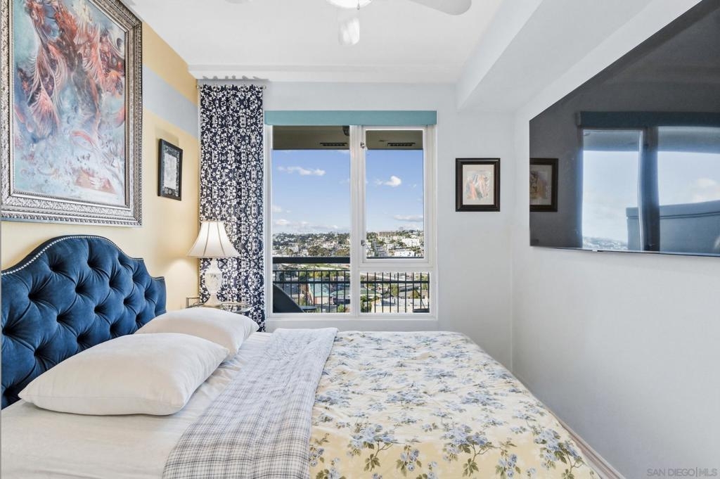 Exceptional one bedroom residence atop of La Vita, in the heart of Little Italy! Expansive floor-to-ceiling windows frame breathtaking panoramic views from the 17th floor, showcasing the bay and waterfront, Little Italy, Balboa Park, and distant mountain vistas. The desirable north-facing orientation fills the residence with natural light while capturing the dynamic cityscape below. Recently remodeled, the home features natural maple engineered hardwood flooring throughout, a stunning backlit translucent quartzite waterfall countertop and an oversized pantry offering exceptional storage. A cozy fireplace anchors the light-filled, glass-enclosed living space, extending to a generous patio perfect for indoor–outdoor enjoyment. Residents of La Vita enjoy resort-style amenities including a heated pool and spa, fitness center, and community room. The award-winning courtyard — affectionately referred to by residents as “Heaven on Earth” — creates a serene oasis in the middle of the city. Courtyard amenities include three separate private barbecue areas, cleaned daily by La Vita staff, offering an impeccably maintained outdoor experience. Perfectly situated in the heart of Little Italy, La Vita offers one of the neighborhood’s most coveted locations — placing you just steps from San Diego’s best dining, cafés, and vibrant street life. Directly across the street sits local favorite Pappalecco, beloved for its authentic Italian espresso, gelato, and lively European atmosphere. La Vita's prime setting delivers the quintessential Little Italy lifestyle right outside your door.