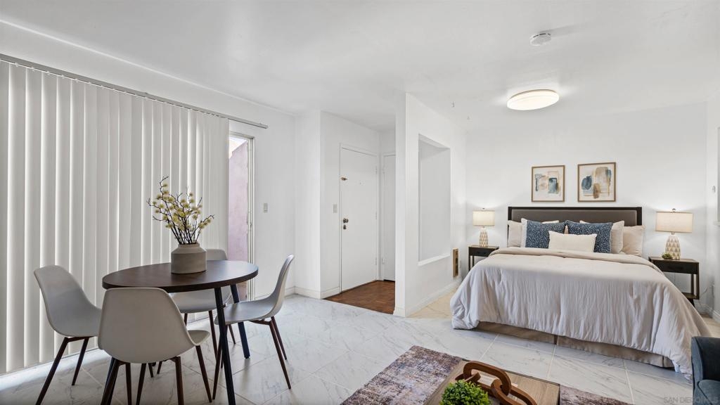 A charming STUDIO positioned in an upstairs unit; offering a bright open-concept, a spacious layout, and designed for both comfort and functionality. A full size kitchen and full bathroom provide both style and practicality, while a generous closet features approximately 10 feet of hanging space along with 6-foot-wide built-in drawers for exceptional storage. Set within a lush, well-maintained community, residents enjoy expansive grassy areas along with amenities including a pool, laundry facilities, and a recreation room. Located in the vibrant Linda Vista neighborhood. One block walking distance to Mesa College and short walk to Sharp Hospital, this home offers unmatched convenience with easy access to shopping, dining, beaches, and major freeways, making it an ideal opportunity for commuters, students, or those seeking a low-maintenance lifestyle in a central San Diego location.