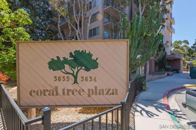 Embrace vibrant city living in this light-filled northwest-corner residence at Coral Tree Plaza, where airy spaces and modern style define everyday comfort. Sunlit and inviting, the expansive living area features sleek engineered wood flooring, custom built-ins, and seamless access to an oversized balcony—an ideal spot to entertain or simply savor San Diego’s signature climate and peaceful city views. The kitchen shines with quartz counters, subway-tile backsplash, contemporary white cabinetry, Bosch appliances, recessed and pendant lighting, a large pantry, and tile flooring. Originally a 3-bedroom layout, the generous bonus den/office can be easily re-enclosed to create a true third bedroom. The primary suite includes a spacious custom walk-in closet, complemented by a convenient wall of built-ins concealed behind mirrored doors that catch and reflect the day’s sunset. The tastefully updated bath features quartz counters, dual vanities, thoughtfully designed cabinetry, and a walk-in shower. The guest bath offers a modern pedestal sink, stylish sconce lighting, a walk-in shower, and ample built-in storage. In addition to a dedicated laundry closet, you'll find a large utility closet offering even more storage. Other highlights include side-by-side parking near the elevator and a dedicated storage cage. Just moments from Balboa Park and some of Hillcrest's best establishments, this condo balances the comfort of a home retreat with the vibrancy of city life. As one of Hillcrest’s long-established residential communities, Coral Tree Plaza offers generous grounds and a well-maintained collection of amenities. Residents enjoy a swimming pool and spa, convenient on-site fitness room, and tennis court. The huge community club room, with its vintage-style fireplace, is an inviting spot for gatherings, ping pong, reading, and the like. The property also features beautiful landscaping, surface guest parking, guest suites, a beloved dog run, and comfortable lobby areas. A block and a half from the back gate, you’ll find yourself in Balboa Park. You’re just as likely to discover a favorite eatery to walk to. Enjoy easy access by car to Downtown, the airport, Mission Valley, and more. Coral Tree Plaza blends home-like comfort with a truly walkable urban lifestyle connected to the best of San Diego.