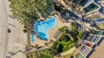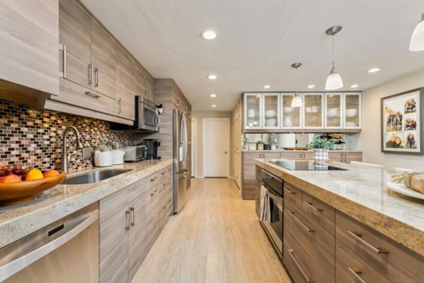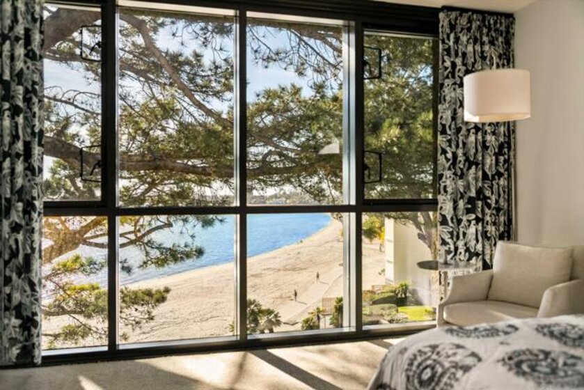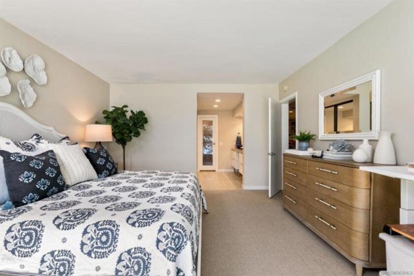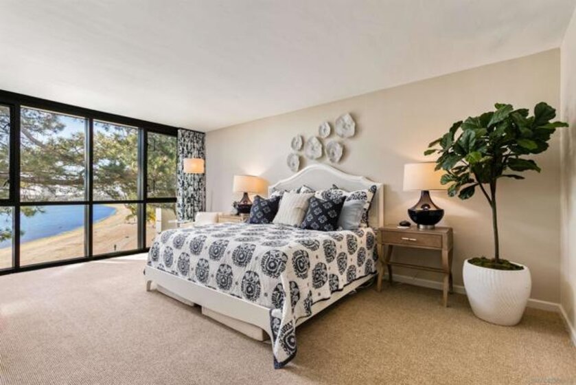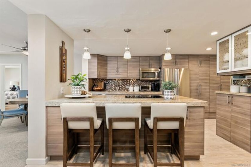 Crowning the shoreline of Sail Bay, this exceptional penthouse in Bay Scene offers a great opportunity to experience refined waterfront living with sweeping southwest views of the bay and Pacific horizon. Located in the coveted Tower One and set on the top floor, this residence captures breathtaking panoramas framed by a majestic 150-year-old Torrey Pine, with vistas extending across the bay and toward the ocean from the living room, dining area, kitchen, and both bedrooms. Spanning approximately 1,559 square feet, the meticulously renovated two-bedroom, two-bathroom floor plan is thoughtfully designed to maximize views, privacy, and functionality. With no shared living-area walls, the home offers exceptional peace and quiet. The intelligent layout provides ideal bedroom separation, a spacious in-unit laundry room, and additional storage for effortless everyday living. Timeless, elegant finishes define the interiors. The beautifully remodeled kitchen showcases marble countertops, soft-close cabinetry, and stainless-steel appliances—including refrigerator, dishwasher, and microwave—blending style and performance. A covered balcony extends the living space outdoors, creating the perfect setting to relax and take in the coastal scenery. This residence includes two assigned underground parking spaces and access to a convenient car-washing area within the secure garage. Bay Scene is Sail Bay’s premier bayfront condominium community, offering resort-style amenities designed for a truly elevated lifestyle: a heated waterfront pool and spa, BBQ areas, fitness center, clubhouse,