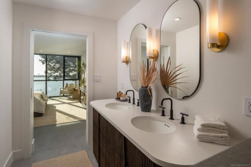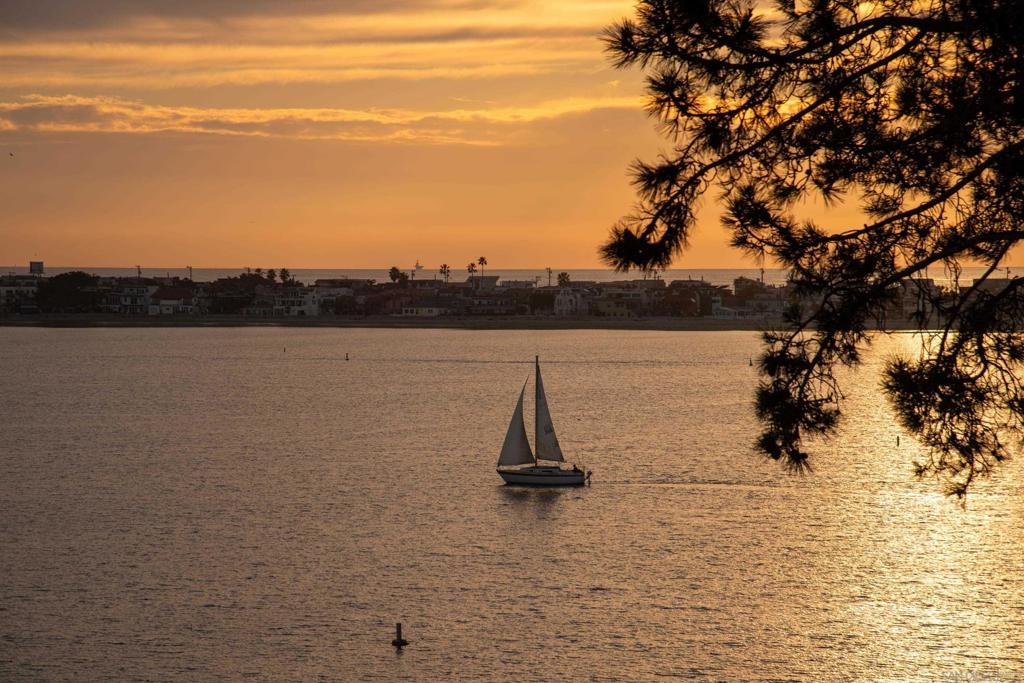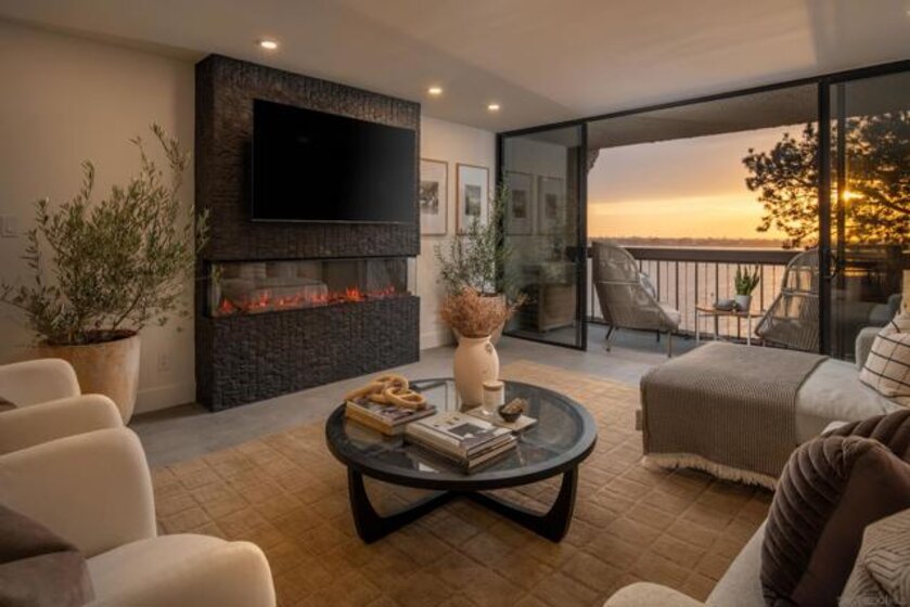 Perched on the top floor of Bay Scene directly on Sail Bay, this rare residence offers one of the most coveted view lines in the community — sweeping western-facing bay vistas with ocean views beyond. Spanning 1,559 square feet, this completely remodeled 2-bedroom, 2-bath home is the ultimate coastal retreat, blending sexy Hawaiian-inspired design with modern beachfront luxury. The open living space is anchored by a dramatic stone-clad fireplace and flows seamlessly into a show-stopping kitchen featuring brand-new contrasting black and warm wood-tone cabinetry, lava rock leather-finish countertops, and sleek black Café Series appliances. Designed for both entertaining and everyday living, the layout captures breathtaking sunsets and shimmering water views from nearly every room. The primary suite is a true sanctuary with a walk-in closet and a spa-inspired bathroom showcasing gorgeous tile work, a Restoration Hardware vanity, and West Elm lighting. The guest bathroom is equally refined with elevated finishes throughout. A dedicated laundry room and generous storage complete the home’s effortless functionality. Residents enjoy resort-style community amenities including a pool, spa, outdoor showers, barbecues, recreation room, and fitness room — perfect for relaxing, entertaining, and embracing the coastal lifestyle. Whether as a full-time residence or the perfect lock-and-leave second home, this home delivers an unparalleled Sail Bay lifestyle — where every day feels like a luxury beachfront getaway.