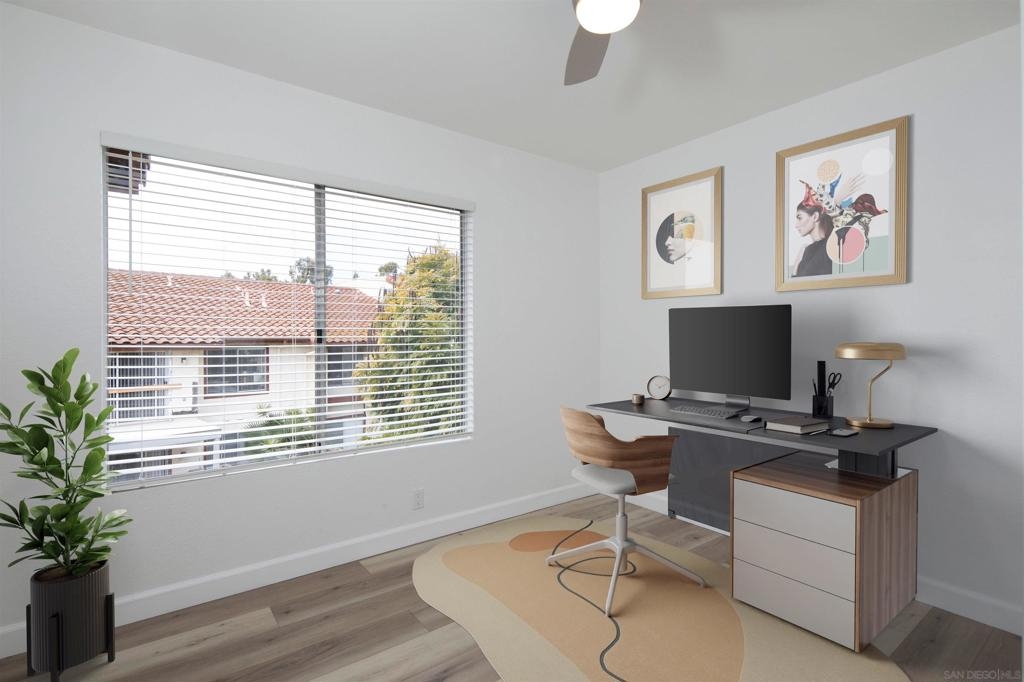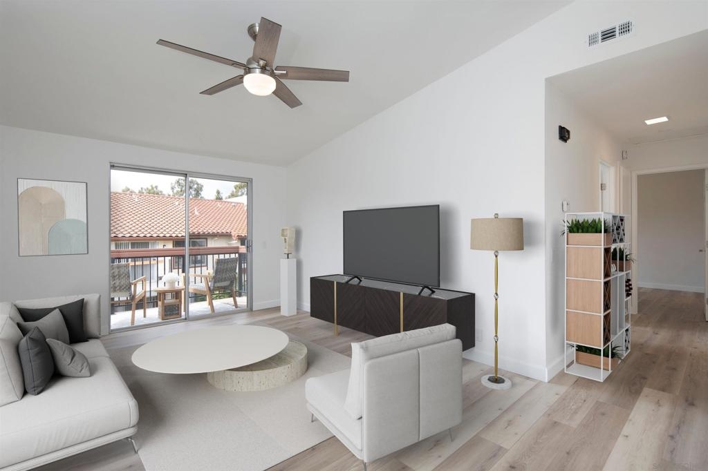 Don't miss this completely remodeled bright and sunny upstairs end unit in the very quiet La Jolla Colony La Paz community. Easy freeway access and minutes to the beach, this unit will sell fast. This stunning 2 bedroom 1 bath condo has undergone a complete transformation! No more popcorn ceilings! The condo is adorned with new flooring throughout, fresh white paint, new doors and hardware, added fans and lighting, new appliances in the kitchen, and new baseboards. The bathroom was completely upgraded with walk-in shower with elegant tile work and two new vanities.The bathroom has separate vanity area for each bedroom for added privacy. This condo offers a stylish and comfortable living environment. The balcony provides a serene setting for relaxing and the second story provides much wanted privacy. Close proximity to the community pool and spa. There are also two parking spaces under a carport with storage. This condo is move in ready!