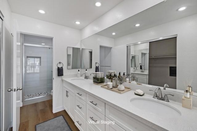 Welcome to this fully renovated upstairs condo in one of UTC’s most sought-after communities. Upon entry, you’re greeted by vaulted ceilings with recessed lighting, a cozy fireplace, dual-pane windows, and luxury vinyl flooring. The modern kitchen features quartz countertops with a breakfast bar extension, upgraded self-closing cabinets/drawers, and new stainless steel appliances. The spacious primary bedroom offers direct balcony access, while the ensuite bathroom boasts dual quartz-topped vanities, a walk-in closet, and a brand-new shower enclosure and toilet. The updated hallway bathroom includes a new vanity, toilet, and tub enclosure. Additional highlights include a one-car garage, one additional parking with permit, in-unit stackable washer/dryer, and access to HOA amenities such as a pool, spa, and tennis courts. Water and trash are included. Perfectly located in the Golden Triangle near I-5, I-805, and SR-52, UCSD, the trolley line, walking distance to UTC shopping and 3 minutes to bus stop. This move-in ready home is a rare find, don’t miss your opportunity!