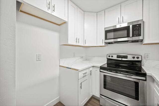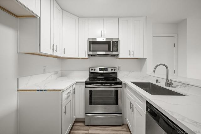 Excellent opportunity to own a first floor end unit studio that was recently remodeled with contemporary flooring, newly painted, GE appliances, a breakfast bar and craftsman style cabinets. There is a surprisingly large walk in closet, a well laid out bathroom with shower over tub, and sliding glass doors leading onto a balcony overlooking a green area. Community features include a pool and spa and a common laundry. Boasting a truly flexible floor plan, this condo is ideal for a homeowner or investor. Enjoy living close to the ocean and take advantage of the shops and dining in Clairemont, Pacific Beach and La Jolla.