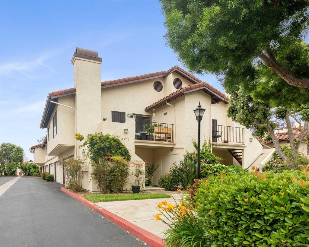 Welcome to 4230 Porte De Palmas #41, a top-floor end unit in a quiet San Diego community. This 2-bedroom, 1-bath condo features an open floorplan with abundant natural light. The remodeled kitchen has granite counters, cherry wood cabinets, stainless steel appliances, and tile flooring. The living room includes wood floors and a cozy fireplace. Modern amenities include recessed lighting, built-in shelves, and air conditioning. The primary bedroom includes a walk in closet, vanity, and washer and dryer in the unit. A detached, private two-car garage is just steps away. The community offers two pools. Located near parks, restaurants, shopping, and grocery stores, this property provides both comfort and convenience. Experience refined living at 4230 Porte De Palmas #41.