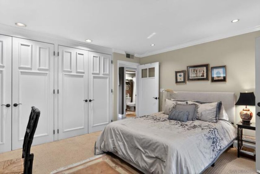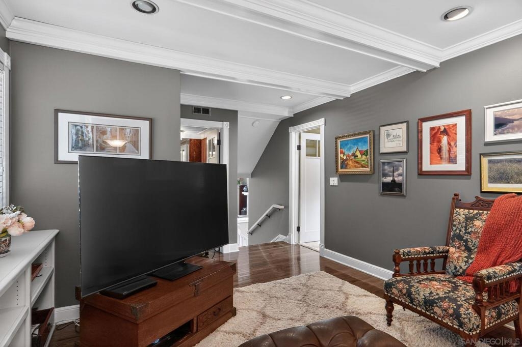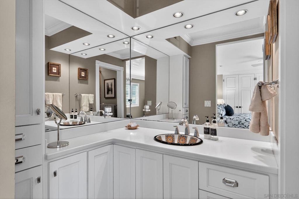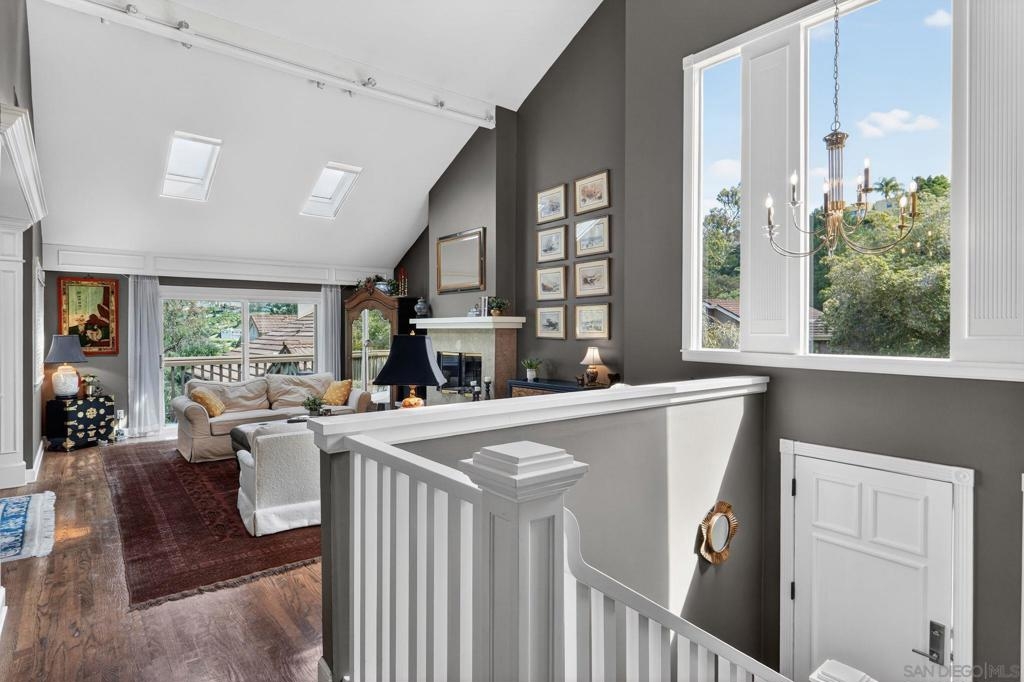 Kensington Park Villas! The best location at the corner of Escena and Pintoresco this detached home (one of the four detached in the complex) is situated near the walking path and the multiple ponds in the heart of the community. Upon entering it is clear to see that this unit is full of extraordinary details. Hardwood floors throughout most of the unit, striking moulding and trim embellishments give this home a custom feel. Lower level has two bedrooms and one full bath. Access to a private patio is off one of these bedrooms. Middle level is the extraordinary living room with vaulted ceiling, skylights and a classic fireplace. Remodeled kitchen, separate dining room and access to the patio through sliding doors taking in the peaceful view. Quiet!! Top level (all short staircases) is the primary bedroom (additional mini split in this room) with ensuite bath and a family room also with another bath. This is easily converted to a fourth bedroom. Complex has two pools, walking paths, club house, an access gate into Kensington proper and is a gated community!