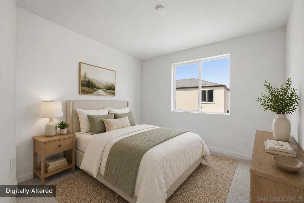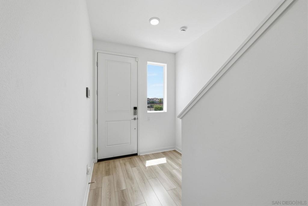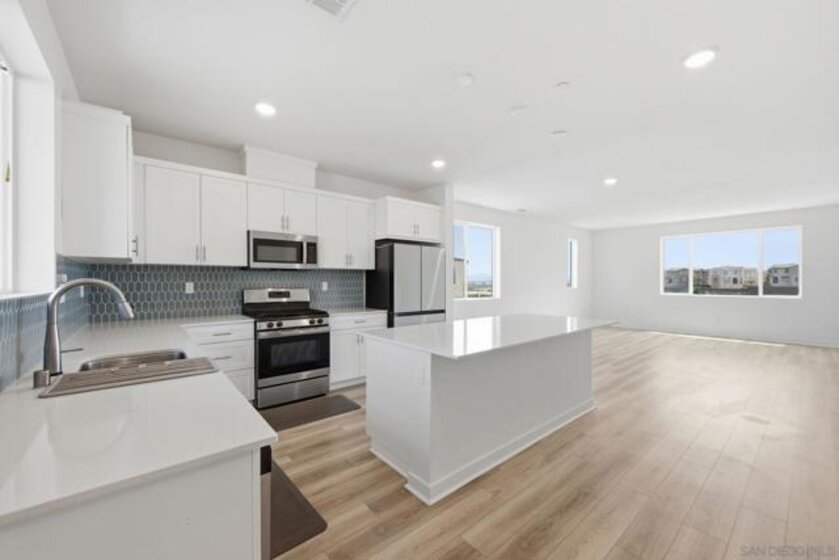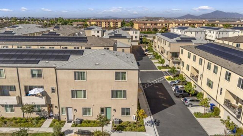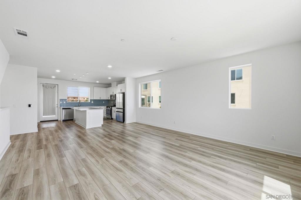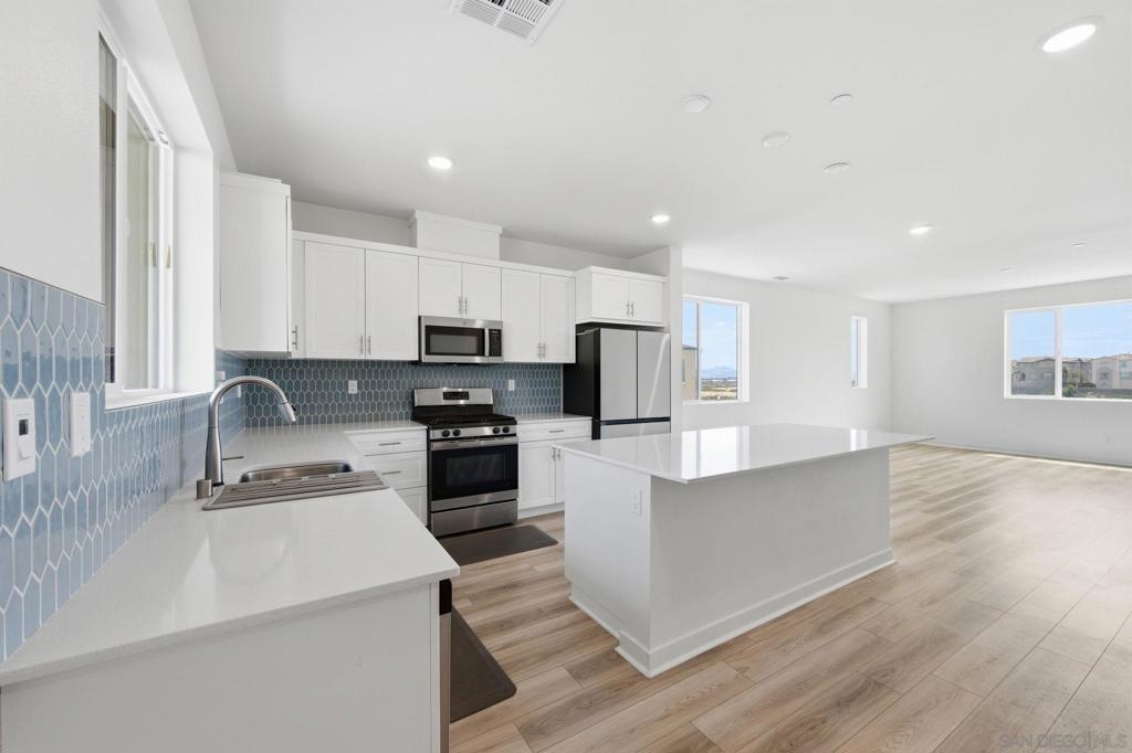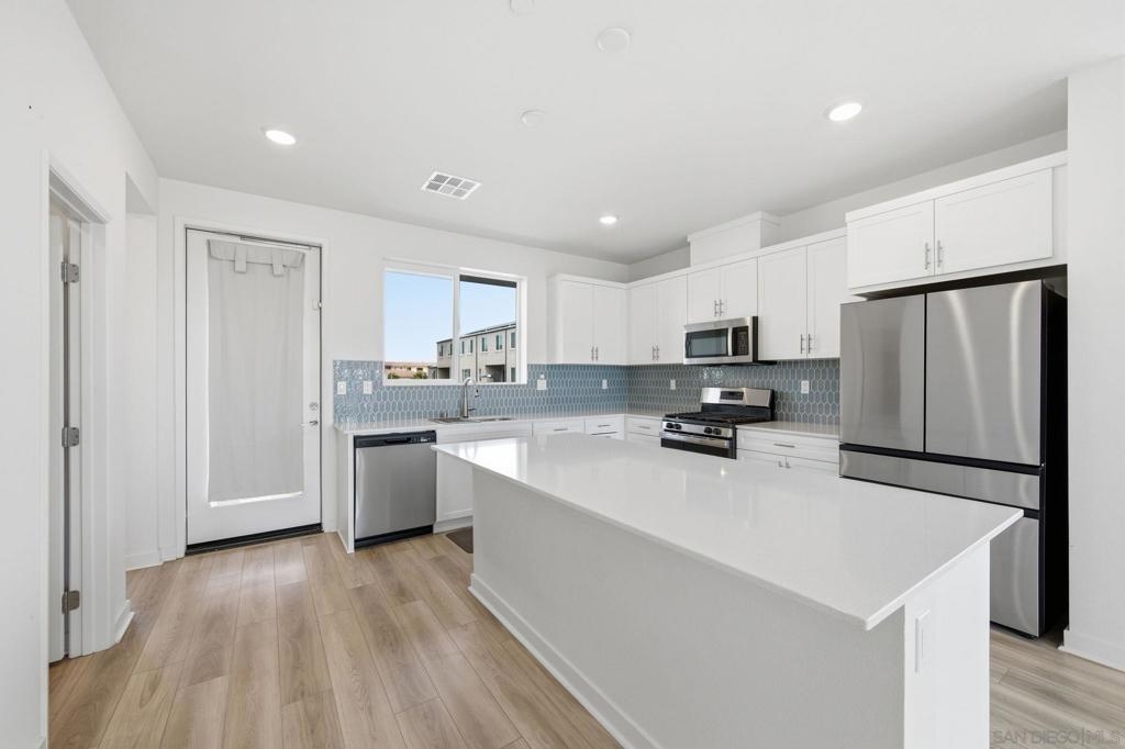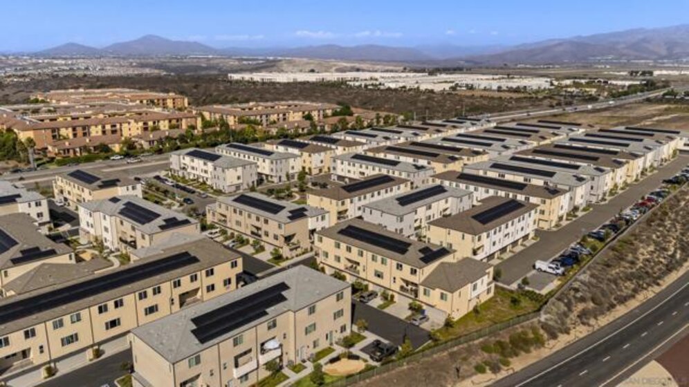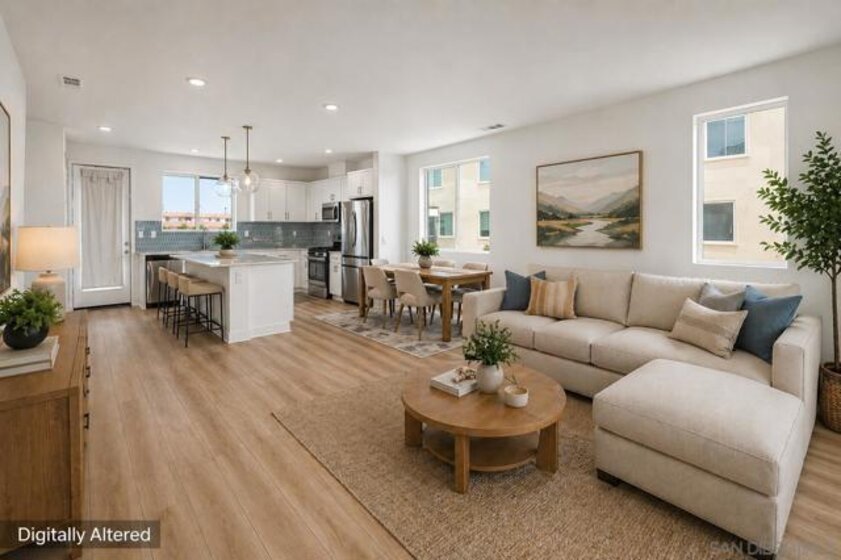 Built in 2024 with fully paid solar, this light-filled corner home in Agualuna offers 4 bedrooms, 3.5 bathrooms, and 1,875 sq ft of flexible living space designed to adapt to your lifestyle. A ground-floor bedroom with full bath provides ideal separation for guests, multi-generational living, a private office, or potential rental use. The main level features soaring ceilings, LVP flooring, and an open-concept layout that blends comfort and functionality. The modern kitchen showcases white cabinetry, quartz countertops, stainless steel appliances, and a striking blue backsplash that adds a bold touch. Step onto your private balcony for morning coffee or to unwind at the end of the day. Upstairs, the spacious primary suite offers a walk-in closet and en-suite bath, along with additional bedrooms and convenient upstairs laundry. As a corner unit, natural light fills every level, enhancing the bright and open feel throughout. Enjoy access to green spaces and a dog run, just minutes from CBX, the border, Imperial Beach, Silver Strand, Otay Valley Regional Park, and Sharp Chula Vista Medical Center. Quick access to the 905, 805, and SR-125 makes commuting effortless. Short sale opportunity, a rare chance to own a newer home with premium features at exceptional value.