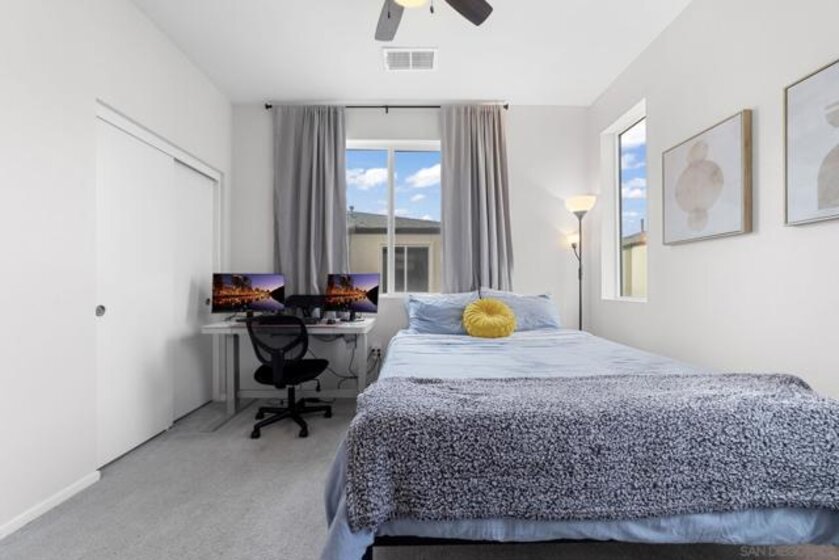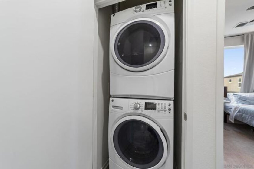 Welcome to 5502 Sandcliff Lane #147, a stunning corner end-unit Solmar Plan 2 model home—one of the last model homes sold in the sought-after Playa del Sol community and VA financing approved! This beautifully upgraded residence features 2 bedrooms, 2.5 baths, and a 2-car garage across approximately 1,310 sq. ft. of thoughtfully designed living space. Step inside to an open-concept main level filled with natural light, highlighted by a sleek modern kitchen with stainless steel appliances, quartz countertops, a large center island, and designer cabinetry. The primary suite includes a spa-like ensuite bath with dual vanities and a generous walk-in closet, while the secondary bedroom offers flexibility for guests, family, or a home office. Enjoy smart-home features including smart switches, smart garage door, and smart water heater for modern convenience. The community boasts resort-style amenities—an impressive clubhouse with a state-of-the-art gym, a heated pool complex with spa and hot tub, and two clubhouses (one for everyday use and another available for private events). Ideally located near shopping, dining, entertainment, and top-rated schools, with easy access to the 805 and 905 freeways, this home offers the best of modern South San Diego living—stylish, smart, and community-focused.