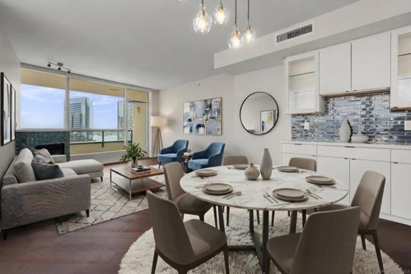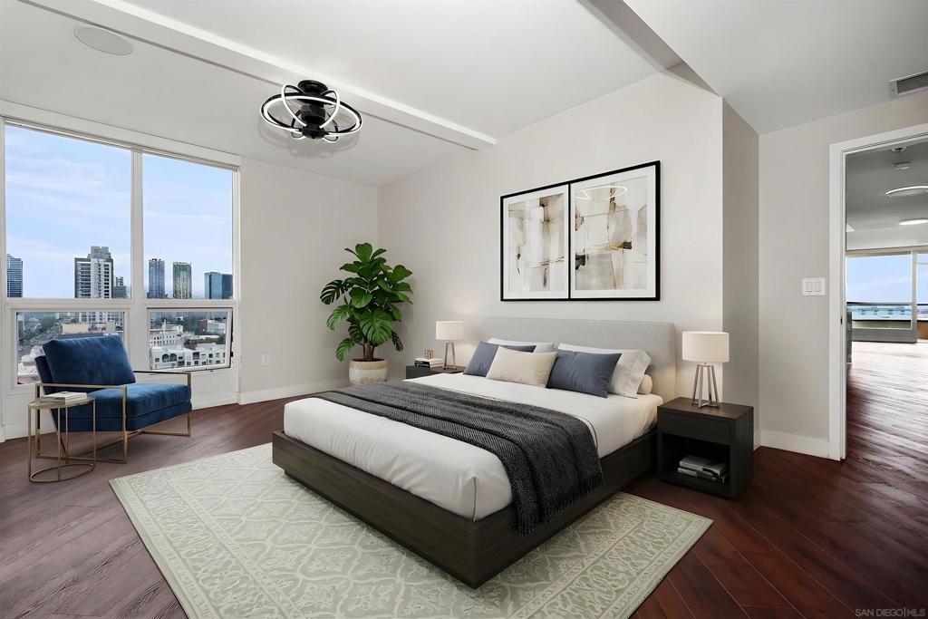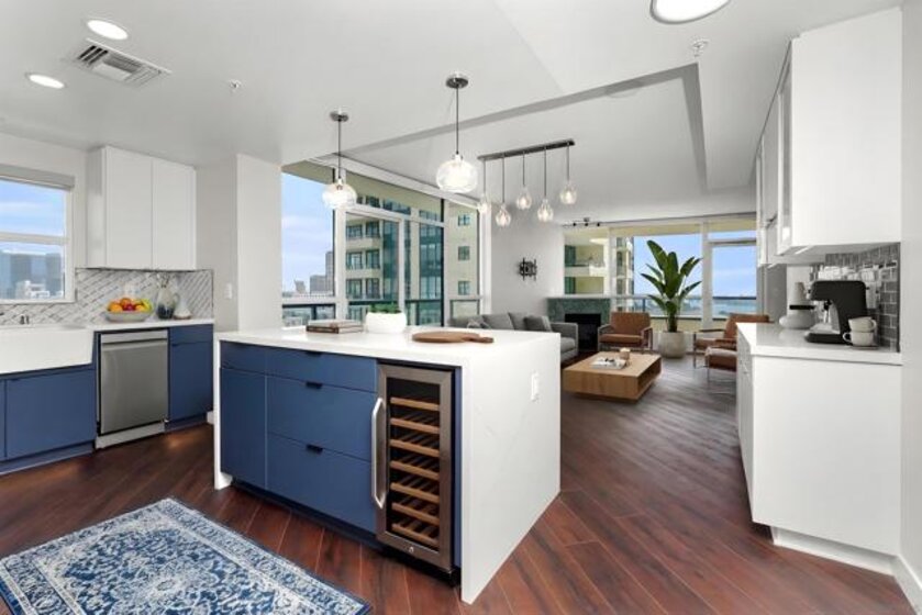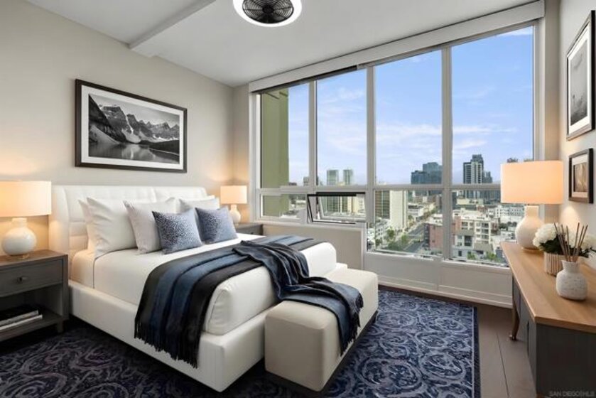 Panoramic Bay, Ocean, and City views take center stage in this beautifully remodeled Marina District residence. This spacious 2-bedroom, 2-bath home features two private view patios perfectly positioned for stunning water vistas and seamless indoor-outdoor living. Over $200,000 in upgrades (2023) include custom cabinetry, continuous flooring, and updated lighting and plumbing. The designer kitchen offers quartz countertops, stylish tile, a generous pantry, and high-end smart appliances. Additional highlights include a custom walk-in closet, fireplace, blackout shades, and two secured parking spaces with EV chargers. A rare, turnkey, view-focused opportunity in the heart of the Marina District. Ideally located in the heart of the Marina District, Horizons offers an unbeatable downtown lifestyle just steps from the New Children’s Museum, Martin Luther King Jr. Promenade, Seaport Village, Petco Park, the Gaslamp Quarter, San Diego Bay, and the Marina. A children’s park and dog park are located directly behind the community. Resort-style amenities include a pool, spa, BBQ area, fitness center, concierge, security, billiard room, conference and club rooms, and 16 guest parking spaces. Everyday convenience is built in with retailers just an elevator ride away, including a bank, dry cleaner, Postal Annex, coffee shop, and more. The building has been refreshed with beautifully remodeled lobbies, upgraded hallways, and new unit doors with keypad access, all within walking distance to transit, dining, shopping, and Ralphs Signature Market.