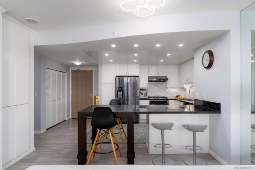 Situated within the sought-after Horizons North Tower in the heart of the Marina District, this luminous south-facing residence is bathed in natural light and framed by expansive open-sky views with minimal obstructions. Thoughtfully updated throughout, the home showcases new flooring alongside a beautifully refreshed kitchen and baths. The reimagined kitchen features a relocated peninsula that enhances flow and functionality, complemented by upgraded finishes and generous storage. An impressive 250-square-foot entertaining terrace extends the living space outdoors, ideal for morning coffee, sunset dining, or hosting guests. Residents enjoy a full suite of resort-style amenities, including a pool and spa, fitness center, and 24/7 security services, billiard and conference rooms, and guest parking. Just steps from the scenic Martin Luther King Jr. Promenade and Seaport Village, the location offers effortless access to waterfront walking paths, premier dining, boutique shopping, and a 24-hour Ralphs Market. Located in Horizons, in the heart of the Marina District, this bright south-facing unit is filled with abundant natural light and offers open-sky views with minimal obstructions. Beautifully updated, it features new flooring along with a modern kitchen and baths. The kitchen remodel included relocating the island to create a more open-concept layout, complemented by upgraded finishes and ample storage. Step outside to an expansive 250 sq. ft. entertaining deck, ideal for relaxing, dining, or hosting friends. Resort-style amenities include a pool, spa, fitness center, concierge, security, billiard and conference rooms, and guest parking. Just steps from the scenic Martin Luther King Jr. Promenade and Seaport Village, with an array of retailers at your doorstep and walking distance to top-rated restaurants, shopping, and a 24-hour Ralphs Market.