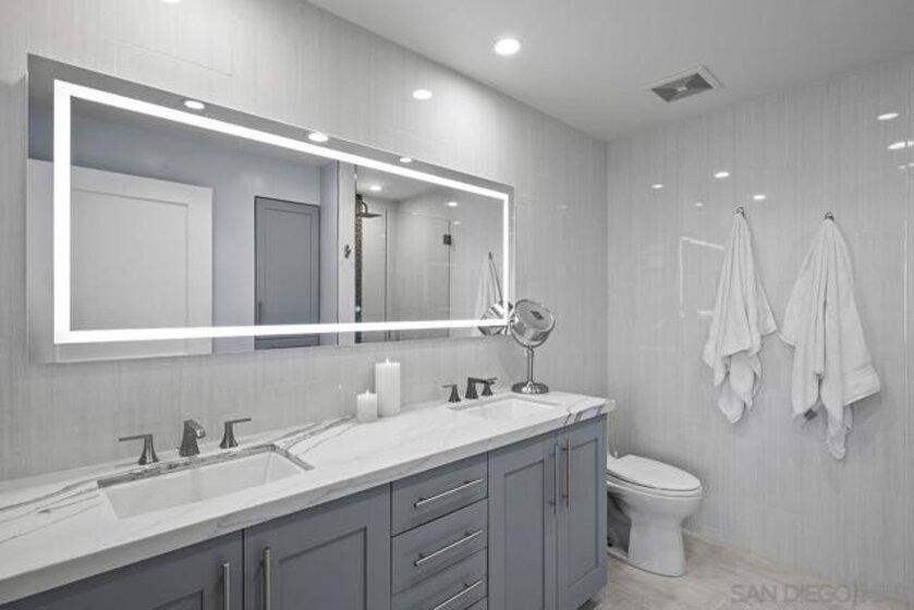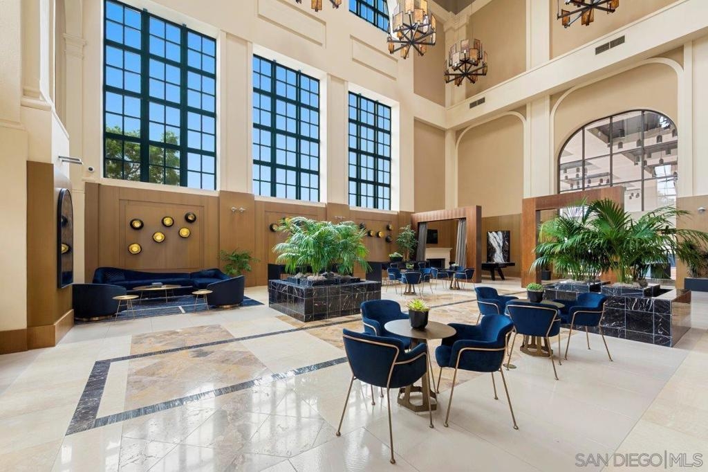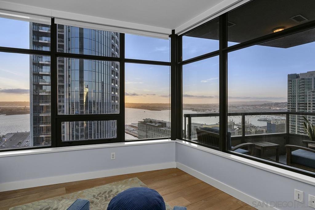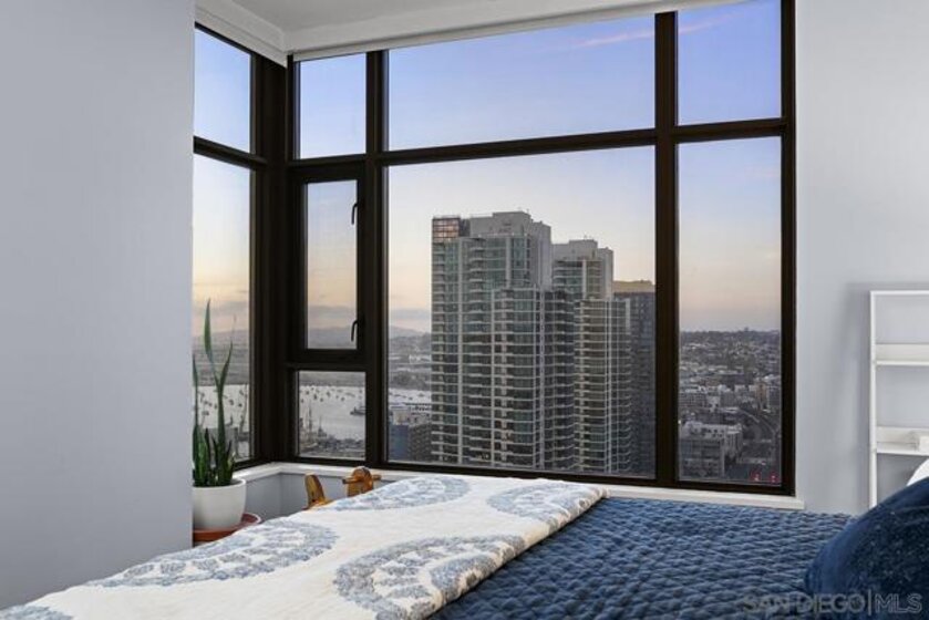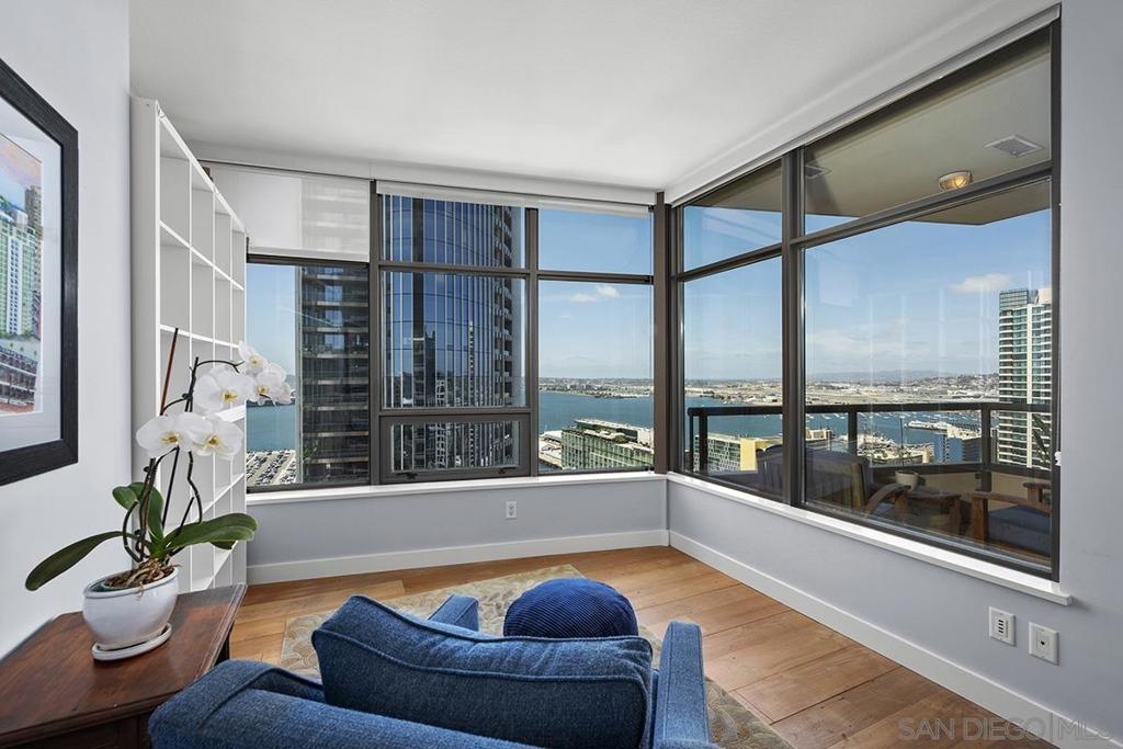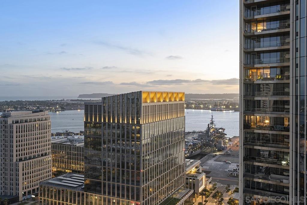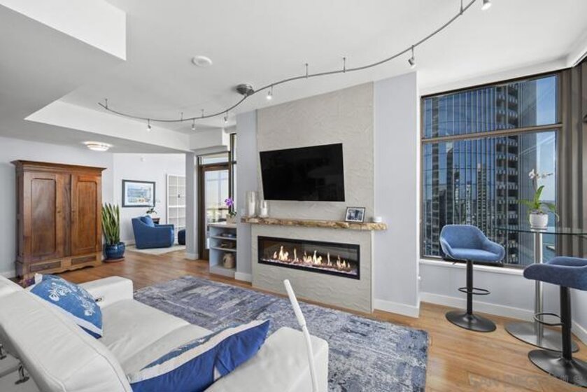 Come experience true high-rise living in one of only two residences with this coveted floor plan at Electra. Perched on the 29th floor, this fully reimagined northwest corner home captures sweeping views of the bay, Point Loma, and the sparkling city skyline from every room. A private balcony sets the stage for unforgettable San Diego sunsets. Thoughtfully redesigned for both style and function, the residence showcases wide-plank reclaimed teak flooring, a sleek linear fireplace with stone surround, and a striking petrified wood mantel. The open-concept kitchen is a true standout created for those who love to cook and features a Wolf range, built-in Sub-Zero refrigerator, Miele dishwasher, beverage chiller, quartz countertops, farmhouse sink, subway tile backsplash, and a custom glass-front display cabinet. Wake up to blue water views in the serene primary suite, complete with a spa-inspired ensuite bath offering dual vanities, a modern LED mirror, and a step-in shower. The versatile second bedroom, currently styled as a den/office, retains its closet and can easily be converted back to a full bedroom. The guest bath has also been tastefully upgraded with quartz surfaces and new cabinetry. Additional highlights include side-by-side parking on P1 with EV charging and dedicated storage on the same level. Ideally located in the vibrant Columbia District, you’re just moments from Waterfront Park, Little Italy, and Seaport Village. Rarely does a home combine this level of design, location, and view come along often so don’t miss your opportunity. Offering a fabulous location in the coveted Columbia District, you will love being only a short walk to Waterfront Park, Seaport Village, The Headquarters, and the brand-new Rady’s Shell at Jacobs Park, a unique live music venue and home of the San Diego Symphony! Also enjoy proximity to the future life science and biotechnology research development The Research and Development District (The RaDD) at the Embarcadero and the sustainable tech-focused Horton Plaza Redevelopment in the center of the city. Electra has the unique distinction of being built around the historical 1928 SDG&E Station B. Residents can take advantage of an array of services including a concierge, security, and guest parking spaces available by reservation through a simple mobile app. Unwind and relax in the steam room or sauna, resort-style pool and spa, fitness center, and Electra Park on the 5th floor surrounded by lush landscaping and a romantic outdoor fireplace and top-of-the-line barbecues.