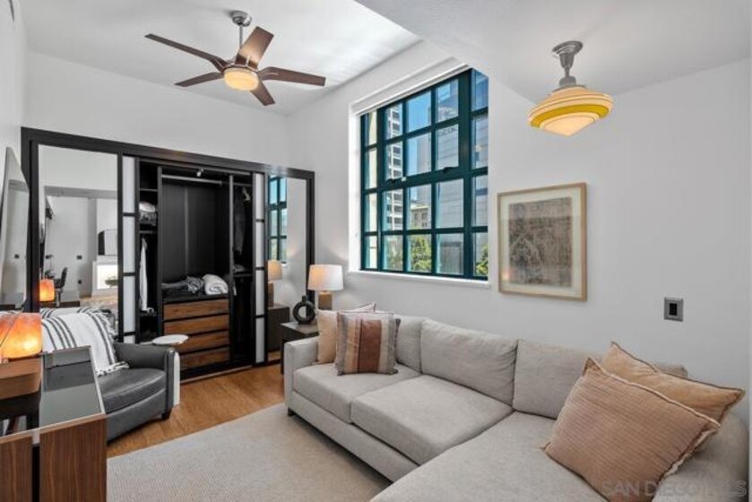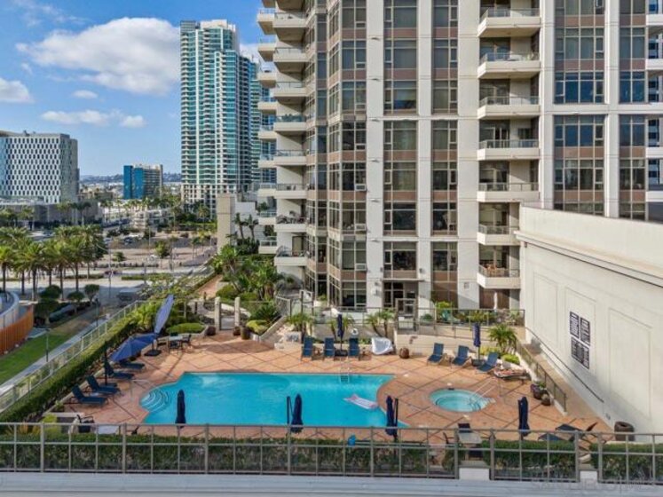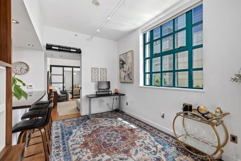 1-bedroom, 1-bath condo at Electra, one of downtown San Diego’s most iconic and historic high-rise residences. With 656 sq. ft. of living space, soaring ceilings, and an open floor plan, the unit feels bright, airy, and inviting from the moment you step inside. The kitchen features granite countertops, a breakfast bar perfect for seating, and a clear view into the spacious living and family room. Premium appliances include a large GE refrigerator, Bosch oven and dishwasher, and a 4-burner gas stove. The bathroom is finished with elegant travertine, while hard-surface flooring flows throughout the home. Additional highlights include a newer stacked washer and dryer, and the option to purchase the unit fully furnished for a turnkey move-in. Unit has 1 assigned parking space in parking garage. Electra offers a prime downtown location with easy access to Little Italy, the Harbor, Marina District, and the Gaslamp Quarter. Residents enjoy resort-style amenities including a luxurious social lounge, a stunning atrium with soaring 60-foot ceilings, pool, spa, fitness center, steam room, sauna, BBQ area, lush garden spaces, and 24-hour security. This is your chance to experience natural light, modern comfort, and timeless elegance in one of San Diego’s most sought-after towers.