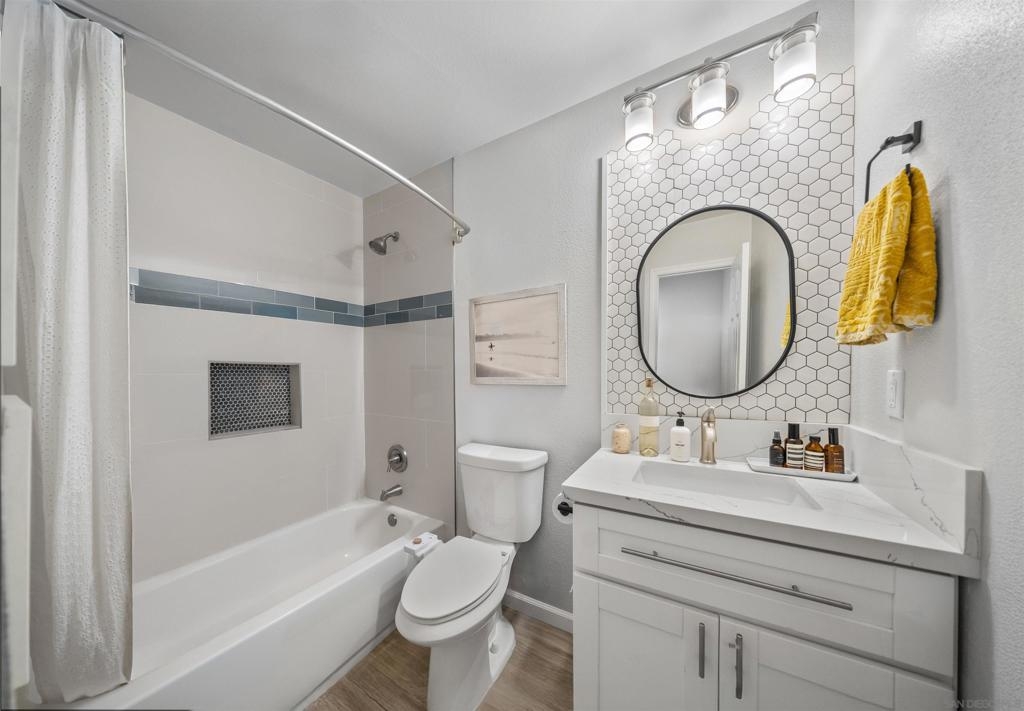 A rare opportunity to own in the Genesee Highlands community of University City. Step into this thoughtfully updated townhome, which blends warm natural textures with a clean, contemporary aesthetic. The inviting living space features modern plank flooring, shiplap walls, and curated design elements that offer both comfort and sophistication. The kitchen is stylish and functional with custom backsplash tile, quartz countertops, and an open layout ideal for entertaining. A remodeled bathroom, ample storage, and two designated parking spaces—one covered, one uncovered—add to the home's convenience. Enjoy your own private and serene backyard patio, with direct access from your covered parking space for added ease. Resort-style amenities include a community pool, playgrounds, picnic areas, and beautifully maintained greenbelts. Ideally located just minutes from UCSD, UTC Mall, and the new trolley line, and with quick access to the 5 and 805 freeways, this home offers unmatched connectivity to everything San Diego has to offer. The unit also benefits from its proximity to Cargill Avenue, which provides ample open street parking—making it exceptionally easy for guests to visit, a rare perk in San Diego. For a beautiful and brief video presentation of this property and its surrounding amenities, be sure to scan the QR code on display when visiting the property.