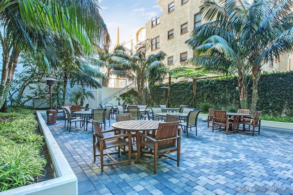 Discovery at Cortez Hill offers premium amenities including concierge service, 24-hour security, and a stunning rooftop deck with a lap pool, jacuzzi, cabanas, fire pits, BBQs, and panoramic views of San Diego. This freshly painted, 2-bed, 2-bath ground-level condo features brand-new carpet and combines downtown convenience with peaceful, residential living—perfect for families, pet owners, or anyone who prefers easy, stair-free access. Unlike many upper units that get full sun exposure and heat up quickly, this home enjoys natural shade and minimal direct sunlight, helping it stay cool and comfortable in the summer without running the A/C all day. Step outside to a rare, oversized private patio that opens to a lush community terrace—creating a serene, open-air feel rarely found in the city. The unit is also just steps from the building’s business center, library, and shared patio. Located just minutes from Balboa Park, Little Italy, and downtown—but tucked away in one of the city’s quietest, most desirable neighborhoods. Extremely dog-friendly, with one assigned parking space (G306) conveniently located near the entry gate and elevator.