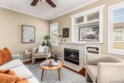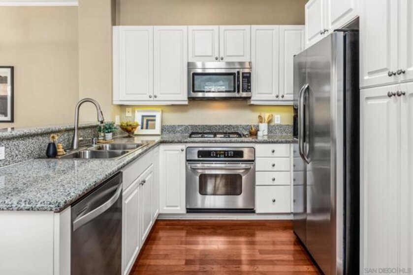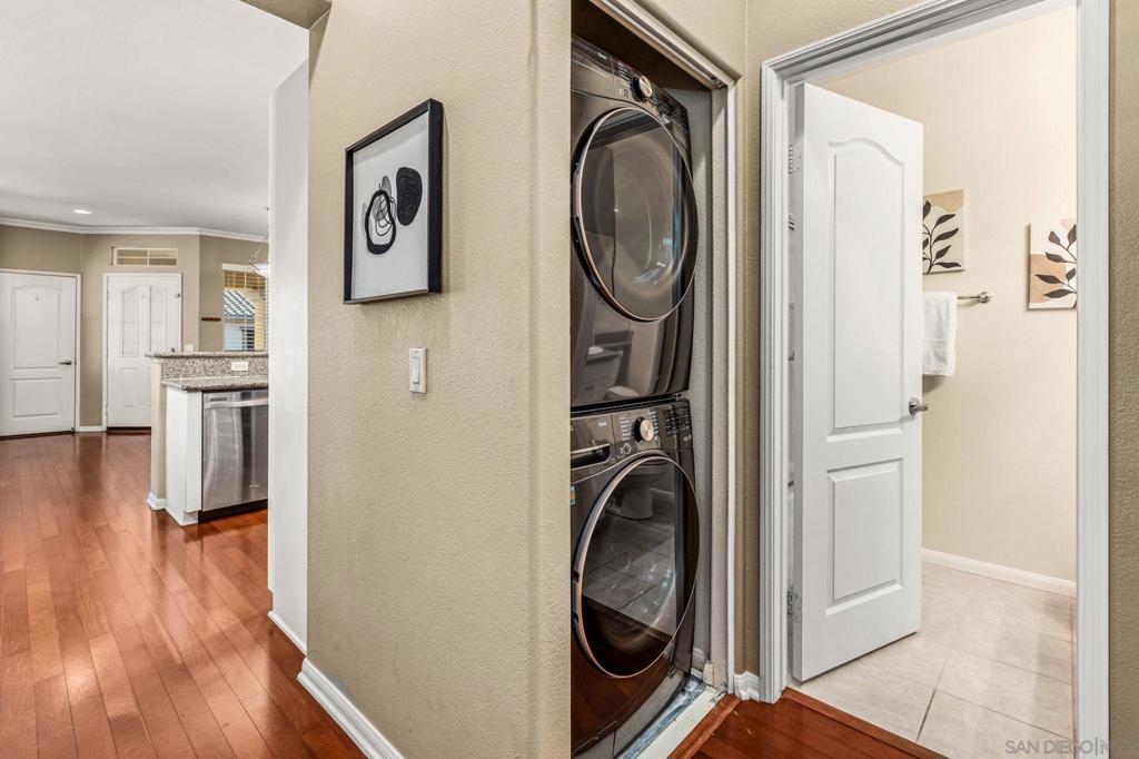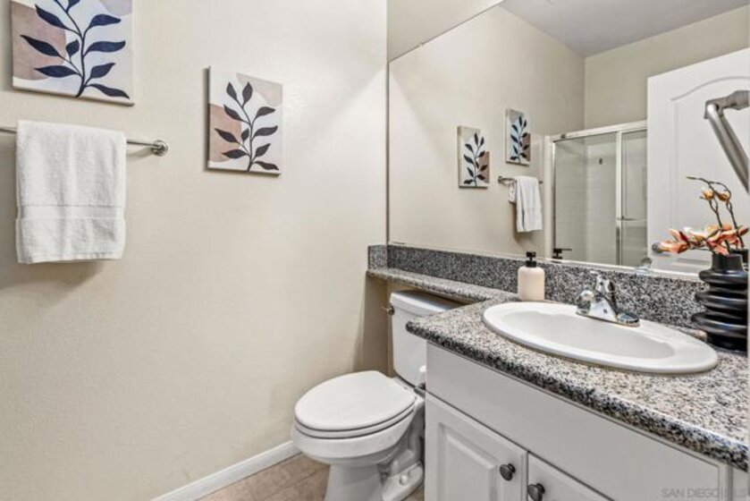 Highly updated Savannah Terrace condo in desirable Sabre Springs with stylish upgrades throughout. Features include wood flooring, stainless steel appliances, gas range, an electric fireplace, recessed lighting, new carpet in the bedrooms, and ceiling fans for added comfort. This HOA is VA approved! The spacious primary suite offers a relaxing retreat, while central A/C and full-size in-unit laundry (w/gas dryer) add everyday convenience. Enjoy the private, spacious balcony - perfect for morning coffee or unwinding at the end of the day. A detached one-car garage with built-in storage is located directly below the unit, offering both privacy and convenience. Savannah Terrace features a spacious, beautifully maintained community setting with abundant greenery and mature foliage throughout. Resort-style amenities include a swimming pool, hot tub, tennis court, basketball half-court, racquetball court, social lounge, outdoor BBQ area, library, children's playroom, and convenient guest parking.